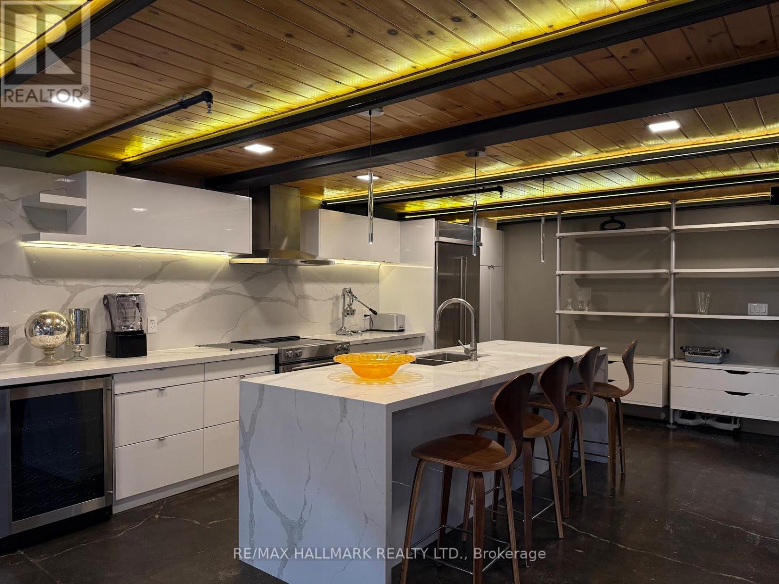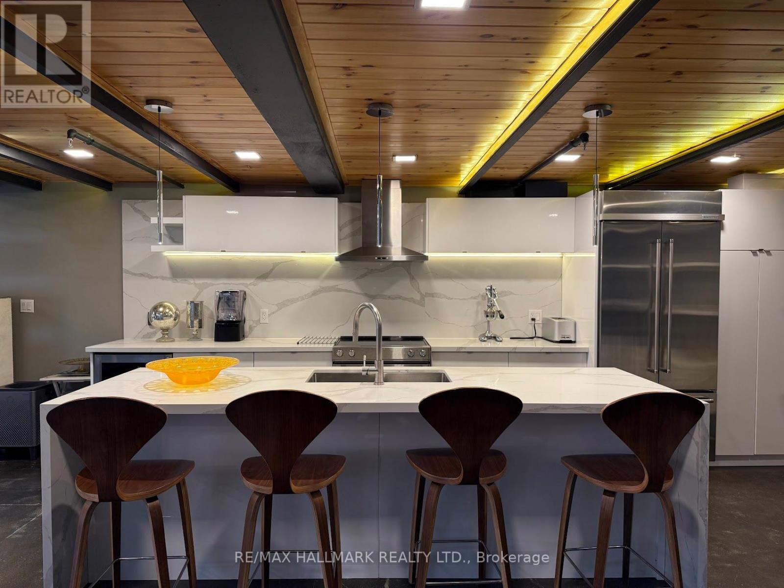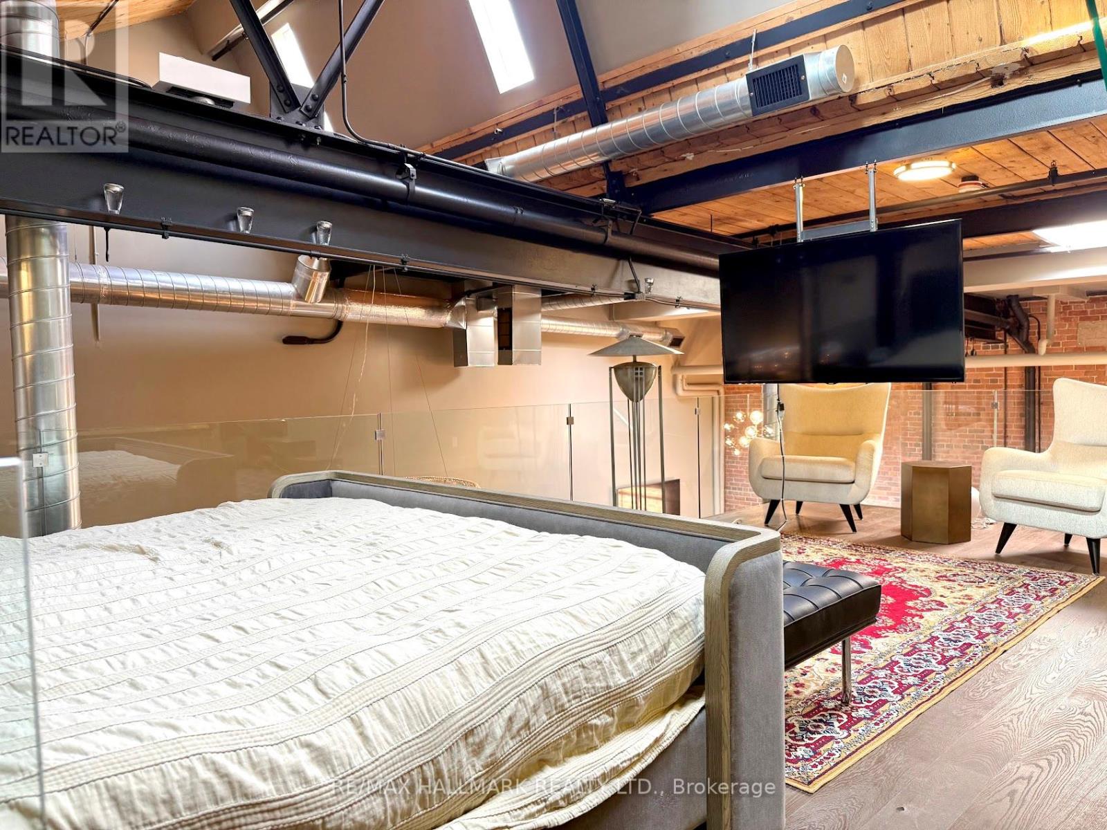 Rare opportunity to lease a fully furnished loft in Leslieville's iconic I-Zone. Offering 2,329 sq ft of living space with soaring timber & beam ceilings peaking at nearly 25 ft, exposed brick, polished concrete floors, and a private 375 sq ft rooftop terrace, this authentic hard loft is truly one-of-a-kind! The chef-inspired kitchen showcases quartz counters, oversized island, and a full suite of top-of-the-line KitchenAid appliances including large oven/stovetop, double-door fridge, wine fridge, and whisper-quiet dishwasher. The open layout flows seamlessly between dining and living spaces while skylights flood the loft with natural light. Every furnishing and finish has been thoughtfully selected: Restoration Hardware dining set, bed, storage units and mirrors, Elte armchairs and coffee tables, hand-knotted Persian rugs, solid rosewood entry chest, and crystal decanters. Essentials are all included, linens, bedding, cutlery, plates, cookware, Breville automatic toaster, Blendtec industrial blender, and Coway Airmega air purifier sized for the entire loft. Simply turn the key and enjoy immediate high-end living. The main level includes a spacious second bedroom, three-piece bath with glass shower, and expansive living areas. The upper-level primary suite offers custom closets and a spa-like six-piece ensuite. This loft comes with a dedicated private underground parking spot. Located in a vibrant, creative hub steps to Queen St Easts trendy restaurants, cafes, galleries, parks, fitness studios, and transit, with quick access to the DVP, Gardiner, and Lakeshore. A rare offering, this is loft living at its absolute best! (id:64974)