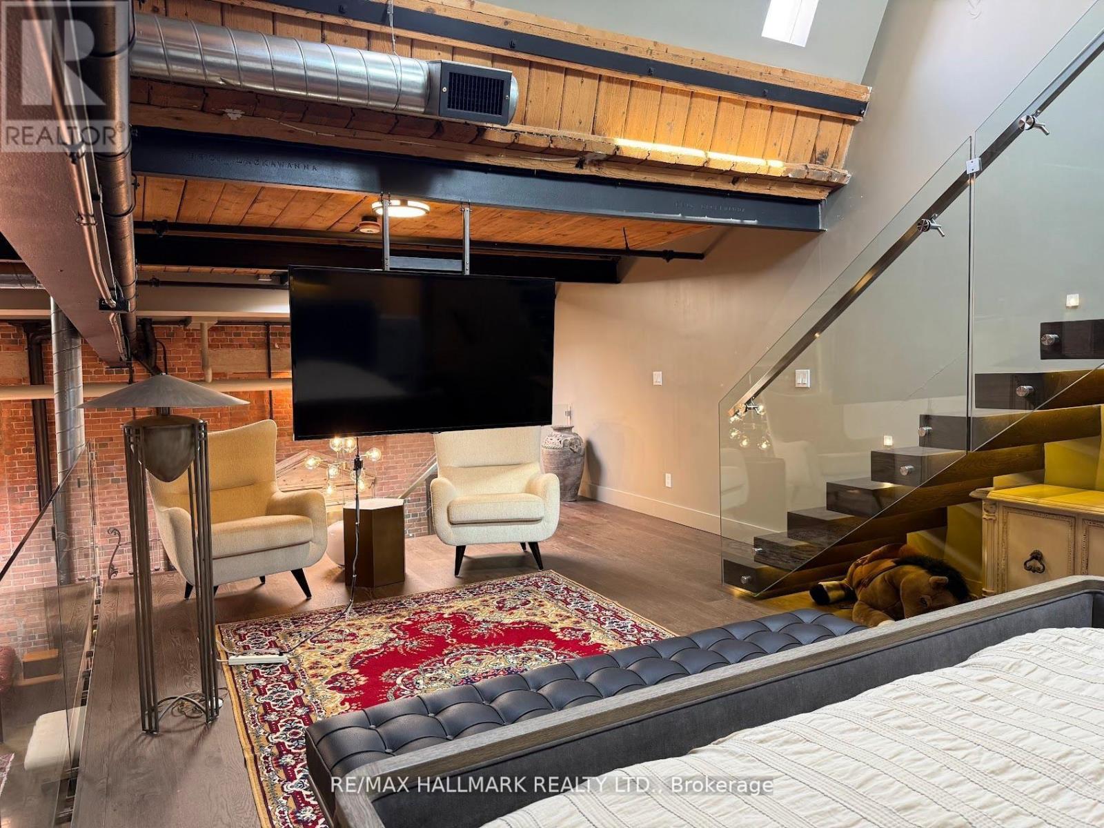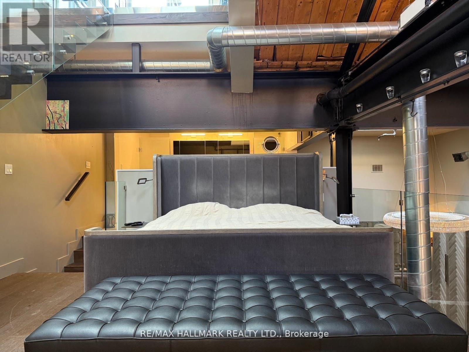 Rare opportunity to lease a fully furnished loft in Leslieville's iconic I-Zone. Offering 2,329 sq ft of living space with soaring timber & beam ceilings peaking at nearly 25 ft, exposed brick, polished concrete floors, and a private 375 sq ft rooftop terrace, this authentic hard loft is truly one-of-a-kind! The chef-inspired kitchen showcases quartz counters, oversized island, and a full suite of top-of-the-line KitchenAid appliances including large oven/stovetop, double-door fridge, wine fridge, and whisper-quiet dishwasher. The open layout flows seamlessly between dining and living spaces while skylights flood the loft with natural light. Every furnishing and finish has been thoughtfully selected: Restoration Hardware dining set, bed, storage units and mirrors, Elte armchairs and coffee tables, hand-knotted Persian rugs, solid rosewood entry chest, and crystal decanters. Essentials are all included, linens, bedding, cutlery, plates, cookware, Breville automatic toaster, Blendtec industrial blender, and Coway Airmega air purifier sized for the entire loft. Simply turn the key and enjoy immediate high-end living. The main level includes a spacious second bedroom, three-piece bath with glass shower, and expansive living areas. The upper-level primary suite offers custom closets and a spa-like six-piece ensuite. This loft comes with a dedicated private underground parking spot. Located in a vibrant, creative hub steps to Queen St Easts trendy restaurants, cafes, galleries, parks, fitness studios, and transit, with quick access to the DVP, Gardiner, and Lakeshore. A rare offering, this is loft living at its absolute best! (id:64974)