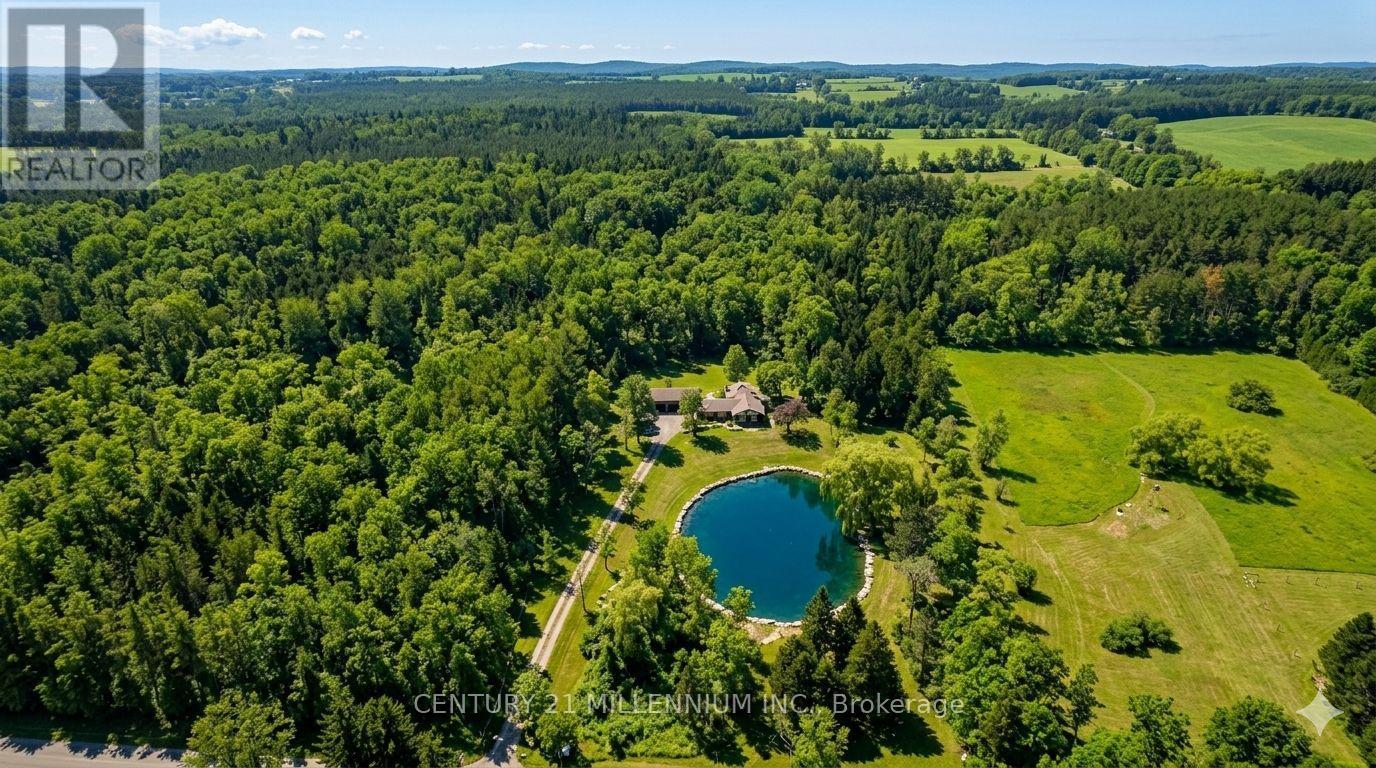 Private Waterfront Oasis on 5 Acres, 15 Minutes from 401, Experience ultimate privacy at this stunning 5-acre country estate with a 3 Car Garage, accessed via a long paved driveway. Surrounded by mature forest and centered around a massive private pond, this property offers a true "waterfront" lifestyle. This meticulously maintained back-split waterfront home features: 3 + 2 Bedrooms and 3 Bathrooms, Eat-In Kitchen with Stainless Steel Appliances, Hardwood Flooring, Picture Window overlooking large Pond. Walk Out from Kitchen to a Deck with views of Pond and Forest. Living Room with cozy Fireplace, Hardwood Flooring, Crown Molding, View of Pond and Sliding Door to Back Yard with Forest View. Dining Room with Laminate Flooring, Crown Molding and views of the Pond. Foyer with Ceramic Tile Flooring and a door for Front and a door for Back Yard with a short paver stone walkway to a detached 3 Car Garage with 3 new Garage Doors. Second Floor with Primary Bedroom with 2 Pc Ensuite and 2 other Bedrooms and 4 Pc Bathroom. Lower level has a Finished Walk Out Family Room with a Wood Stove, Bedroom and 3 Pc Bathroom that could be used as an In-Law Suite. Basement with a Bedroom, Laundry and Utility Room with Cost Saving Geothermal Furnace for Heating and Cooling. Ultra high-Speed FIBER OPTIC Internet, Rooftop Solar Panel System with Microfit Contract till 2031 with average $5,000 Income per year. Large Pond has been used for Swimming, Paddle Boarding and Fishing. Roof replaced in 2016 with 30 Year Shingles. Perfectly situated close to Milton, Guelph, Georgetown, Acton, Brampton and 401 HWY. A MUST SEE! (id:64974)