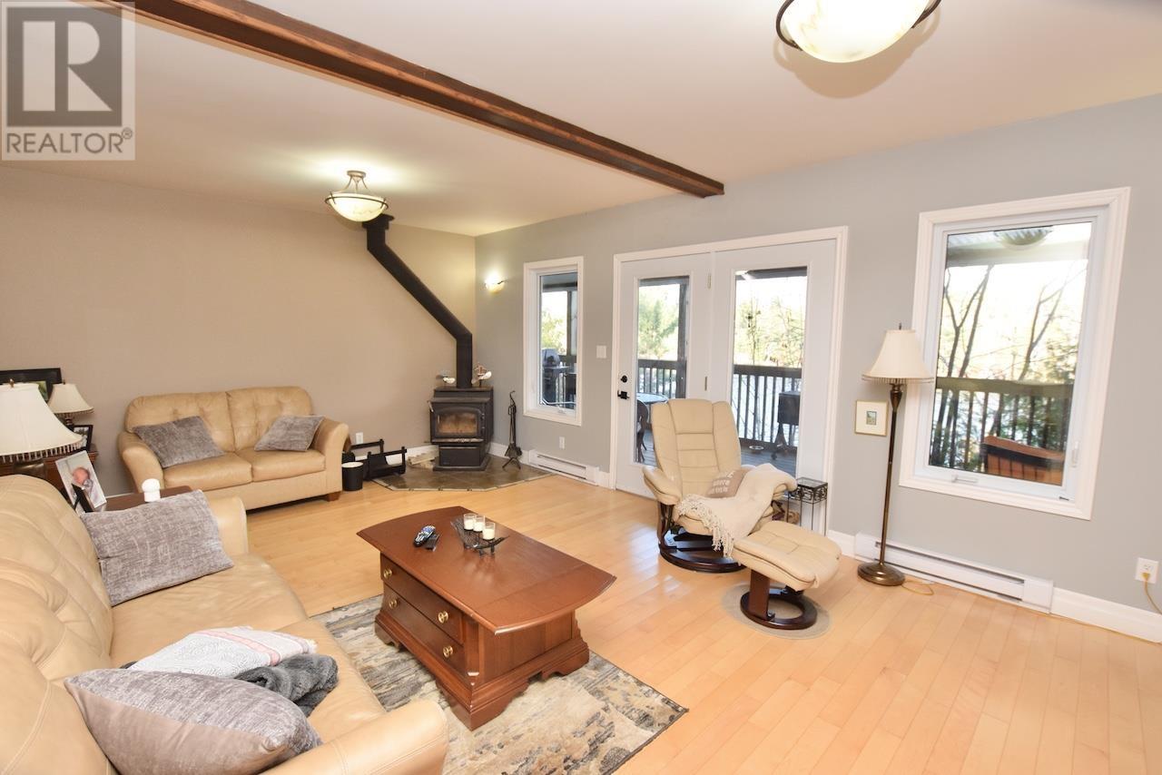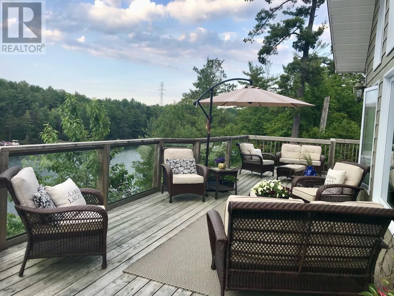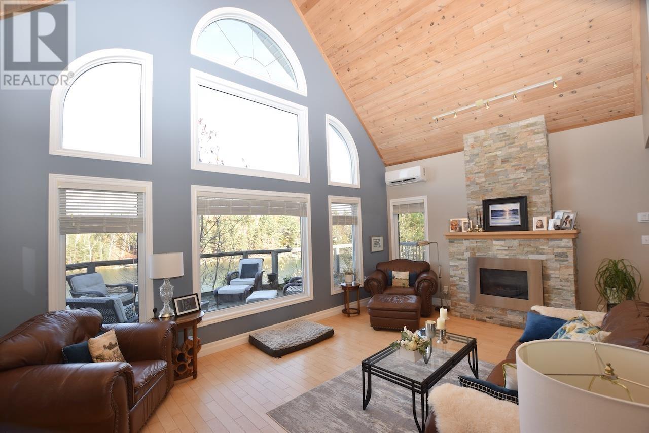 This waterfront home with over 2400 sq. ft. living space on sought after 5000+ acre trout and muskie fishing class Lake Lauzon, Ontario, CANADA offers a harmonious blend of modern comfort and rustic charm. Spread across three floors, this home features an open concept design, connecting the kitchen, dining, and living areas. Vaulted ceilings with wooden beams add character and spaciousness, while large windows flood the interiors with natural light and offer scenic views. The kitchen is equipped with light wood cabinetry, stainless steel appliances, an eat-in area next to windows over looking the lake all perfect for casual dining or food preparation. The living/dining area showcases a cozy gas fireplace, providing warmth and ambiance. Bedrooms are thoughtfully designed, with the primary bedroom on the main level featuring warm, earthy tones and ample storage with a walk-in closet and ensuite bathroom. Bathrooms are modern and well-appointed. Additional amenities include a home office or +1 bedroom space, recreation room, and multiple outdoor access points, including a deck area visible from the main level rooms. Hardwood flooring throughout adds to the home's overall aesthetic appeal and easy maintenance. With 4.6 acres and over 700 feet of frontage on Lake Lauzon, this is a gem of a year round home and retreat. The property includes a 24x32 detached garage, dock at the home as well as for a bonus, two rustic older cabins with a viewing deck and older dock. Everything is here and on a premium large inland lake, be sure to see the 3D virtual tour on-line plus more information including schematic floor plans is available on request. Please book site viewings at least a day in advance. (id:64974)
