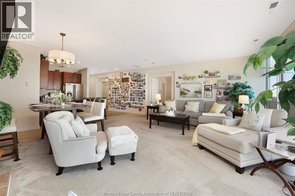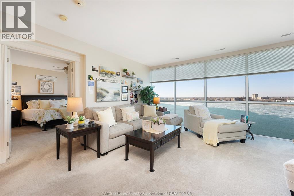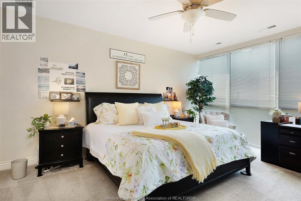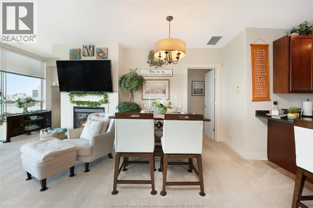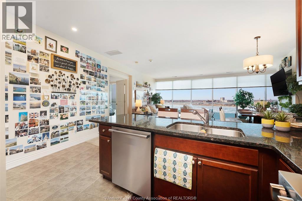 Welcome to Beautiful Portofino! This Stunning water view two bedroom, 2 bath residence with larger than average sqft of approx. 1547 sqft offers breath taking northwest views and unforgettable sunsets. This thoughtfully designed suite features water views from both bedrooms, creating a serene and light filled living experience. The stylish kitchen with granite countertops, seamlessly flowing into the open-concept living room with cozy fireplace to dining area. Perfect for both everyday living and entertaining. Spacious primary bedroom includes walk in closet and large ensuite. Step out onto your private balcony to take in the water views and evening skies. Additional highlights include in-suite laundry, underground parking, and dedicated storage locker, providing both comfort and convenience. Amenities: rooftop terrace, gym, party room, sauna, billiard room, 2 guest suites, waterfront trails for biking and walking just a few steps away. Minutes to UofW and US Border. (id:64974)
