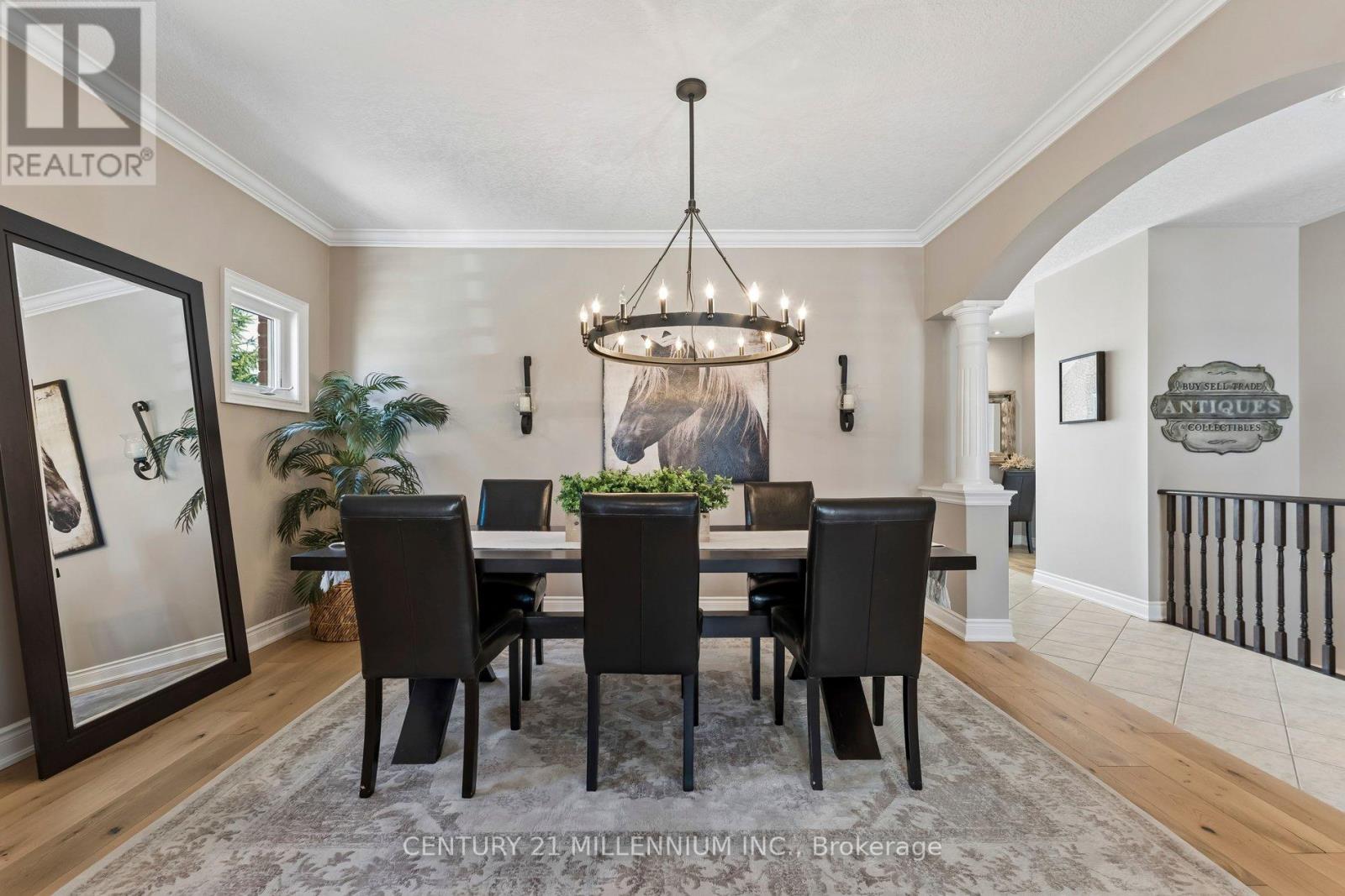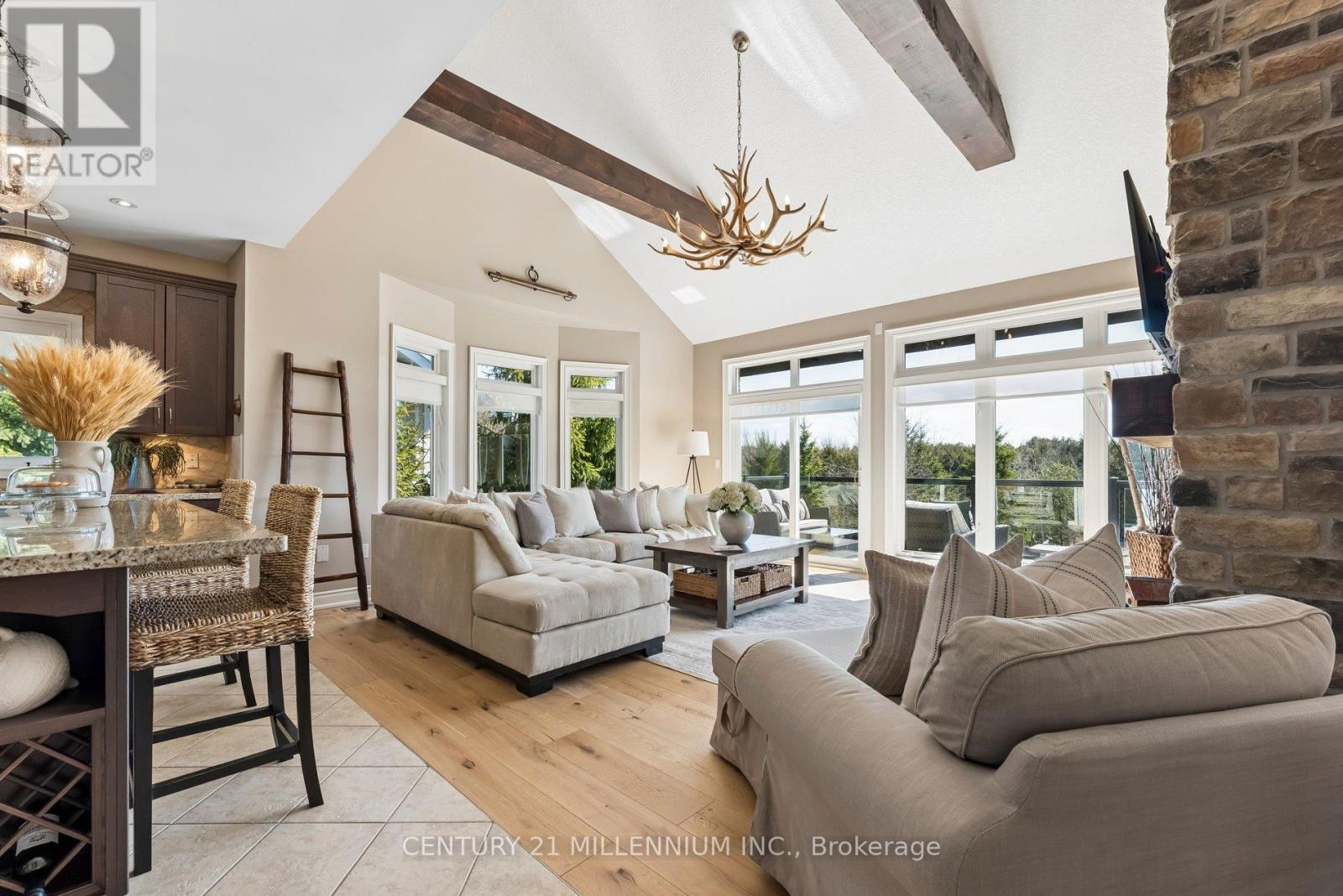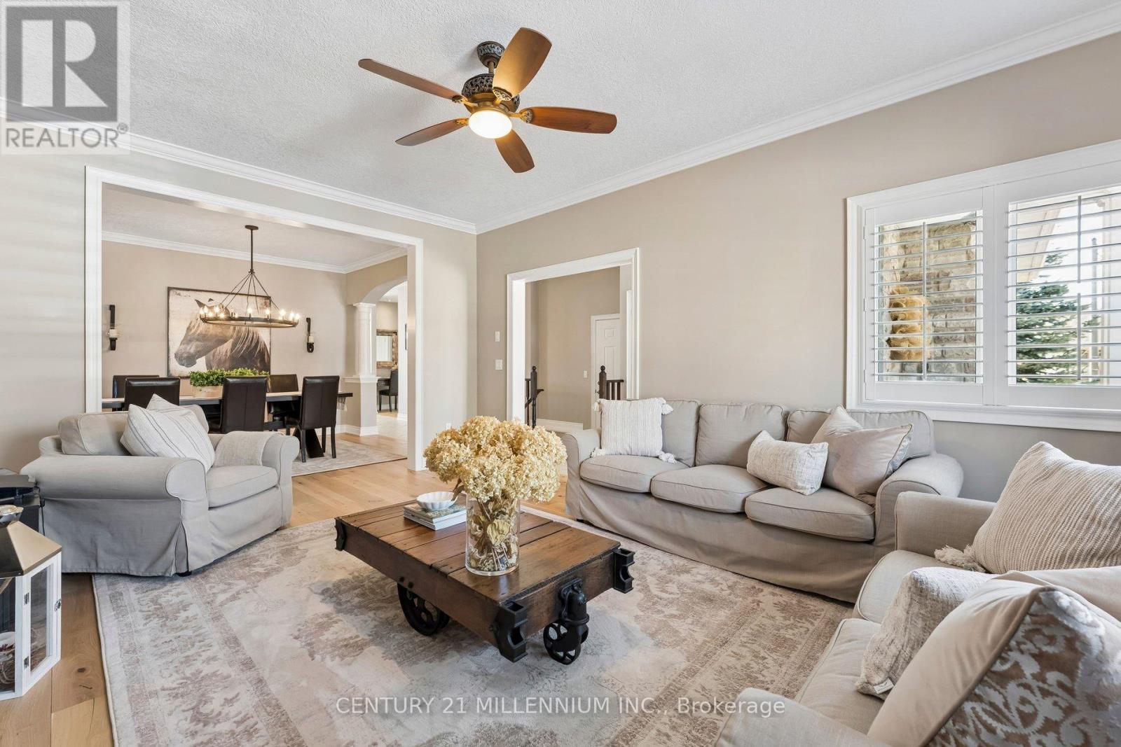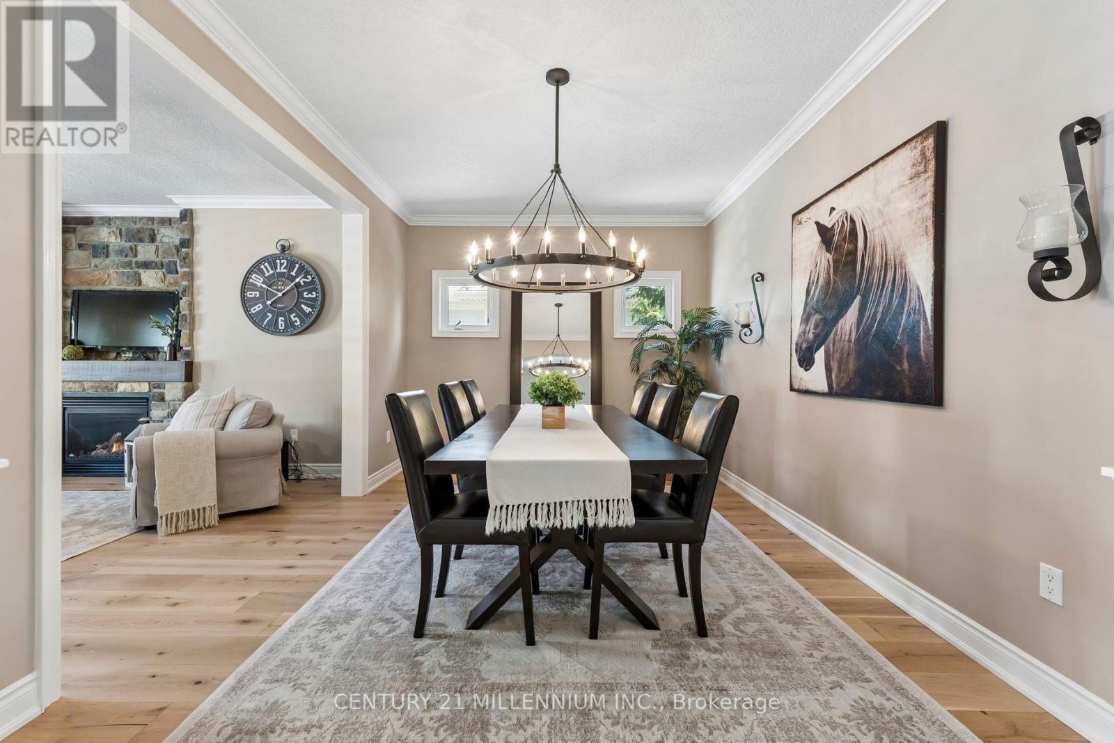 Welcome to this beautifully maintained 2+2 bedroom Strathmore Model bungalow located in the highly sought-after Watermark Adult Lifestyle Community in Mono and set on a premium ravine lot with breathtaking views over Monora Park. Offering approx. 1,983 sq ft on the main level plus a builder-finished walkout basement, this home delivers nearly 3,200 sq ft of finished living space. The main floor features 9-ft ceilings, wide-plank white oak engineered hardwood (2023), and elegant living and dining spaces with crown moulding and upgraded finishes. The stunning great room boasts vaulted ceilings, floor-to-ceiling windows with transoms, and a striking custom chandelier, creating a warm, resort-inspired feel. Two custom floor-to-ceiling gas fireplaces add both style and comfort. The upgraded kitchen offers oak cabinetry, granite counters, custom backsplash, and a functional layout. The primary suite features scenic park views and a spa-like 5-piece ensuite, while a second bedroom/office and 3-piece bath complete the main level. The bright walkout basement includes two additional bedrooms, a full bath, and a spacious open-concept living area with direct backyard access. Professionally landscaped grounds, featured in Living Spaces magazine, showcase a private backyard oasis with a water feature, stonework, and an extended deck with glass railing and retractable awning overlooking the ravine. Residents enjoy access to a private community centre with fitness, theatre, party room, and more, all steps to trails and just minutes to Orangeville amenities, Hockley Valley Resort, and Island Lake Conservation Area. (id:64974)