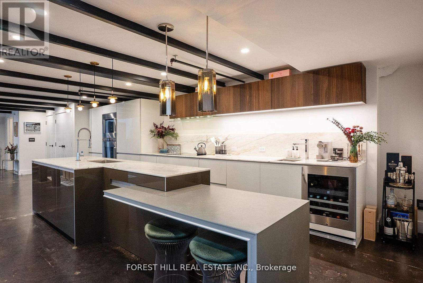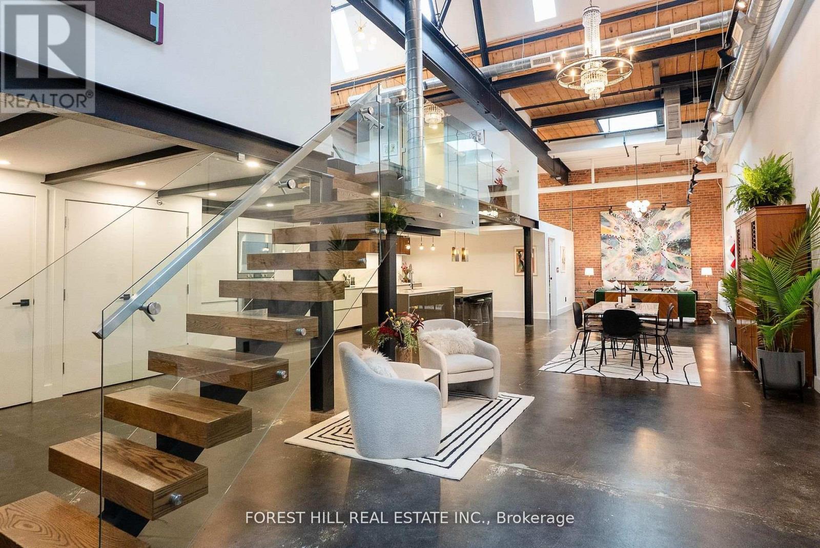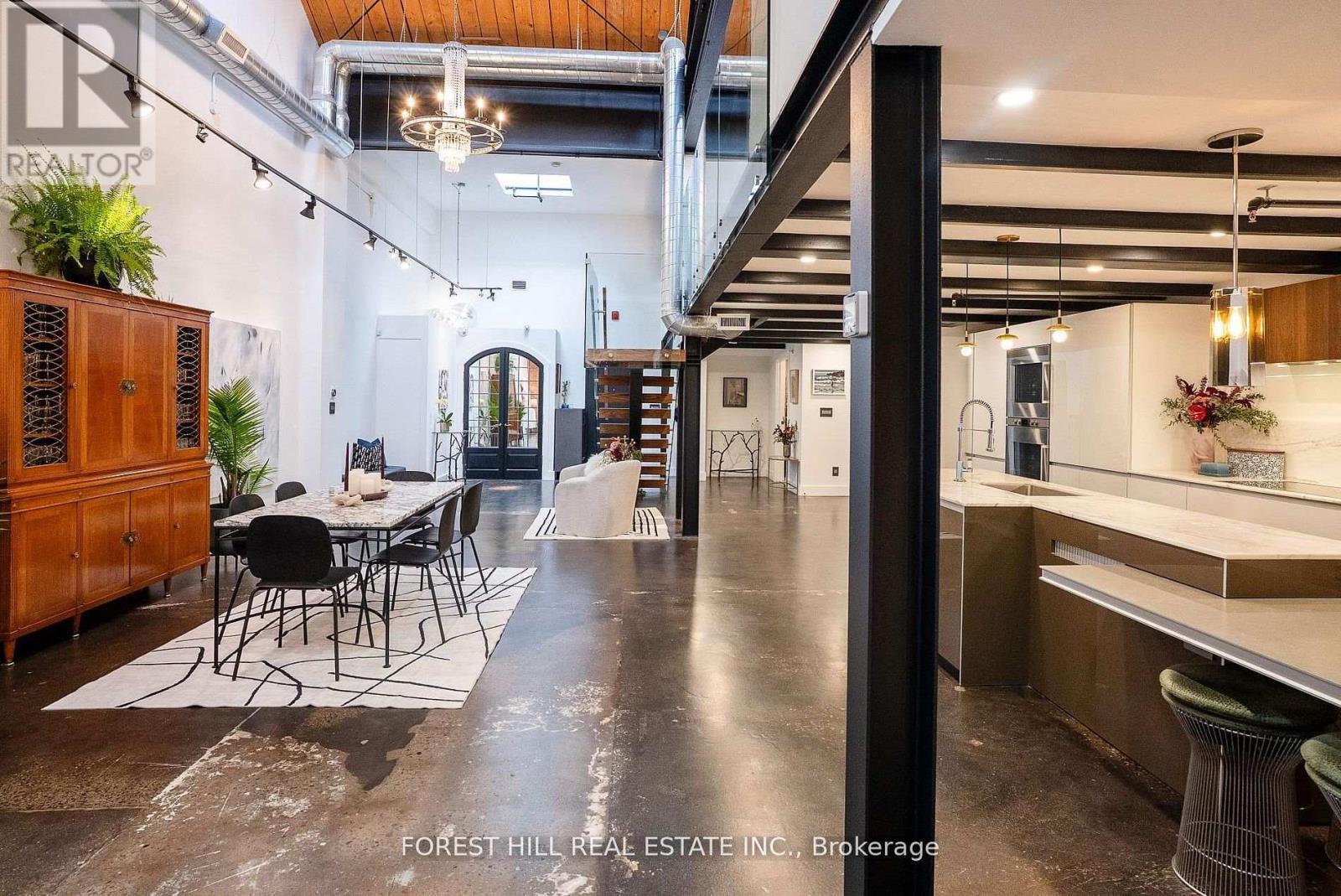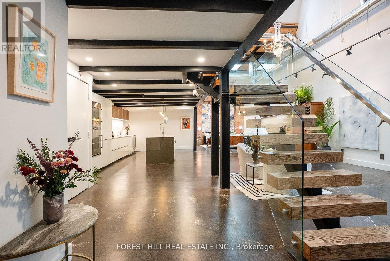 Welcome to The Gallery, a rare three-level designer loft offering over 2,500 sq.ft of interior space and a 375 sq ft rooftop terrace. This residence embodies refined urban sophistication with 26-foot ceilings, exposed brick, polished concrete floors, and gallery lighting. The Ernestomed a kitchen, with more than $150,000 in upgrades, features Gaggenau and Miele appliances, Calacatta marble, a bar sink and wine fridge. The main level showcases a Kelly Wearstler marble mosaic bathroom, combining artful design with luxurious finishes. A floating oak staircase leads to the mezzanine primary suite with herringbone floors, double sinks, and a marble walk-in shower. The private rooftop retreat offers high-end composite decking, multiple seating areas, and a custom dining table suspended over a skylight. Set in the heart of Leslieville, just one block from the new Ontario Line subway, The Gallery defines contemporary Toronto living. (id:64974)