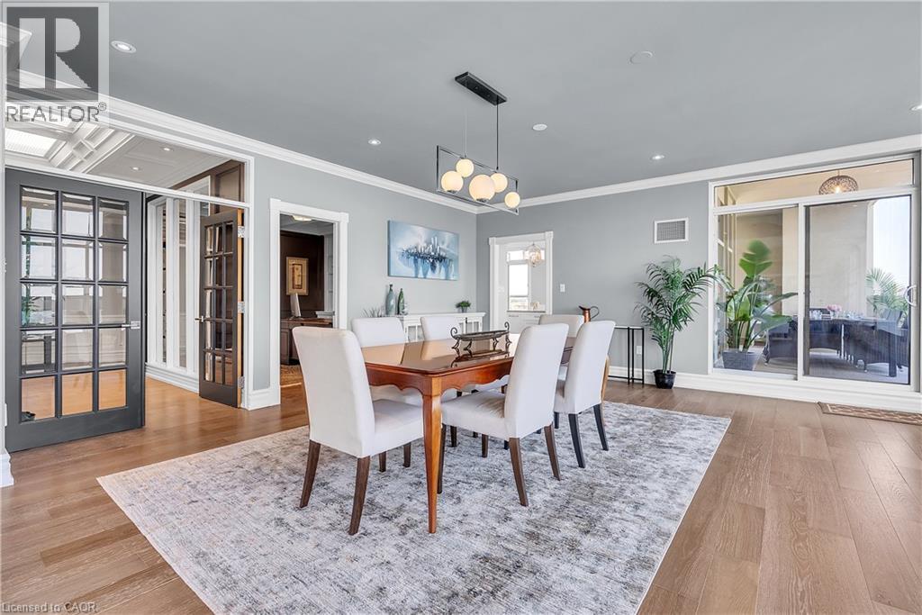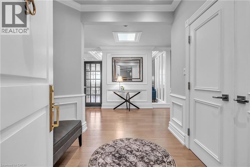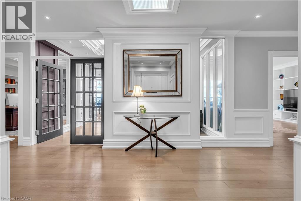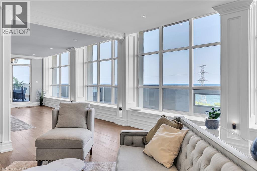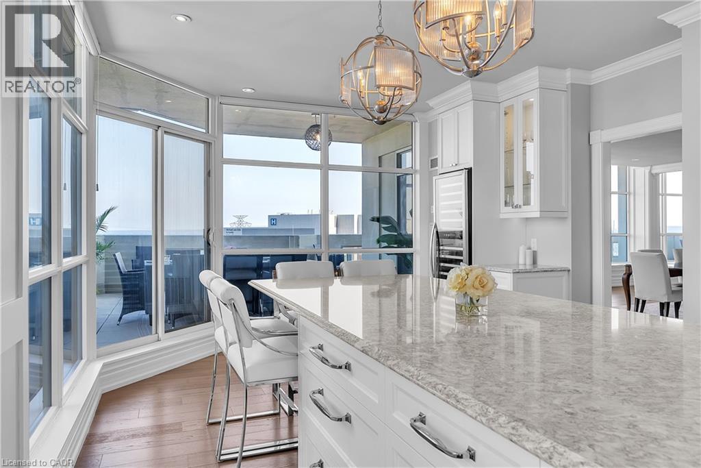 This extraordinary penthouse is the only residence on the top floor of this fabulous tower, offering unmatched privacy and exclusivity. With more than 4,000 sq ft of refined single-level living and nearly 1300 sq ft wraparound terrace, it captures breathtaking views of Lake Ontario, the Burlington skyline, and the Skyway Bridge. Through the grand unit door, the impressive entry foyer sets the tone with its skylight, custom millwork, and generous closets. Beyond, the home unfolds with soaring ceilings, engineered hardwood floors, and luminous natural light streaming through walls of spectacular windows and multiple skylights. Expansive principal rooms flow seamlessly, ideal for both grand entertaining and intimate everyday living. The open-concept living and dining areas are complemented by a fireplace and sophisticated wet bar, and offer easy access to the terrace for effortless indoor-outdoor living. The gourmet kitchen blends style and function, featuring stone counters, a dining island, stainless appliances, and windows on two sides framing captivating lake views. Two sprawling, stately bedrooms each enjoy lavish ensuites, walk-in closets, and their own private terraces. A richly appointed office with custom built-ins and a skylit den with coffered ceiling add elegance and versatility. Practicality is equally considered in this exquisite home with a powder room, ample in-suite storage, a large locker, and three premium underground parking spaces. Monthly condo fees include all utilities except hydro, offering simplicity and peace of mind. The building itself is impeccably maintained, with on-site superintendent, outdoor pool, gym, party room, workshop, underground visitor parking, and a warm wood-panelled lobby. Steps from Spencer Smith Park, the waterfront, hospital, and downtown Burlington’s shops and restaurants, this remarkable residence is among the city’s most prestigious offerings. (id:64974)