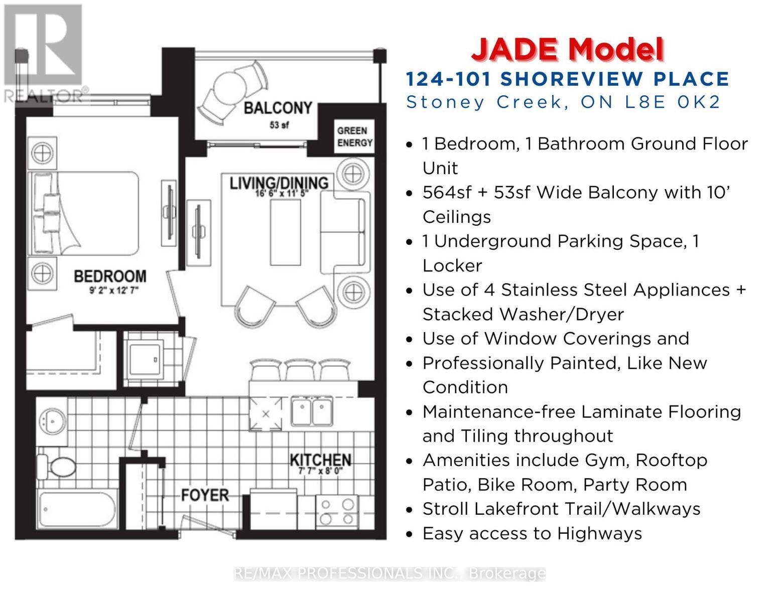 Recently built, Sapphire 2 in Stoney Creek on the banks of Lake Ontario. Stunning 1 Bedroom, 1 Bathroom Open Concept Kitchen/Living/Dining Rooms with 4 piece Bath and Ensuite Laundry. Tall 9' ceilings throughout unit. Located on the Ground Floor with no need for the elevator. Unit features maintenance-free flooring with a combination of ceramic tiles and laminate floors throughout - No carpet! Just Professionally painted throughout - Like NEW! Comes with privacy sheers and room-darkening/blackout curtains. Unit is in excellent condition. Steps to the scenic pathways and public beach of Lake Ontario. Comes with 1 underground parking space and 1 locker located in the underground parking area. Building amenities include Rooftop Patio, Party Room, Gym, Bike Room, Visitor Parking and Lobby. Excellent, professional Landlords looking for the same in tenant(s). Easy access to the 403/QEW and minutes to Hamilton or Niagara and Wine Country. The nearby GO Train will get you to Niagara, Toronto or Whitby with stops in between. Require first/last month's rent, current employment letter, references, Equifax/Transunion credit report/score, proof of insurance and $150 key/fob/garage remote deposit prior to moving in. Non-smoking/vaping unit/building as per bylaws. (id:64974)