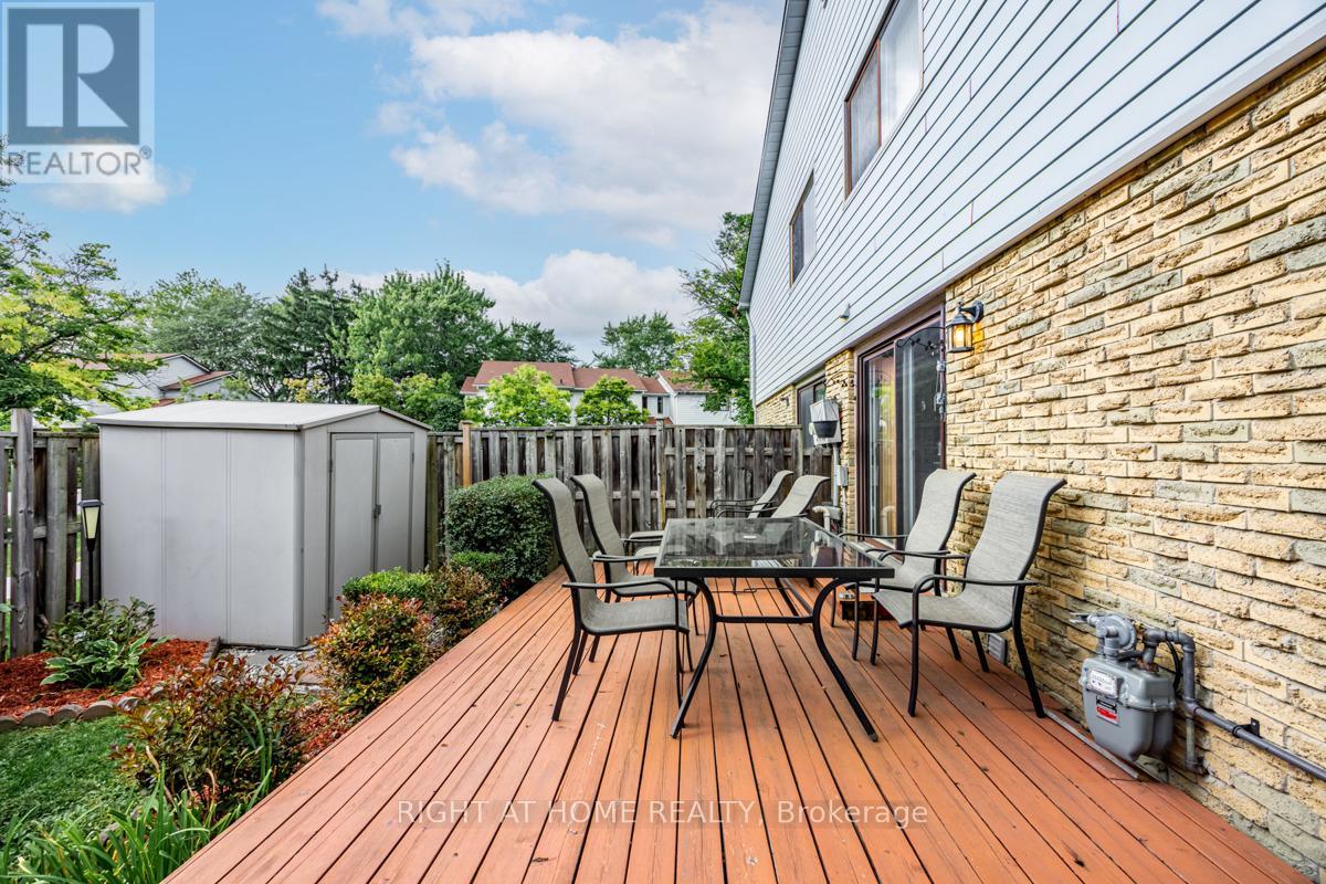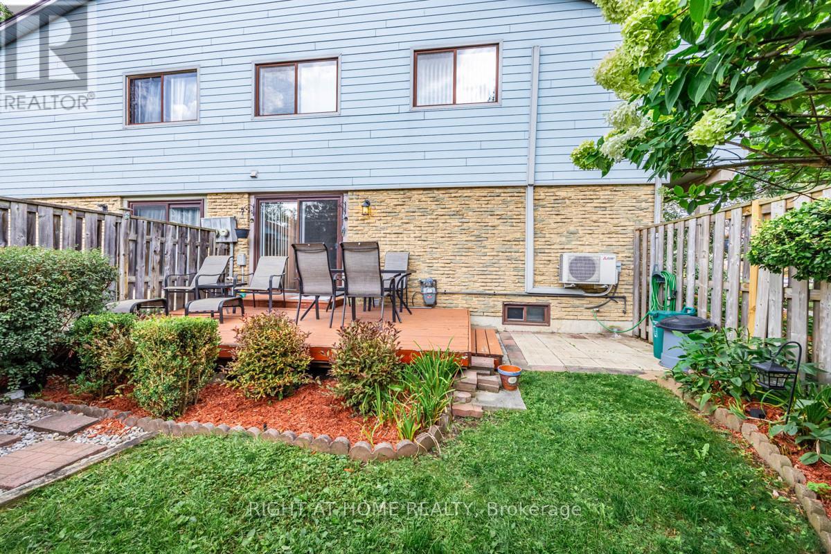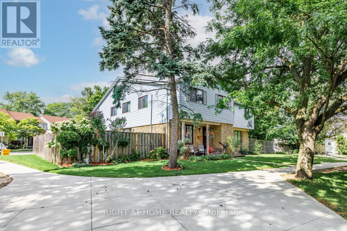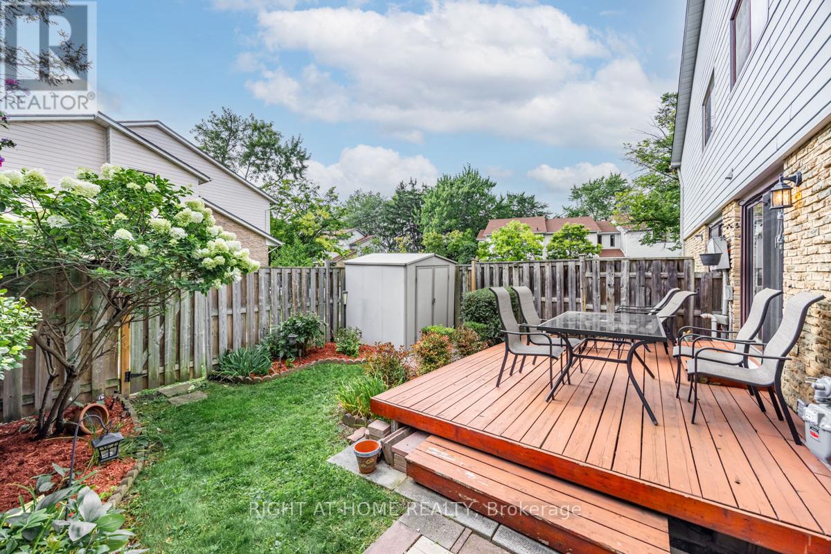 Rarely offered, End Corner Unit Townhome on Inside Quad Section, 4 bedroom model (now used as 3 with primary bedroom enlarged). Original owners, lovingly maintained, spacious layout with bright sun filled rooms, beautiful perennial gardens front and back, fenced yard, interlock front walkway, great location within complex, parking space close to unit. Main level features beautiful Hardwood Floors throughout, crown molding, walkout to sundeck from dining area through sliding glass doors, large entrance foyer with wainscoting and powder room. Updated eat-in kitchen with plenty of storage and under cupboard lighting. Oversized master bedroom with walk in closet, easy to convert back additional space to original 4th bedroom. Third bedroom features lots of built in storage for a great craft room, office or nursery. Finished basement family room with wet bar, gas fireplace as-is, large finished storage room and a pantry area with bathroom rough in. Over 2000 sq/ft of living space including basement. This 2 storey townhouse is in a wonderful family neighborhood, in the in the highly sought after Streetsville Community. Steps to Parks, Shopping, Walking Trails, Bus at your door, easy work commute close to Hwys 401 & 407, Minutes to Streetsville Go. The area complexes share Meadowvale South Rec Centre with outdoor pool, tennis/ basketball court, party room and more, lots of visitor parking. A great location for your growing family to call home. (id:64974)