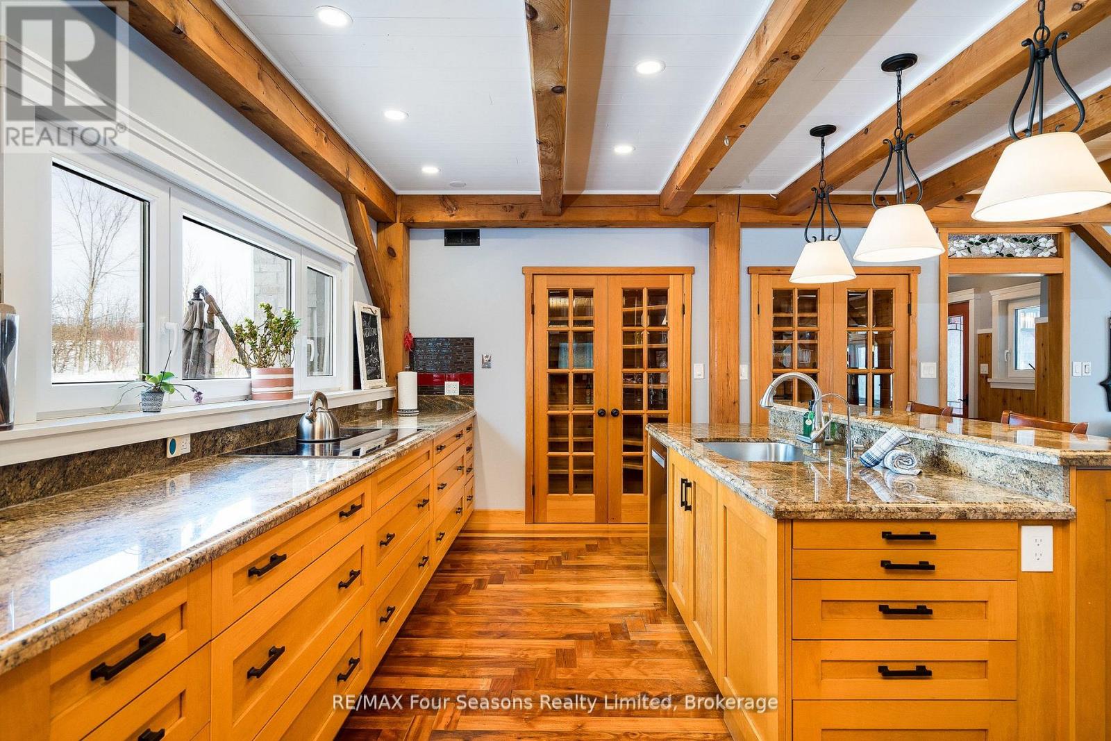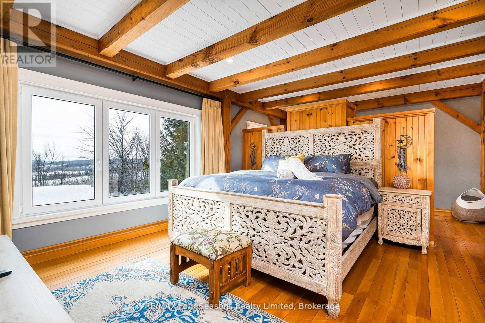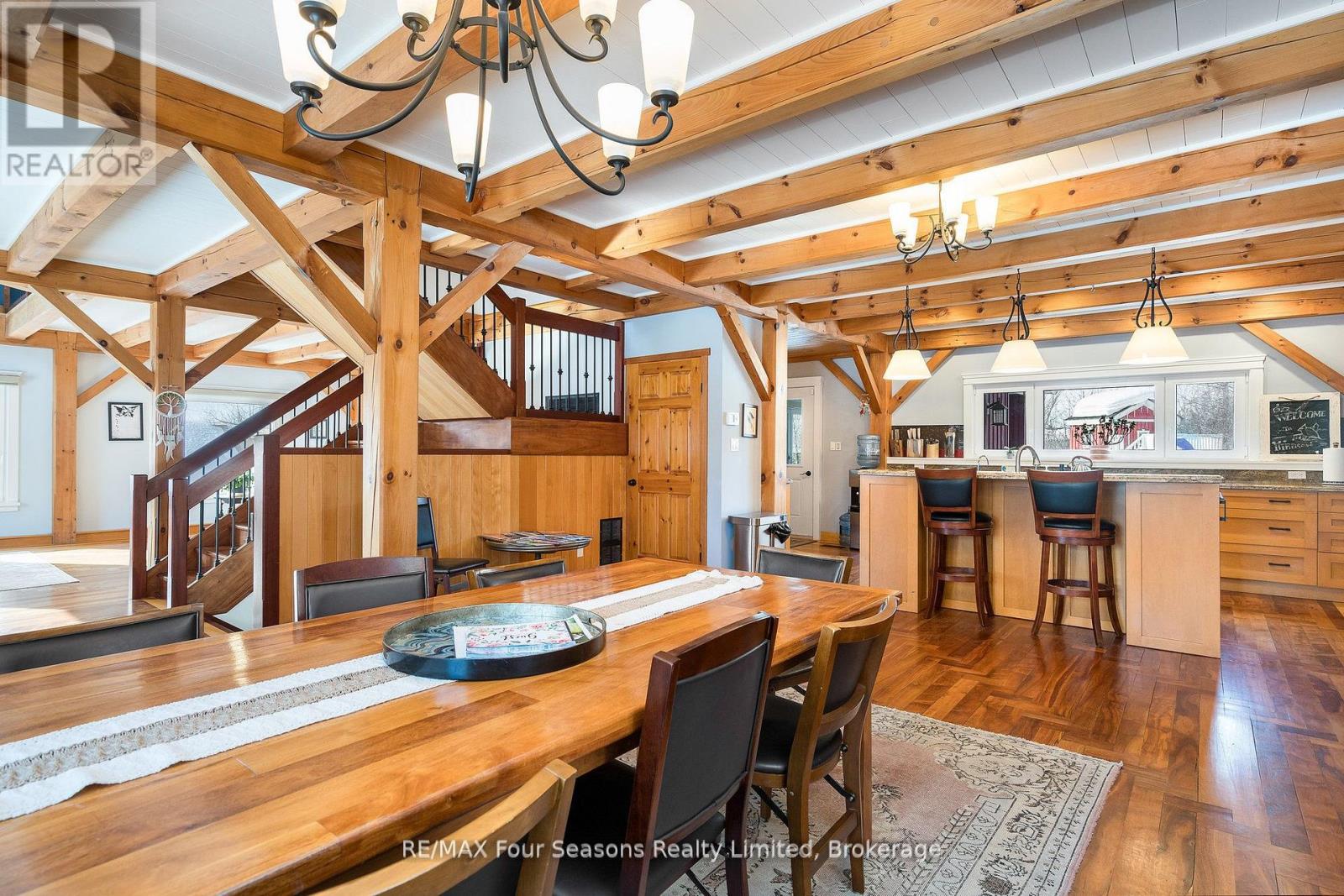 Stunning Timber Frame Estate on 2.5 Acres in Thornbury. Exceptional stone-clad timber frame residence offering approximately 6,300 sq. ft. of beautifully crafted living space, set on 2.5 private, fully landscaped acres. Designed for extended family living, entertaining, or use as a luxury short-term rental (Airbnb), this one-of-a-kind property delivers comfort, privacy, and four-season enjoyment. The maintenance-free all-stone exterior provides superior insulation and quiet durability, while the timber frame construction and South American hardwood floors add warmth and character throughout. Expansive, light-filled principal rooms create an inviting atmosphere for both everyday living and hosting larger groups. The home features 6 bedrooms and 6 bathrooms, including a primary suite and guest suite with private ensuites, offering excellent flexibility for family and guests. The chef's kitchen is complemented by a butler's pantry and separate baker's kitchen, ideal for entertaining or catering. European tilt-and-turn windows enhance energy efficiency and indoor-outdoor flow. Resort-style amenities include a 17-foot indoor swim spa and sauna, geothermal heating and cooling, and radiant in-floor heating throughout. Multiple living areas provide ample space and privacy, making the layout well suited for short-term rental use. Additional highlights include a 36' x 24' heated workshop with separate driveway, perfect for hobbies, storage, or a home business, and a 26' diameter dome greenhouse for year-round gardening. Furnishings are negotiable, offering potential for a turnkey rental opportunity. Ideally located minutes from Thornbury and Meaford, and a short drive to Blue Mountain Village and private ski clubs, this chalet-inspired estate offers an outstanding opportunity to enjoy a premium recreational lifestyle or generate income in a sought-after four-season destination. (id:64974)