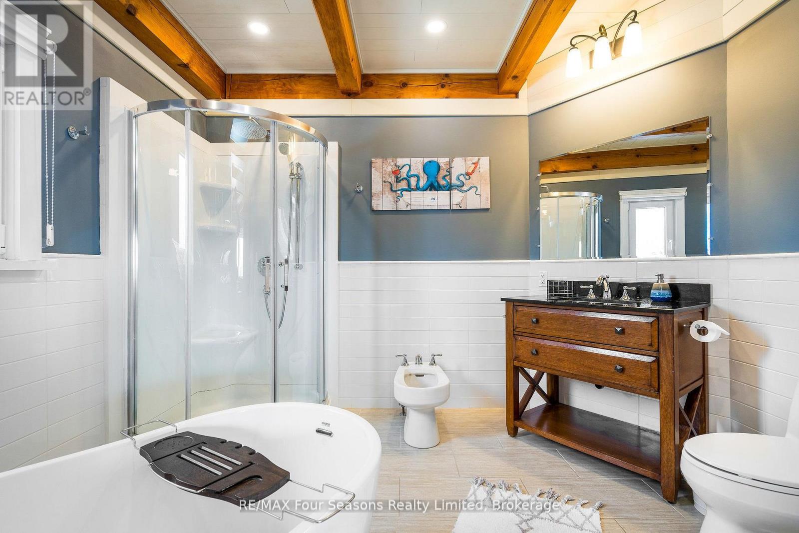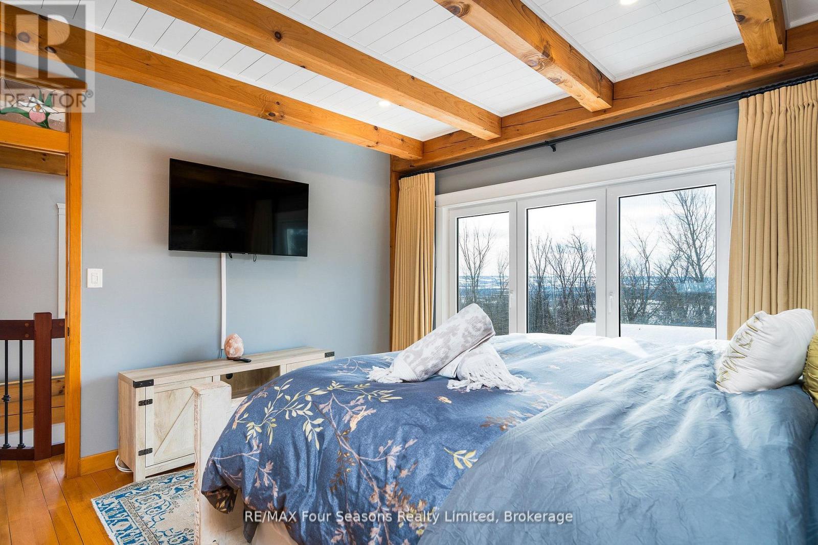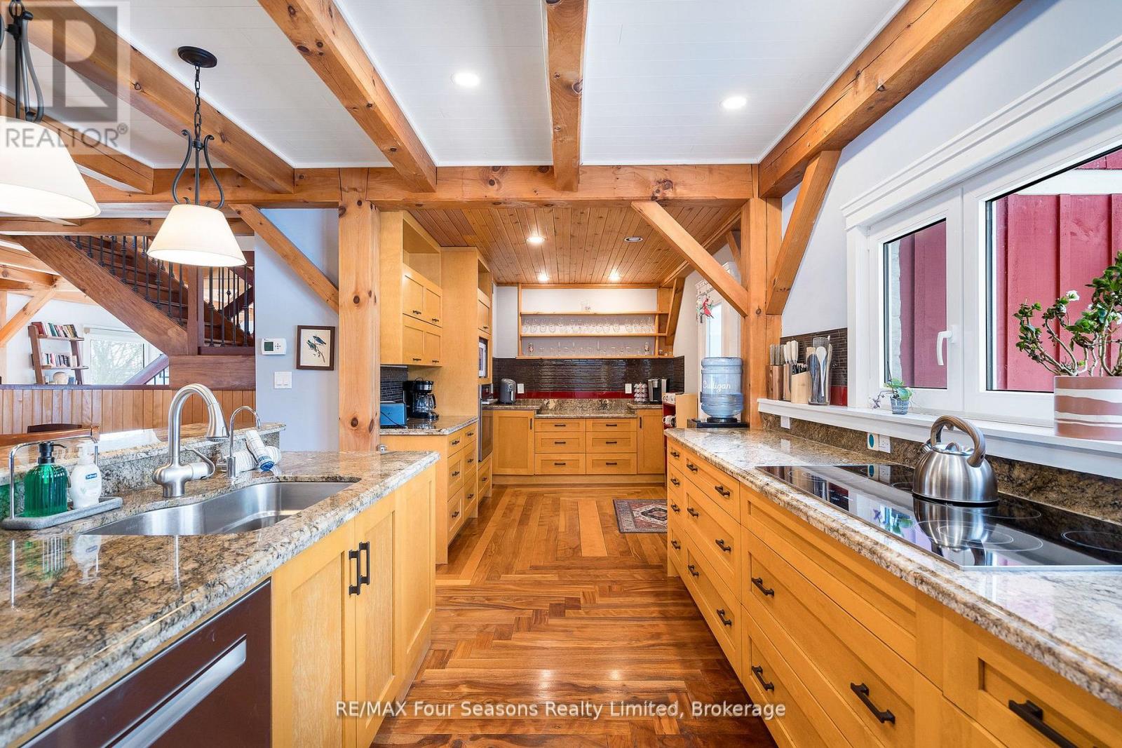 Stunning Timber Frame Estate on 2.5 Acres in Thornbury. Exceptional stone-clad timber frame residence offering approximately 6,300 sq. ft. of beautifully crafted living space, set on 2.5 private, fully landscaped acres. Designed for extended family living, entertaining, or use as a luxury short-term rental (Airbnb), this one-of-a-kind property delivers comfort, privacy, and four-season enjoyment. The maintenance-free all-stone exterior provides superior insulation and quiet durability, while the timber frame construction and South American hardwood floors add warmth and character throughout. Expansive, light-filled principal rooms create an inviting atmosphere for both everyday living and hosting larger groups. The home features 6 bedrooms and 6 bathrooms, including a primary suite and guest suite with private ensuites, offering excellent flexibility for family and guests. The chef's kitchen is complemented by a butler's pantry and separate baker's kitchen, ideal for entertaining or catering. European tilt-and-turn windows enhance energy efficiency and indoor-outdoor flow. Resort-style amenities include a 17-foot indoor swim spa and sauna, geothermal heating and cooling, and radiant in-floor heating throughout. Multiple living areas provide ample space and privacy, making the layout well suited for short-term rental use. Additional highlights include a 36' x 24' heated workshop with separate driveway, perfect for hobbies, storage, or a home business, and a 26' diameter dome greenhouse for year-round gardening. Furnishings are negotiable, offering potential for a turnkey rental opportunity. Ideally located minutes from Thornbury and Meaford, and a short drive to Blue Mountain Village and private ski clubs, this chalet-inspired estate offers an outstanding opportunity to enjoy a premium recreational lifestyle or generate income in a sought-after four-season destination. (id:64974)