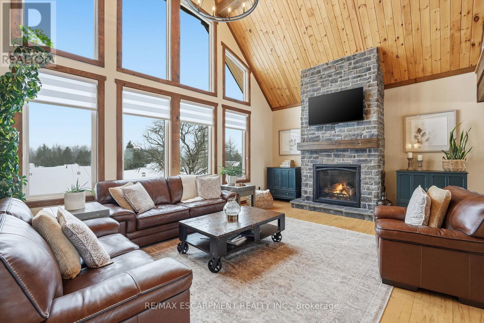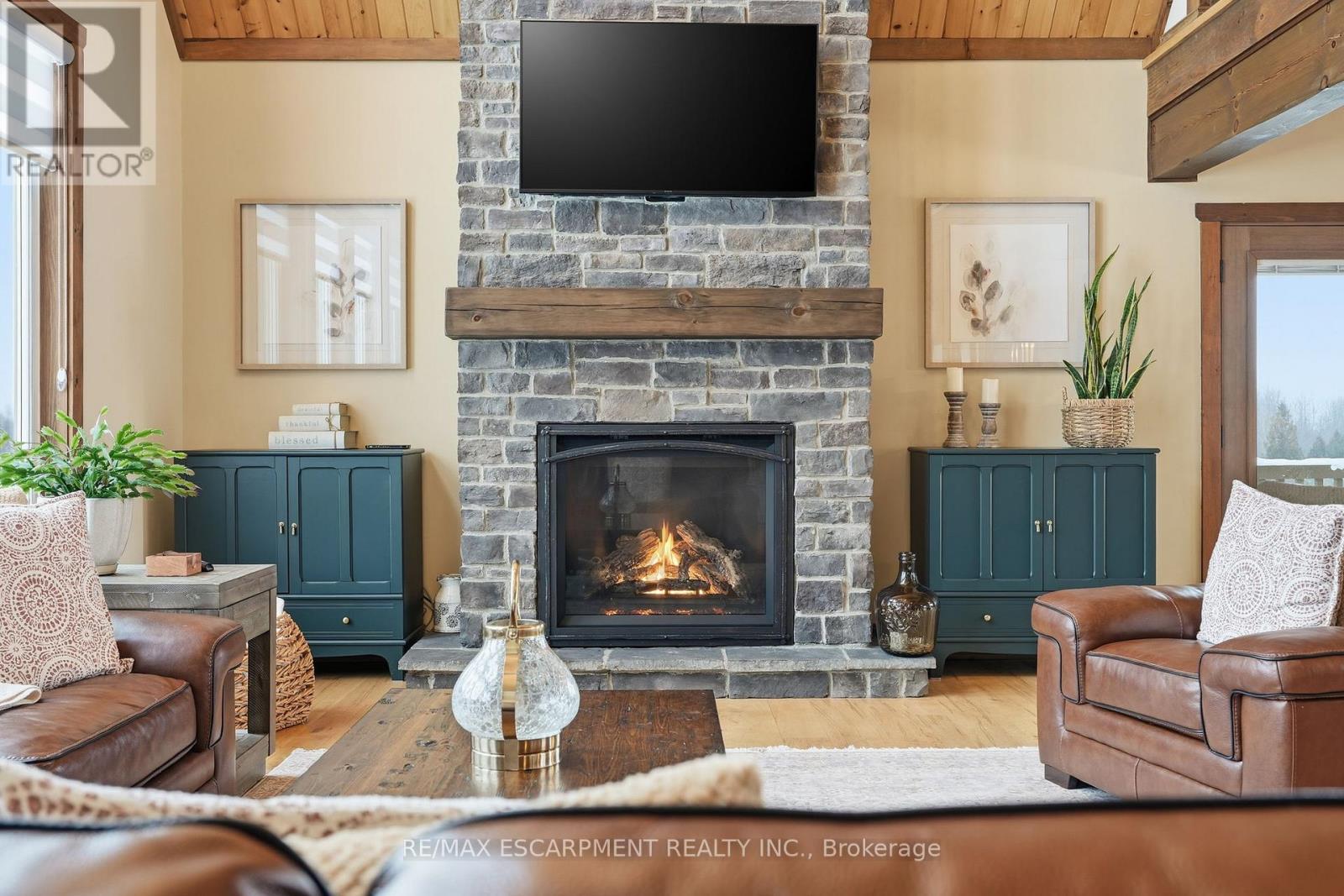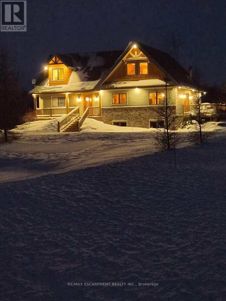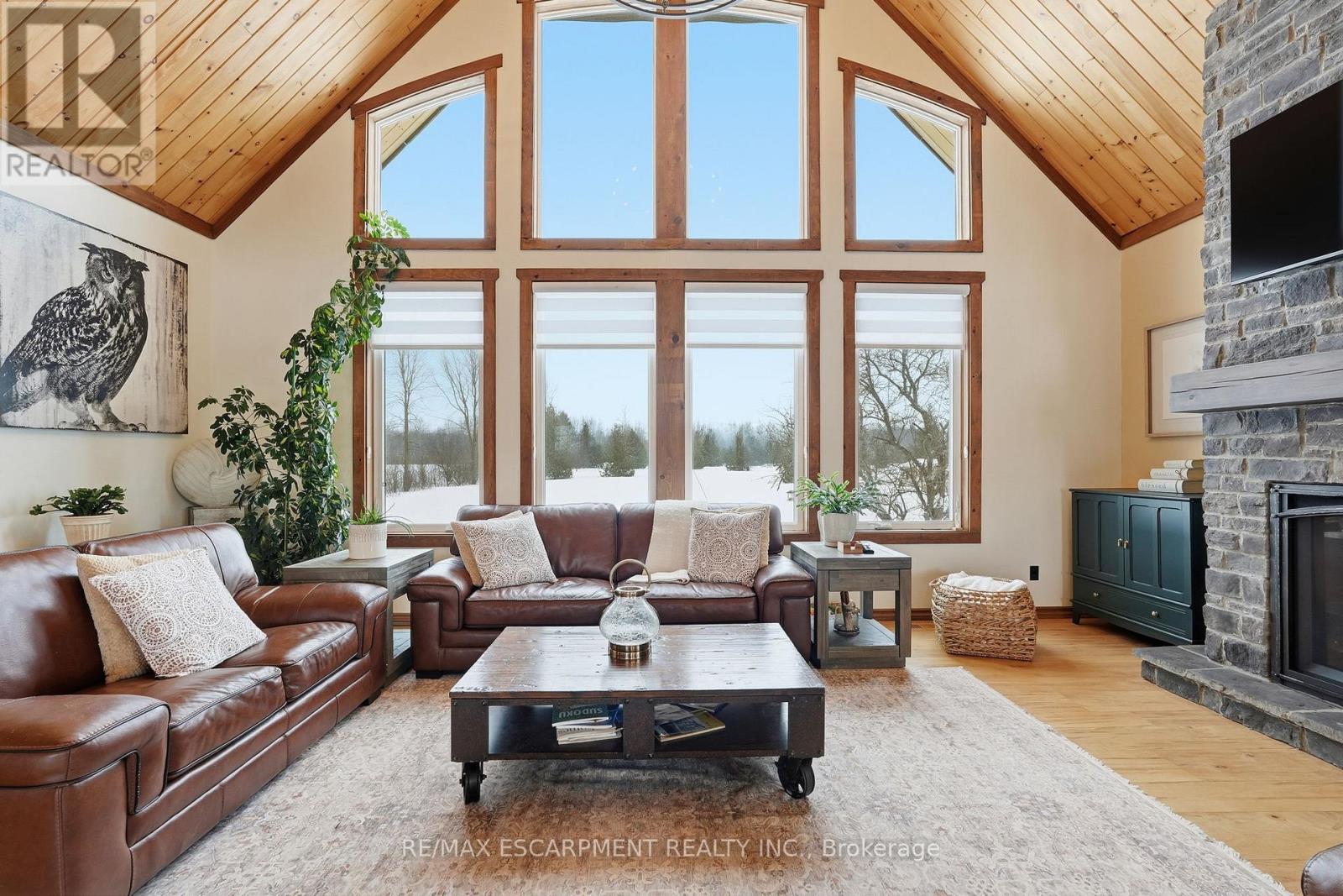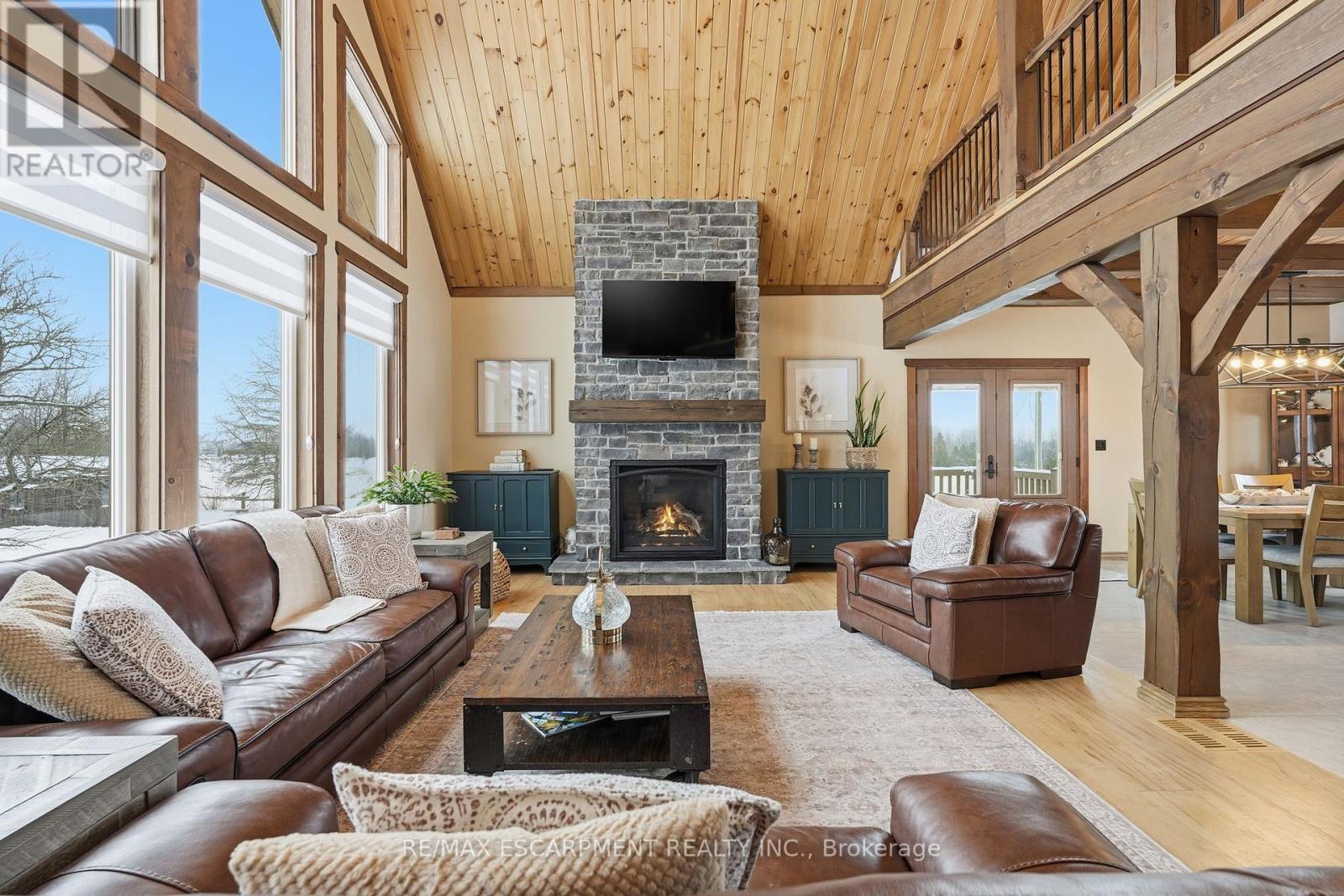 Welcome to this truly special 3-bedroom, 3-bathroom timber-framed home, perfectly set on a beautifully landscaped almost 5.5-acre lot just a hop, skip, and a jump from Mount Forest. The heart of the home is the spectacular great room, featuring vaulted ceilings, a floor-to-ceiling stone fireplace, and a stunning wall of windows that frames peaceful views of the surrounding nature. A spacious loft overlooks the great room, offering flexible space for a home office, reading nook, or guest area. The large, open-concept kitchen flows seamlessly into the great room-ideal for entertaining or everyday living. The main-floor primary bedroom provides comfort and convenience, while the finished lower level impresses with high ceilings, large windows, heated floors, and an additional stone fireplace, creating a warm and inviting retreat. Outside, the property truly shines with a picturesque pond, mature landscaping, and endless room to enjoy the outdoors. Car enthusiasts, hobbyists, or tradespeople will love the massive 24' x 36' detached garage/workshop. This is country living at its best. RSA. Luxury Certified. (id:64974)