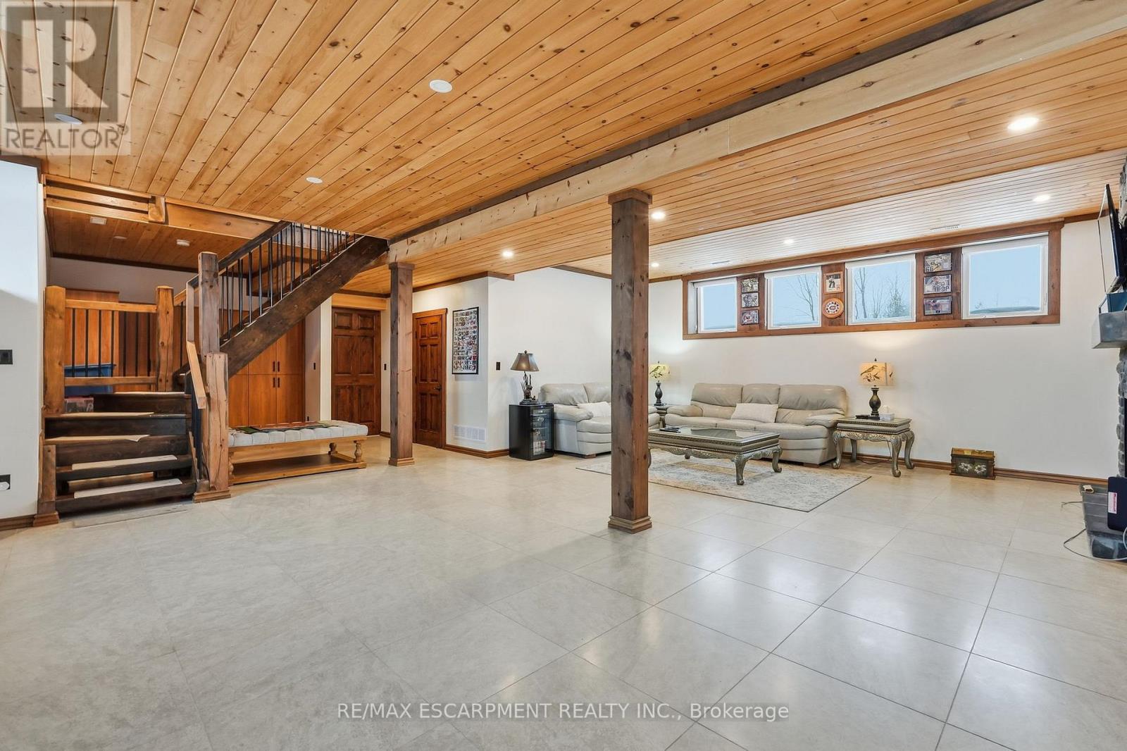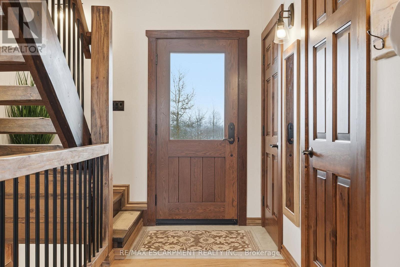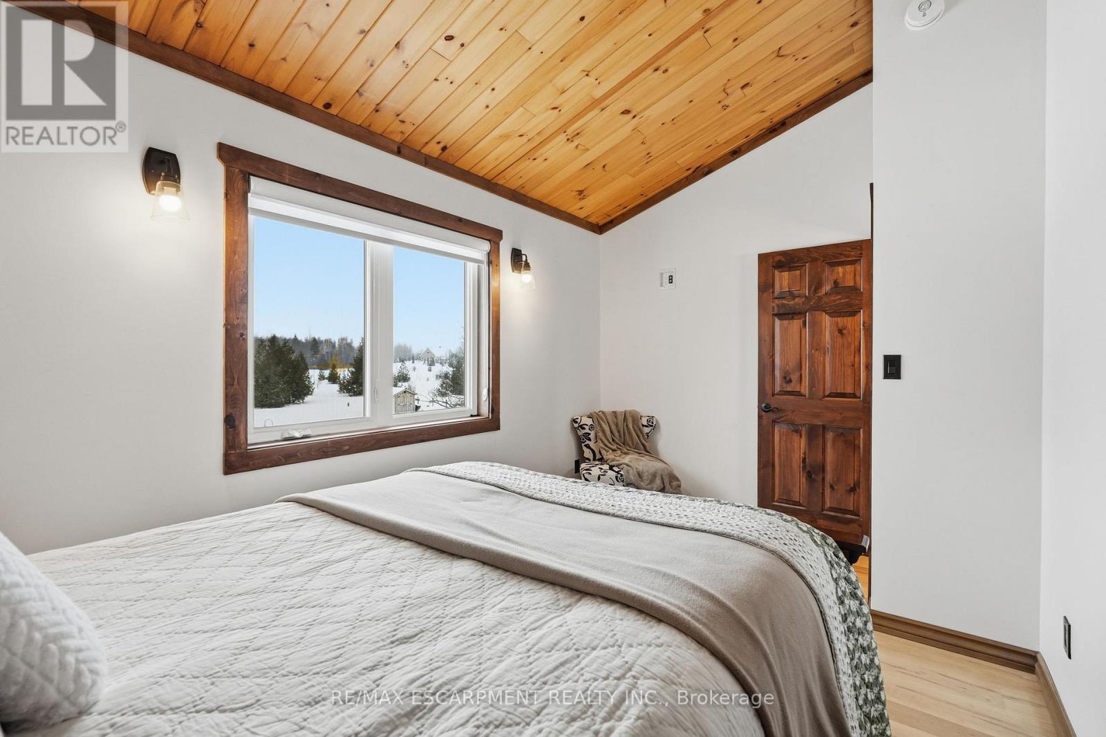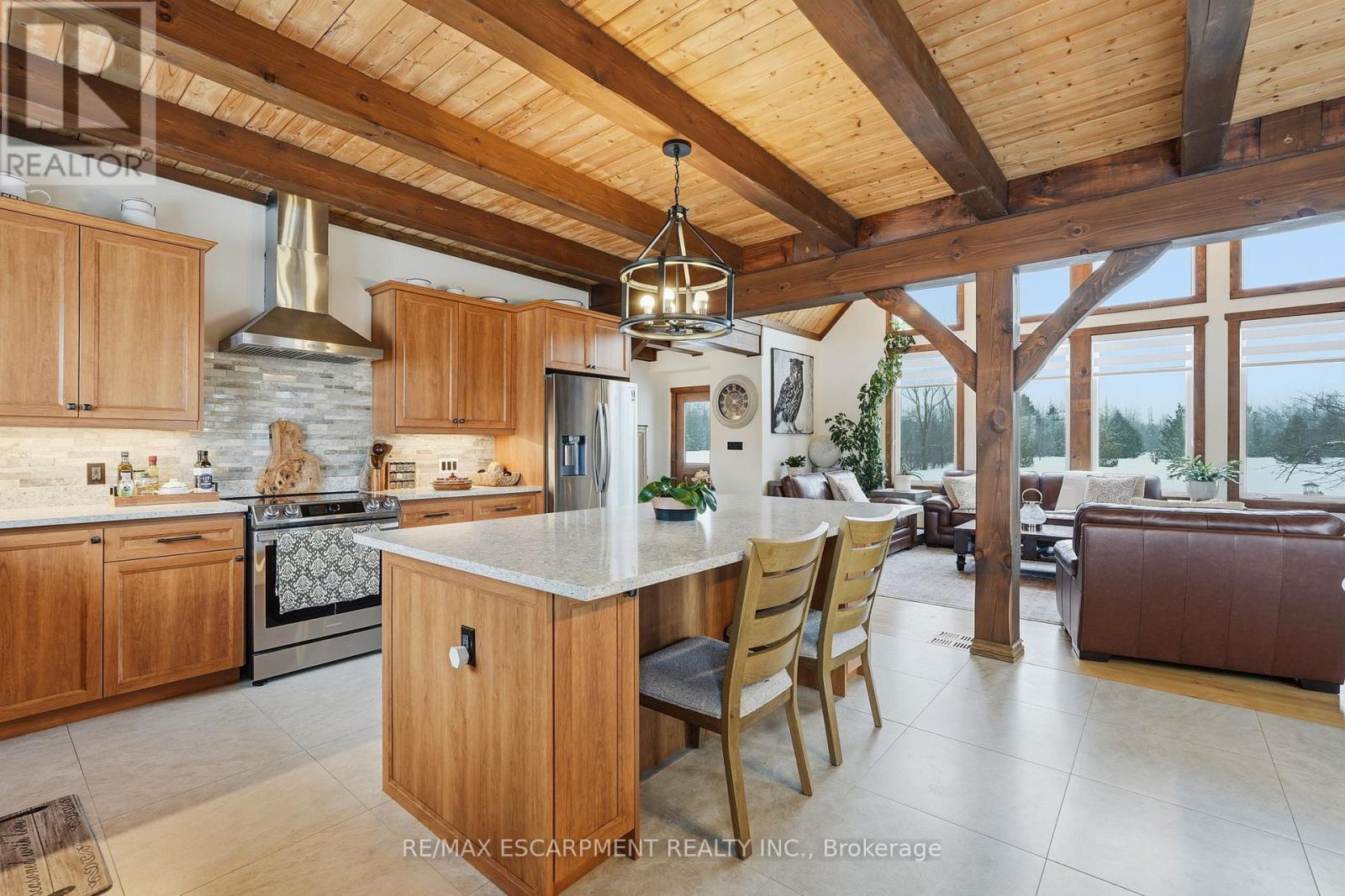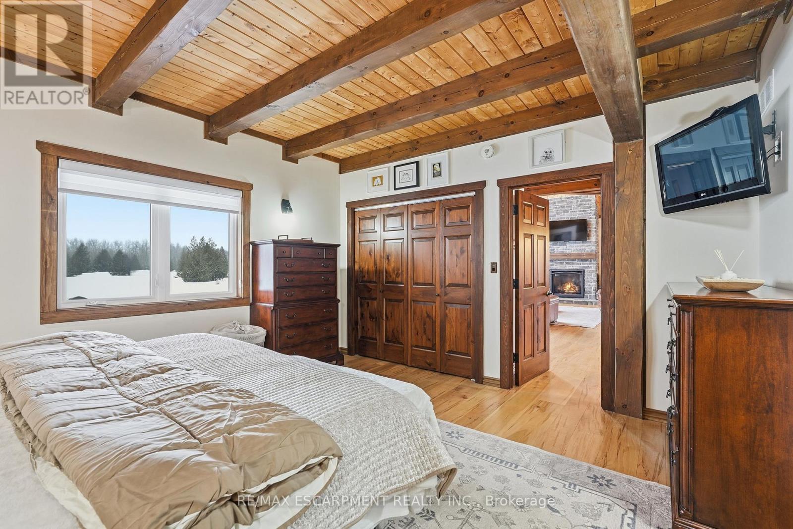 Welcome to this truly special 3-bedroom, 3-bathroom timber-framed home, perfectly set on a beautifully landscaped almost 5.5-acre lot just a hop, skip, and a jump from Mount Forest. The heart of the home is the spectacular great room, featuring vaulted ceilings, a floor-to-ceiling stone fireplace, and a stunning wall of windows that frames peaceful views of the surrounding nature. A spacious loft overlooks the great room, offering flexible space for a home office, reading nook, or guest area. The large, open-concept kitchen flows seamlessly into the great room-ideal for entertaining or everyday living. The main-floor primary bedroom provides comfort and convenience, while the finished lower level impresses with high ceilings, large windows, heated floors, and an additional stone fireplace, creating a warm and inviting retreat. Outside, the property truly shines with a picturesque pond, mature landscaping, and endless room to enjoy the outdoors. Car enthusiasts, hobbyists, or tradespeople will love the massive 24' x 36' detached garage/workshop. This is country living at its best. RSA. Luxury Certified. (id:64974)