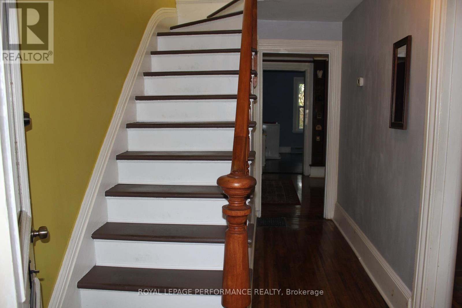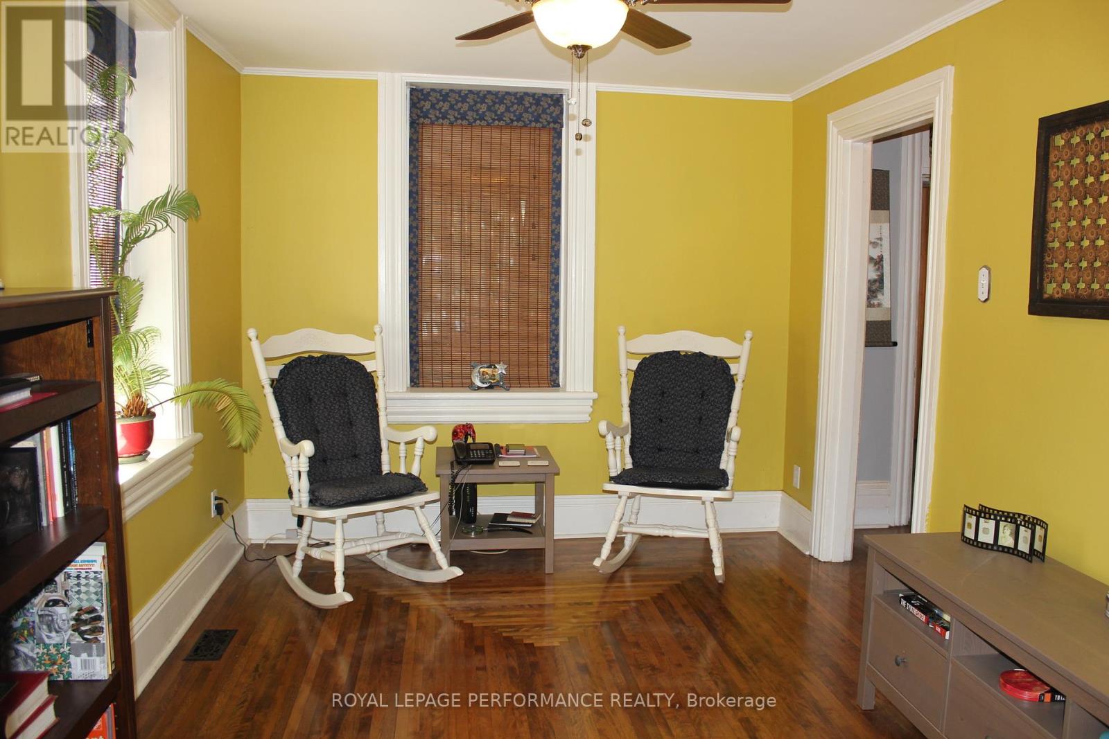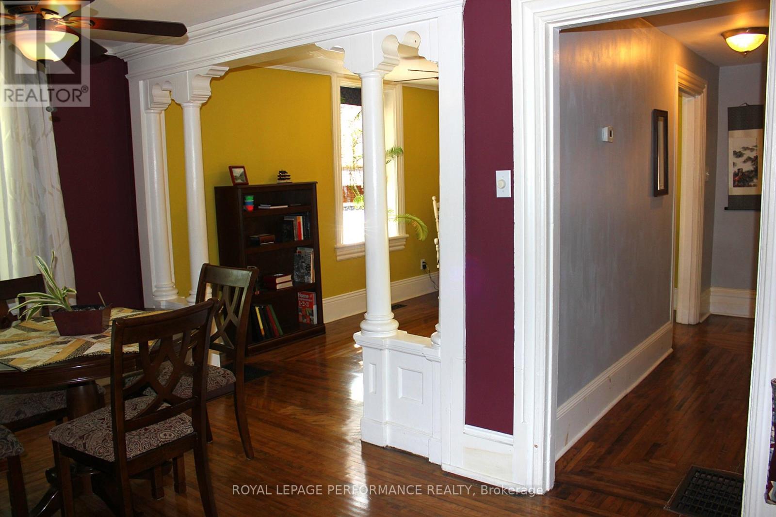 This well-maintained, two-story home is filled with charm and history. Enjoy downtown living with all its amenities in this affordable family home. As you enter, you're greeted by a generous, enclosed front porch, perfect for removing coats and boots. The bright living room features a large window and ornate details, including a division between the living room and dining room. The home boasts original and beautifully inlaid hardwood floors throughout both levels. The sunny kitchen includes laundry facilities and a door leading to the back porch and backyard. Upstairs, a refinished and stunning staircase leads to the second level, which offers three bedrooms with ample windows and a four-piece bathroom. The private lot is fully fenced and includes a detached garage, as well as a quaint side and backyard. (id:64974)