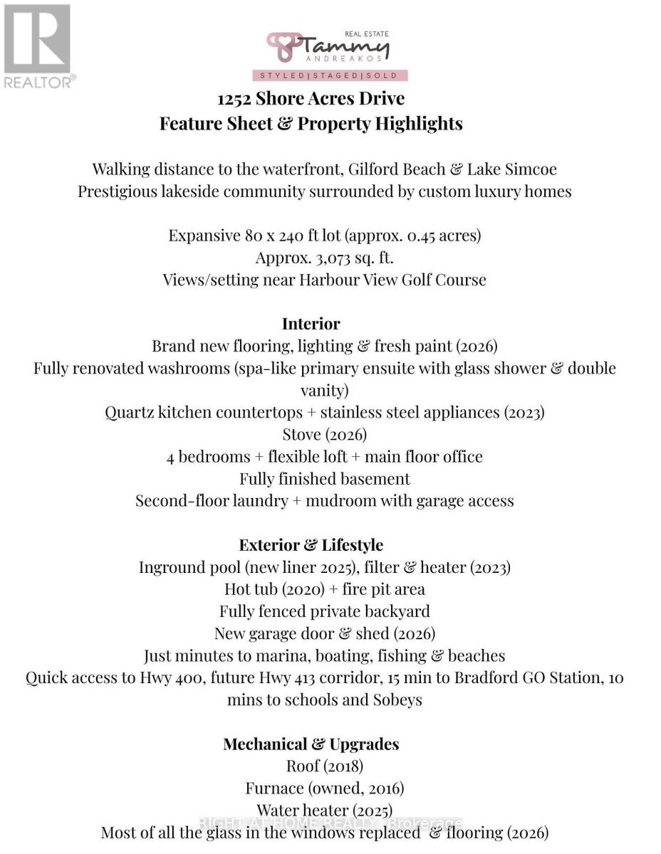WALKING DISTANCE TO THE WATERFRONT! Just 45 minutes from Toronto, welcome to your private sanctuary in Gilford's most desirable lakeside community. Imagine waking up to the soft glow of the sun over the Harbour View Golf Course, where this exceptional over 3000 total sqft. estate offers a rare blend of modern luxury and four-season magic. Set among custom multi-million dollar residences, this isn't just a home-it's the backdrop for your family's most cherished memories.Step inside to a sun-drenched family room where expansive windows frame peaceful greenery. The bright, eat-in kitchen, quartz counters, complete with stainless steel appliances and an effortless walkout to the dining area, is designed for slow Sunday brunches and lively dinner parties. Experience total peace of mind with extensive 2026 updates, including windows, designer flooring, fresh paint, & updated lighting. Every detail has been considered, all washrooms which have been beautifully renovated, featuring a primary ensuite sanctuary with a large walk-in glass shower,double vanity & stunning golf course vistas.The lifestyle truly shines outdoors in your private resort. Whether it's summer days by the inground pool, quiet evenings in the hot tub, or crisp nights gathered around the fire pit, this fully fenced 0.45-acre backyard is built for connection. With four spacious bedrooms-including a flexible loft-and a dedicated home office on main floor the layout effortlessly adapts to your needs. The fully finished basement adds even more space for a gym or movie nights, while the second-floor laundry and spacious mudroom with garage access. Leave the city stress behind without losing the convenience. You are just a short stroll from the sandy shores of Gilford Beach and world-class boating at Kon Tiki Marina, fishing on Lake Simcoe! With quick access to Hwy 400, the future Hwy 413 corridor, 15 min to Bradford GO Station, 10 mins to Schools & Sobeys. Watch the Video Tour! (id:64974)