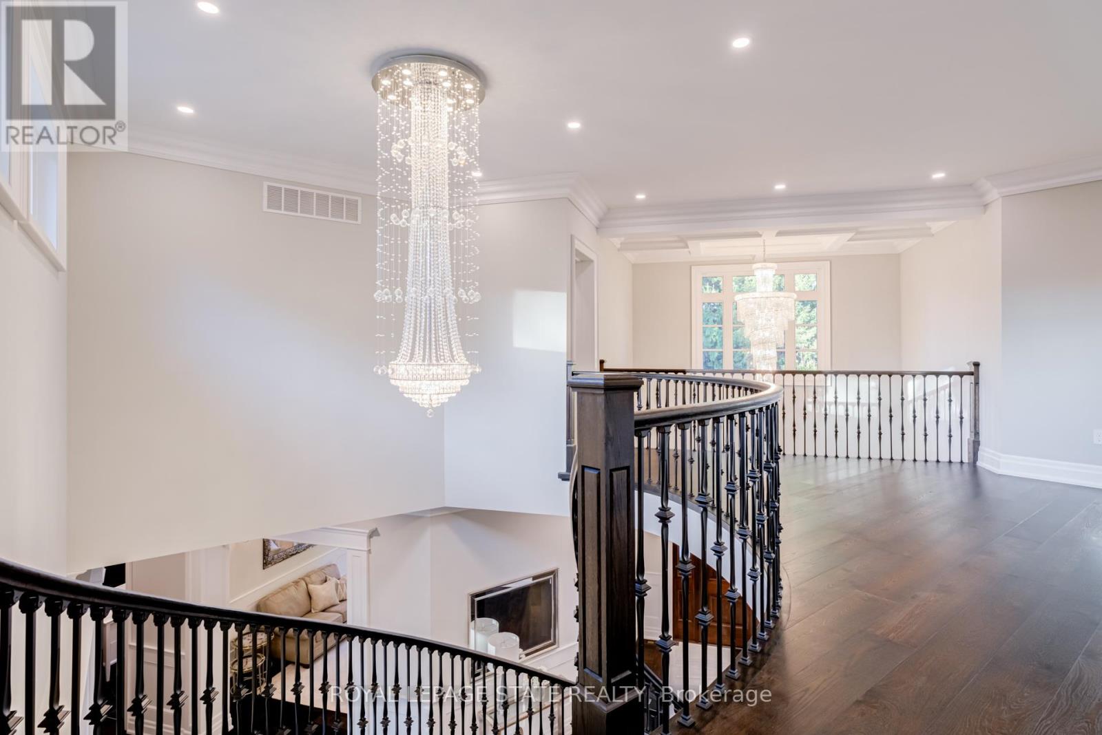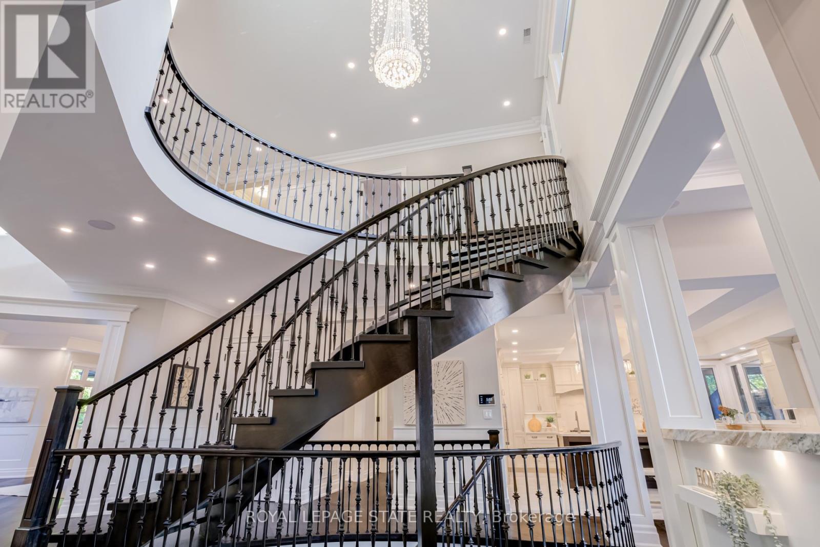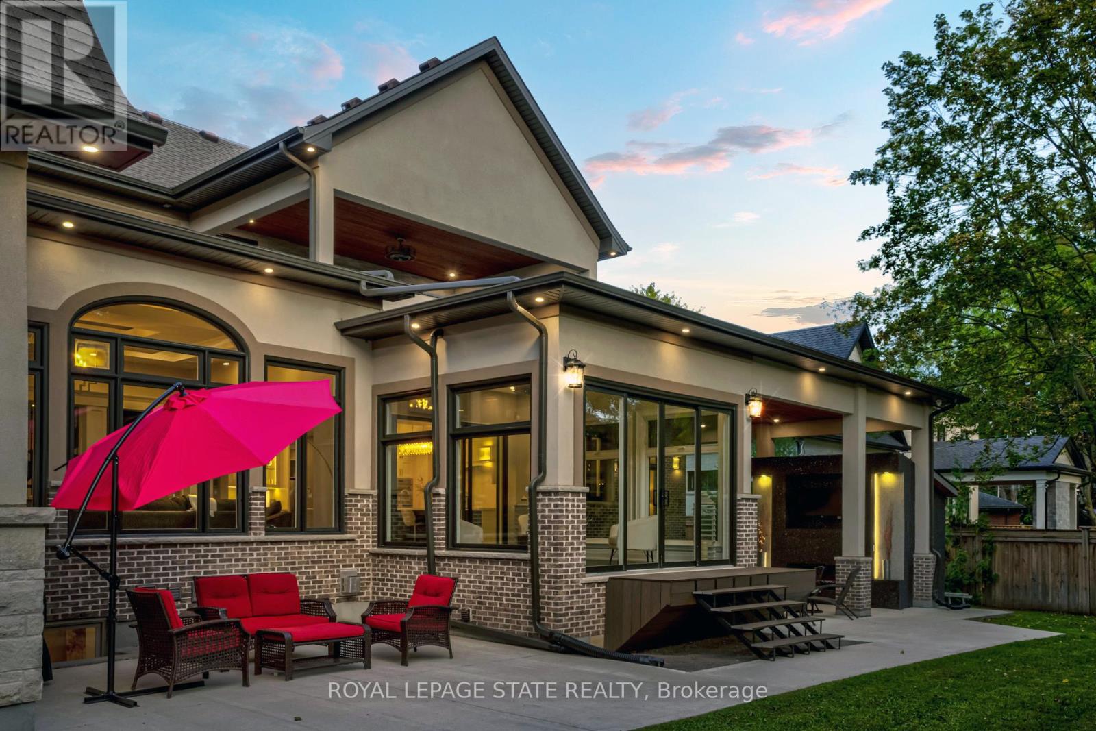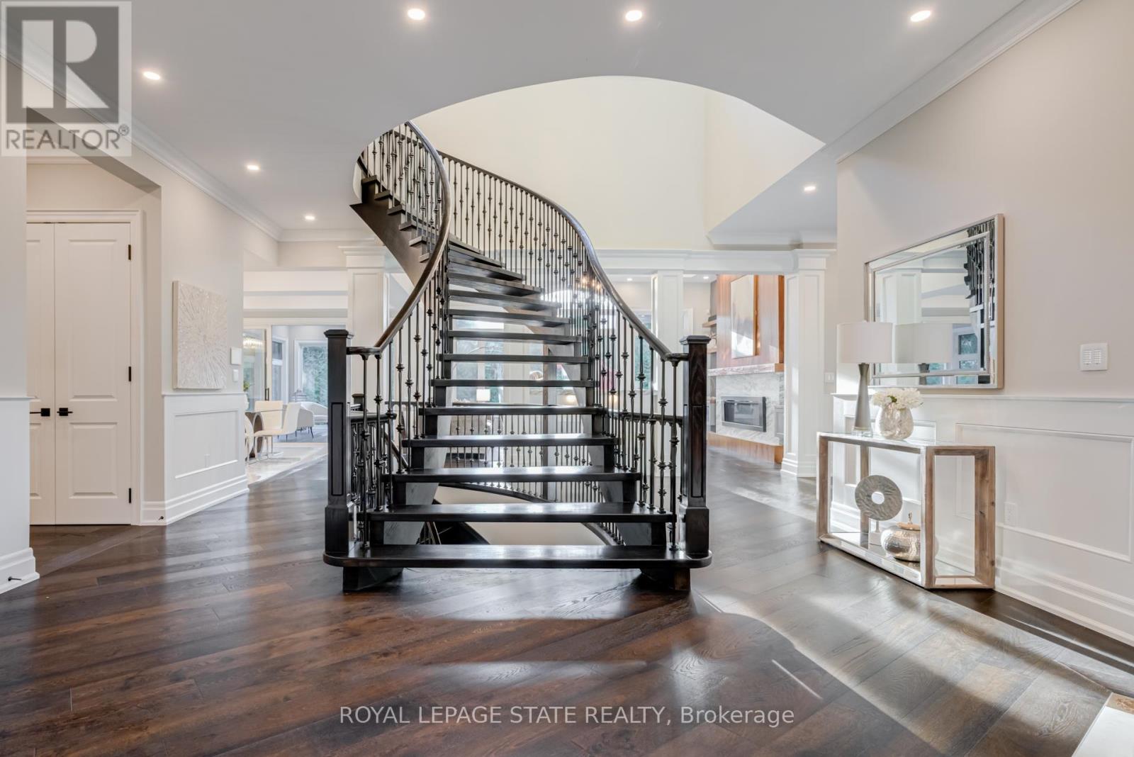 This multi-generational luxury dream home blends timeless design with superior craftsmanship, offering over 8,850 sqft. of finished living space with 7 bedrooms and 8 bathrooms on a 135-ft-wide lot in Ancasters prestigious Oakhill neighbourhood. Surrounded by mature trees and estate homes, the property showcases two separate garages, parking for 20+ vehicles, professional landscaping, and a commanding architectural façade. Inside, a 21-ft grand foyer with curved staircase and custom millwork sets an elegant tone, complemented by wide-plank hardwood, porcelain tile, and abundant natural light from oversized windows. The main level offers formal living and dining rooms, a private office, powder room, and one of two primary suites with backyard walk-out. At the heart of the home, a soaring family room with floor-to-ceiling windows connects to a gourmet kitchen featuring top-tier Thermador appliances, a servery, walk-in pantry, and a heated four-season sunroom with in-floor heating. Upstairs are four generous bedrooms, each with its own ensuite and heated floors, plus a convenient laundry room and a spectacular primary retreat with gas fireplace, dressing room, and spa-inspired 6-pc ensuite. A covered terrace with artificial turf extends the living space outdoors. The finished lower level offers incredible versatility for extended family living with a separate entrance, two bedrooms, two bathrooms, recreation room with gas fireplace, kitchenette, and a sound-isolated home theatre room that can be separated from the rest of the basement. The private backyard provides multiple patios under mature trees, with professional renderings available for a future pool, hot tub, and full landscaping. Smart-home features include Control4 automation, security system, 400-amp, dual furnaces & ACs, HRVs, and central vacuum with hide-a-hoses. A rare opportunity to own an Oakhill estate that combines sophistication, space, and modern functionality for todays luxury lifestyle. (id:64974)