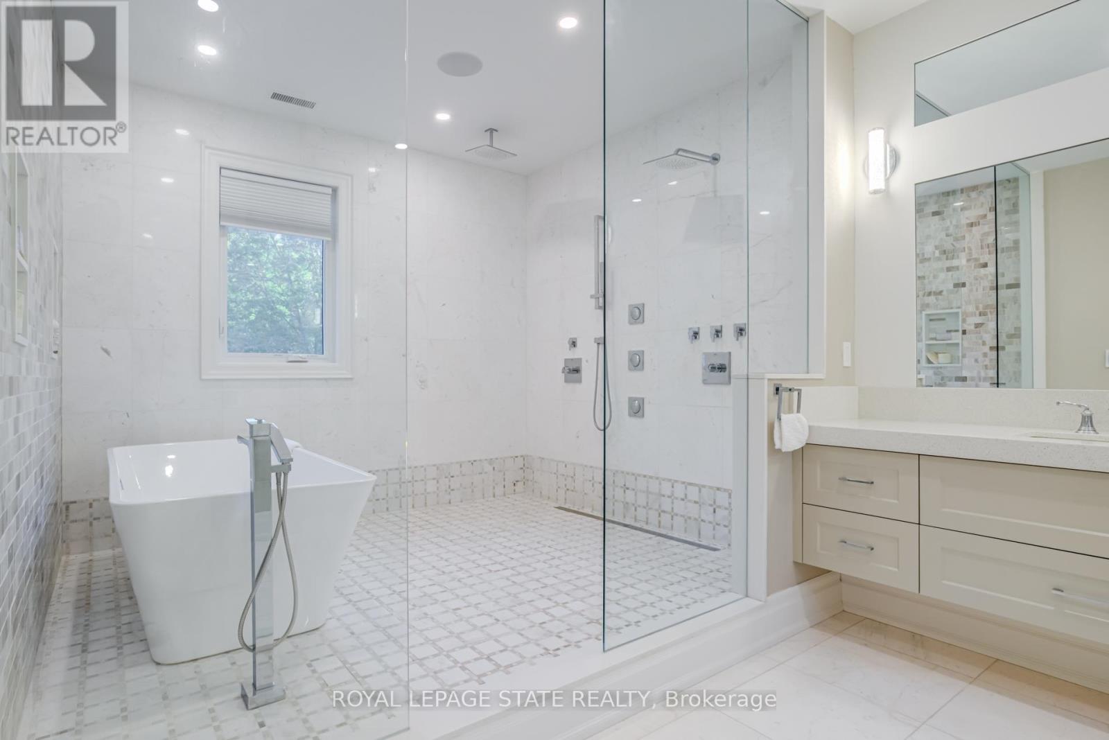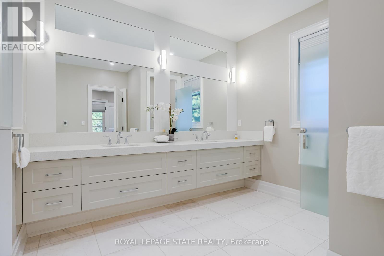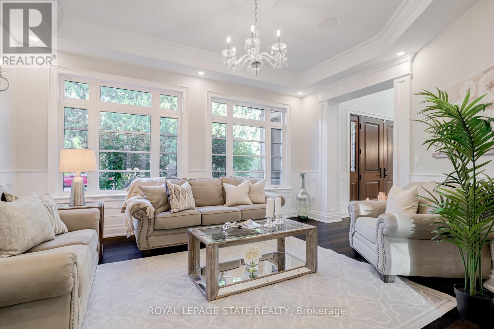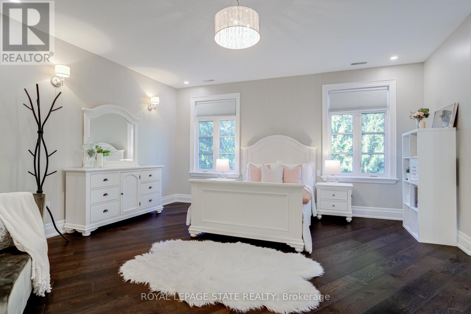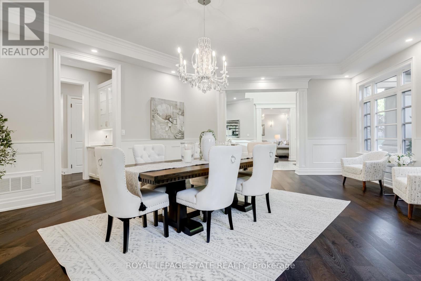 This multi-generational luxury dream home blends timeless design with superior craftsmanship, offering over 8,850 sqft. of finished living space with 7 bedrooms and 8 bathrooms on a 135-ft-wide lot in Ancasters prestigious Oakhill neighbourhood. Surrounded by mature trees and estate homes, the property showcases two separate garages, parking for 20+ vehicles, professional landscaping, and a commanding architectural façade. Inside, a 21-ft grand foyer with curved staircase and custom millwork sets an elegant tone, complemented by wide-plank hardwood, porcelain tile, and abundant natural light from oversized windows. The main level offers formal living and dining rooms, a private office, powder room, and one of two primary suites with backyard walk-out. At the heart of the home, a soaring family room with floor-to-ceiling windows connects to a gourmet kitchen featuring top-tier Thermador appliances, a servery, walk-in pantry, and a heated four-season sunroom with in-floor heating. Upstairs are four generous bedrooms, each with its own ensuite and heated floors, plus a convenient laundry room and a spectacular primary retreat with gas fireplace, dressing room, and spa-inspired 6-pc ensuite. A covered terrace with artificial turf extends the living space outdoors. The finished lower level offers incredible versatility for extended family living with a separate entrance, two bedrooms, two bathrooms, recreation room with gas fireplace, kitchenette, and a sound-isolated home theatre room that can be separated from the rest of the basement. The private backyard provides multiple patios under mature trees, with professional renderings available for a future pool, hot tub, and full landscaping. Smart-home features include Control4 automation, security system, 400-amp, dual furnaces & ACs, HRVs, and central vacuum with hide-a-hoses. A rare opportunity to own an Oakhill estate that combines sophistication, space, and modern functionality for todays luxury lifestyle. (id:64974)
