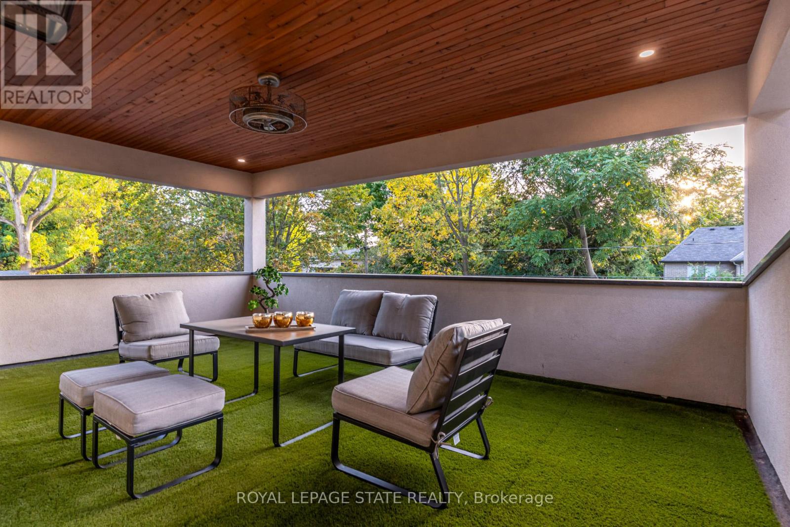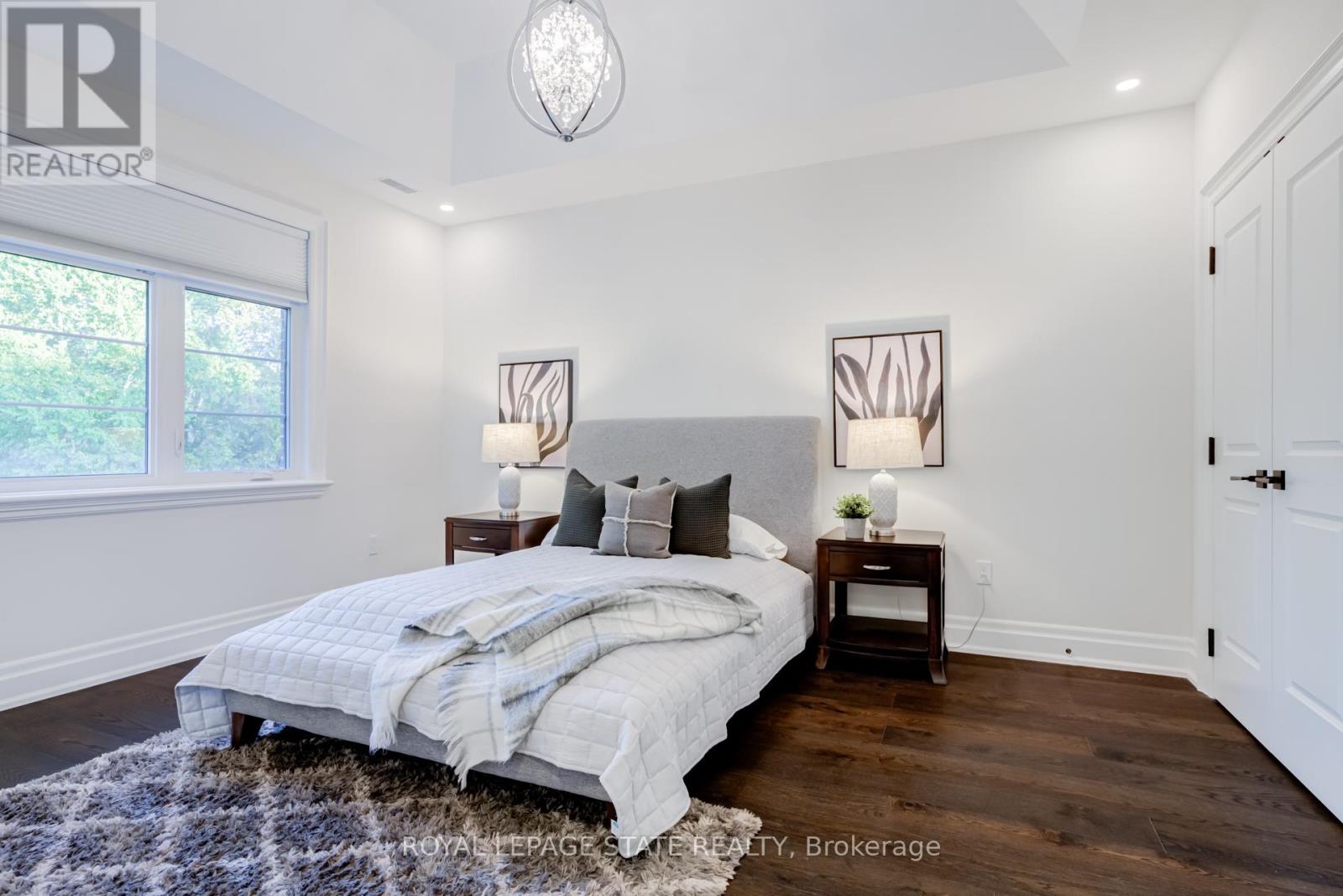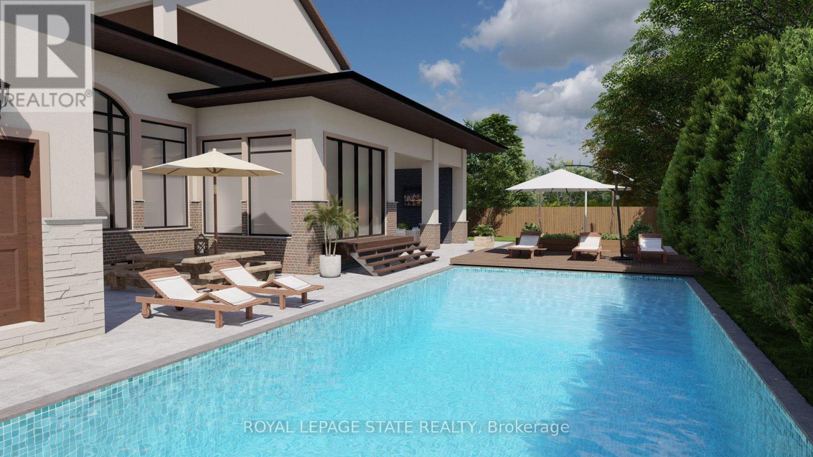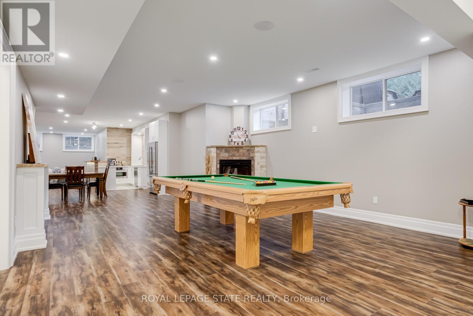 This multi-generational luxury dream home blends timeless design with superior craftsmanship, offering over 8,850 sqft. of finished living space with 7 bedrooms and 8 bathrooms on a 135-ft-wide lot in Ancasters prestigious Oakhill neighbourhood. Surrounded by mature trees and estate homes, the property showcases two separate garages, parking for 20+ vehicles, professional landscaping, and a commanding architectural façade. Inside, a 21-ft grand foyer with curved staircase and custom millwork sets an elegant tone, complemented by wide-plank hardwood, porcelain tile, and abundant natural light from oversized windows. The main level offers formal living and dining rooms, a private office, powder room, and one of two primary suites with backyard walk-out. At the heart of the home, a soaring family room with floor-to-ceiling windows connects to a gourmet kitchen featuring top-tier Thermador appliances, a servery, walk-in pantry, and a heated four-season sunroom with in-floor heating. Upstairs are four generous bedrooms, each with its own ensuite and heated floors, plus a convenient laundry room and a spectacular primary retreat with gas fireplace, dressing room, and spa-inspired 6-pc ensuite. A covered terrace with artificial turf extends the living space outdoors. The finished lower level offers incredible versatility for extended family living with a separate entrance, two bedrooms, two bathrooms, recreation room with gas fireplace, kitchenette, and a sound-isolated home theatre room that can be separated from the rest of the basement. The private backyard provides multiple patios under mature trees, with professional renderings available for a future pool, hot tub, and full landscaping. Smart-home features include Control4 automation, security system, 400-amp, dual furnaces & ACs, HRVs, and central vacuum with hide-a-hoses. A rare opportunity to own an Oakhill estate that combines sophistication, space, and modern functionality for todays luxury lifestyle. (id:64974)