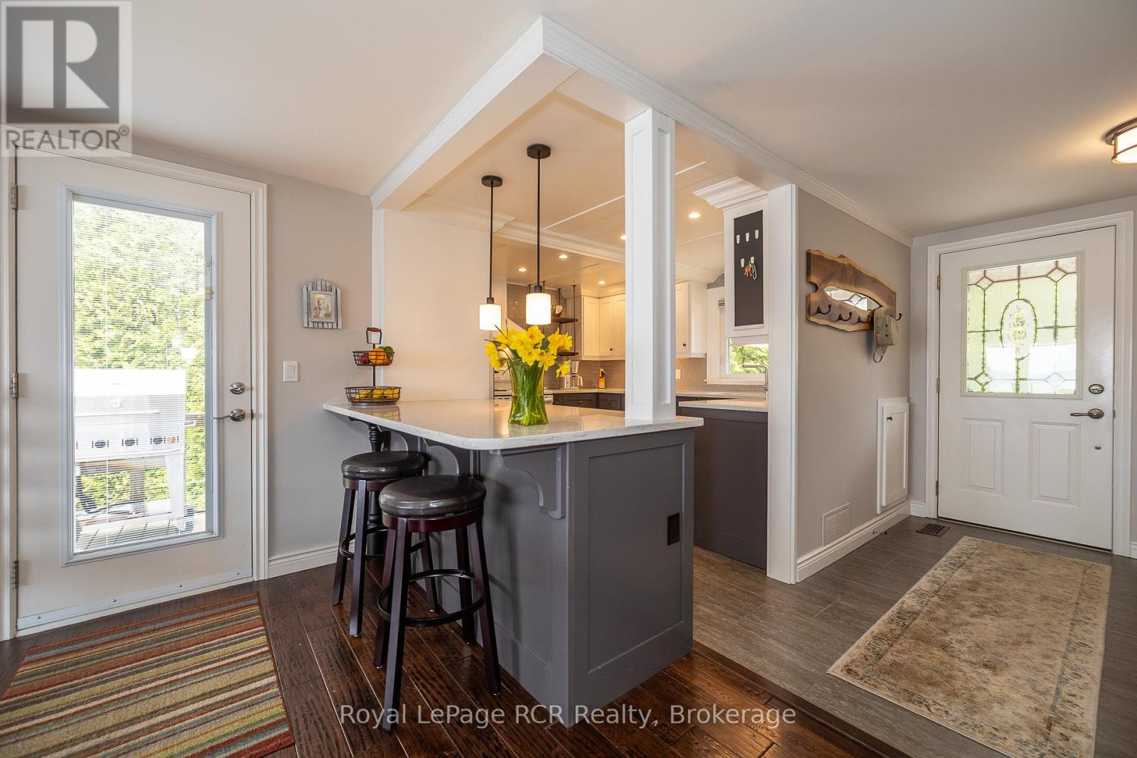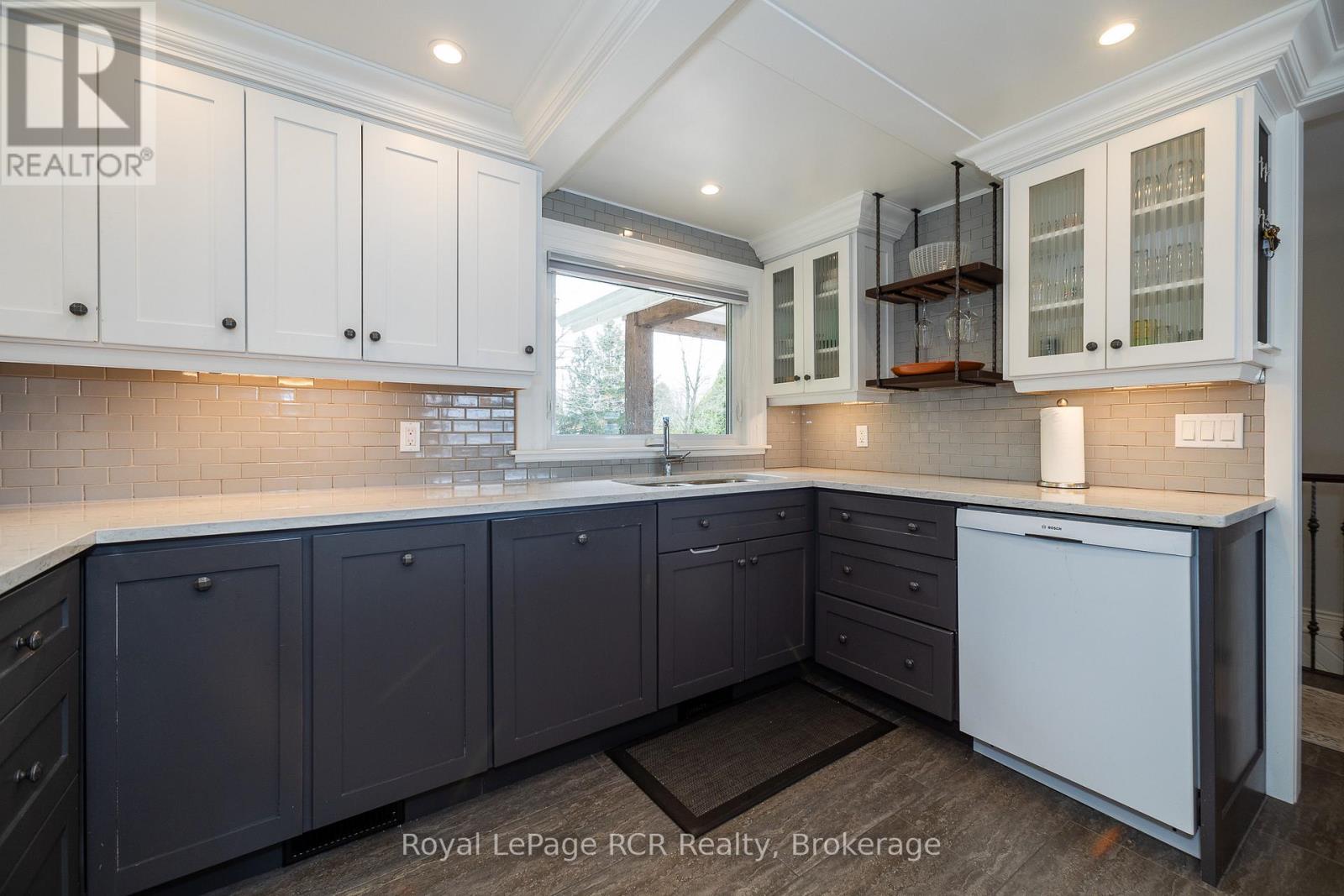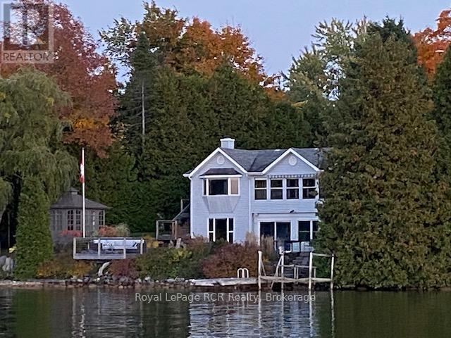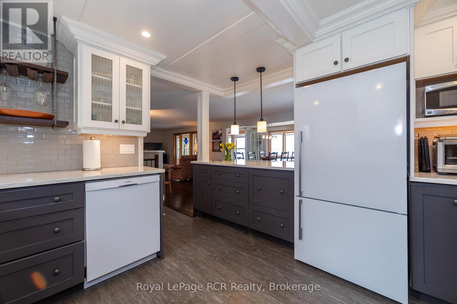 123' waterfront on Sunset Point, Lake Eugenia with unobstructed views from nearly every room on both levels. Enjoy the open kitchen, dining and living areas with direct access to the light-filled sunroom. Lower level walkout features a family room with propane free-standing stove, second kitchen, 2nd bath and great coat room with access to the attached garage. Walkout to stone patio, waterside deck, sheltered dock, enclosed gazebo, sandy beach area and everything desired in a waterfront property. Thoroughly enjoyed and lovingly maintained including updated kitchen and bath (2017), hot water tank (2023), sewage pump (2024), shingles (2010), eavestrough with leaf guard (2023). Shared ownership and use of Macdonald Farm with 127 acres of trails for recreational use. (id:64974)