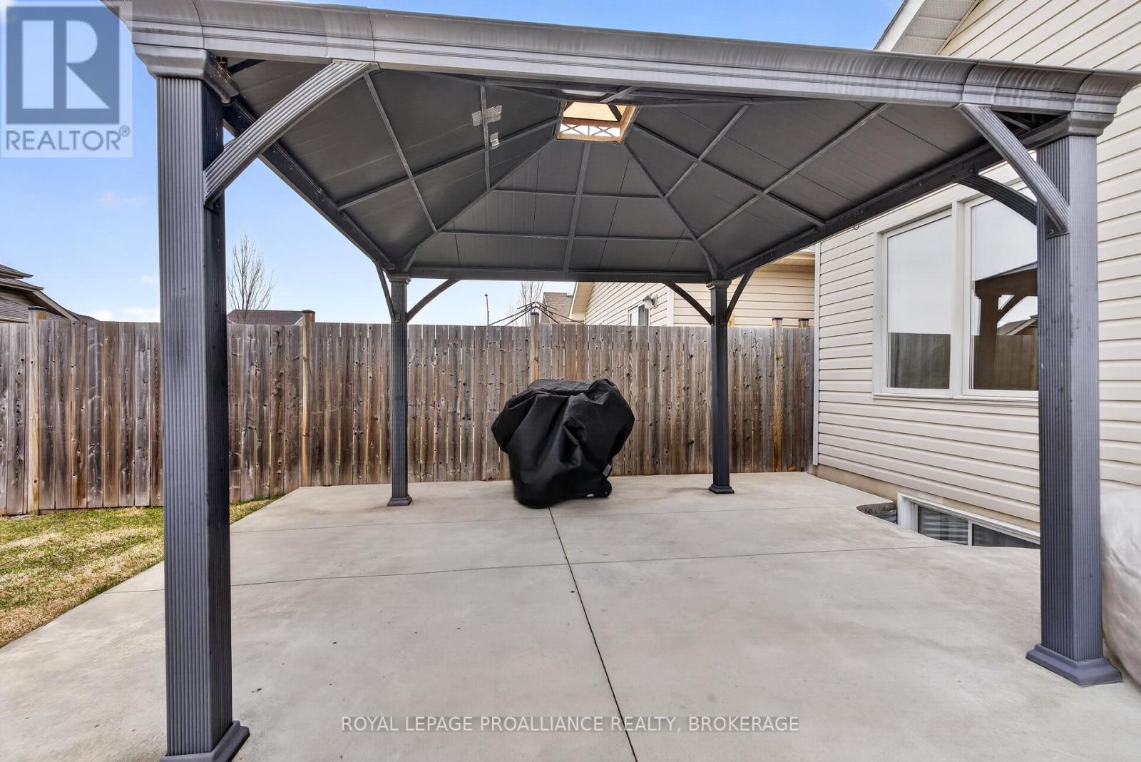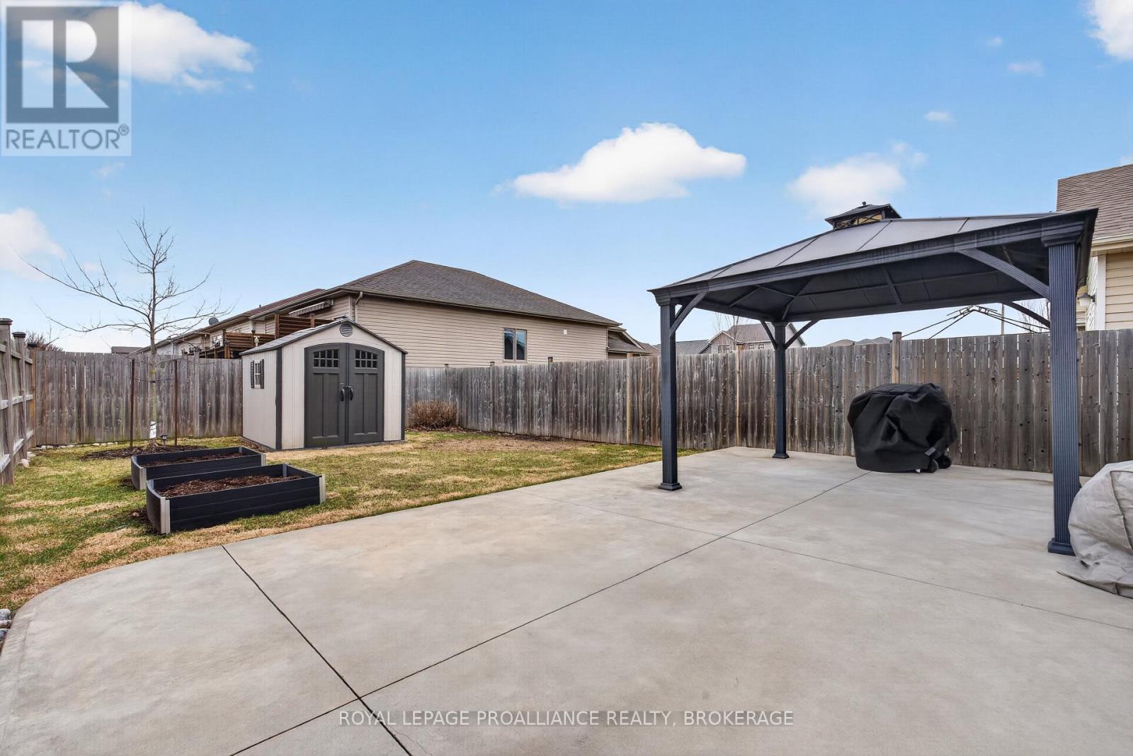Lovely Lyndenwood! 1271 Atkinson is a classic 2-story family home in a super neighbourhood and on a great street. From the covered front porch and upgraded stone front exterior, this Caraco build offers many upgrades and is finished top to bottom. The open concept main floor finds a bright office or flex space upon entry, a 2-pc bath, the oak kitchen with tiled backsplash and extended eating bar and an ample dining area and living room with vaulted ceiling and large windows- the perfect viewpoint to the impressive fenced rear yard with gorgeous slab patio and hard top gazebo. Three bedrooms, including the primary with double closets, and a main bath are upstairs. The builder-finished lower level maximizes the living space with a sweet family room, large guest bedroom, another full bath and a big laundry/storage room. Located near all west end amenities, minutes to the 401, steps to family parks and a splash pad- this is a good one! (id:64974)