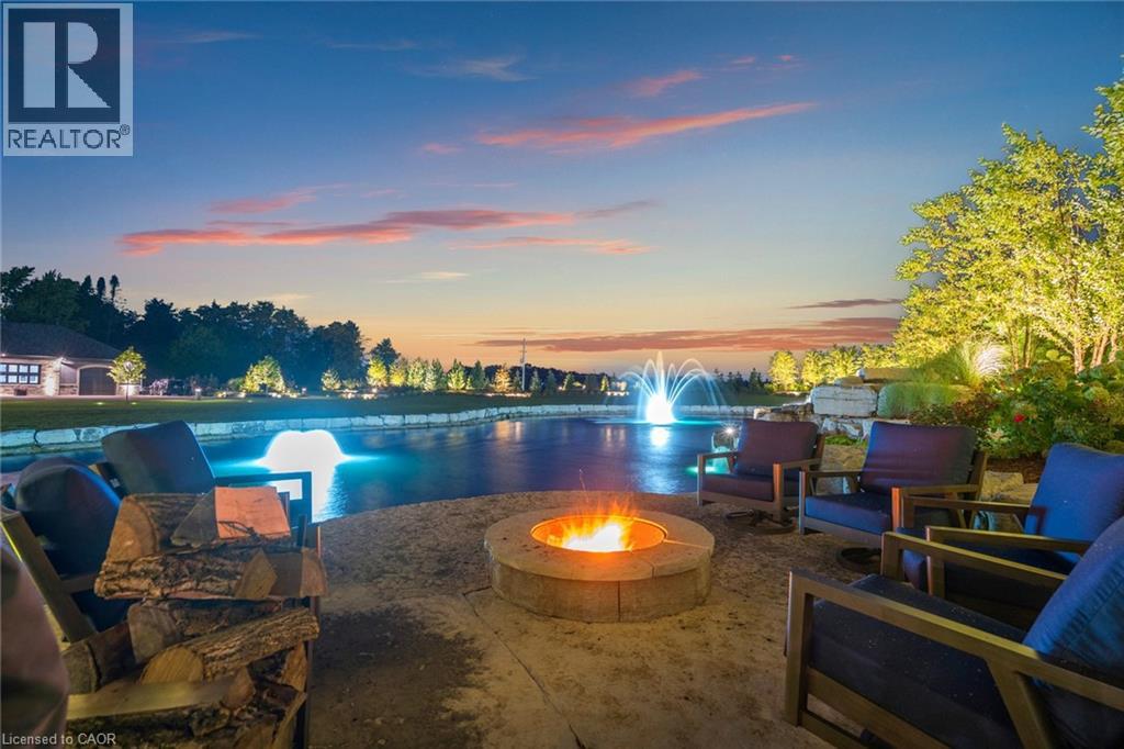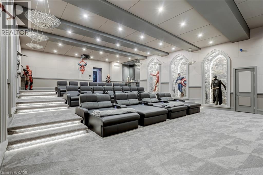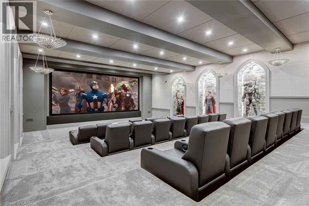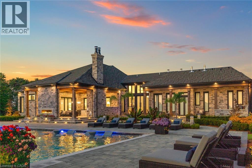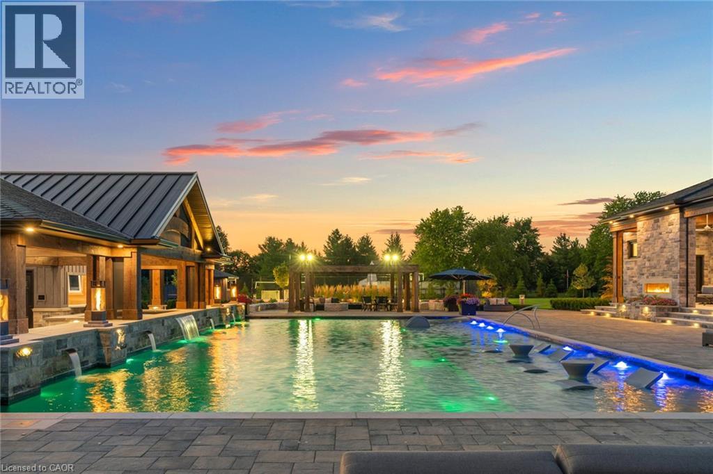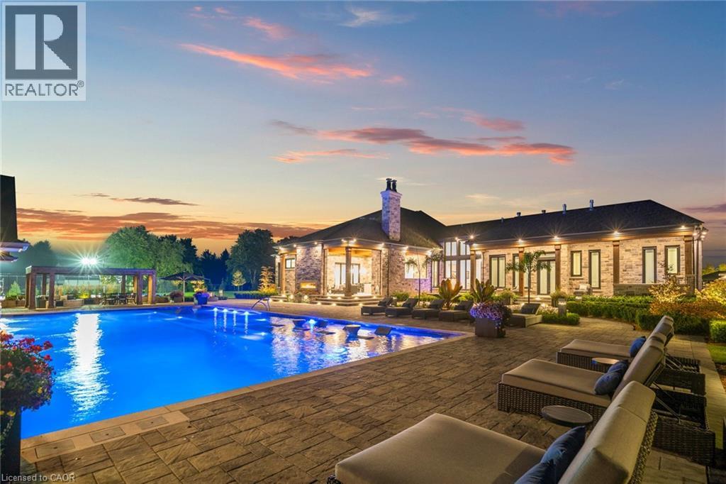 Set amidst a 5.2-acre estate, this extraordinary 32,000+ sq ft mansion offers unparalleled luxury and privacy. The gated and secured property features a stunning 1/3-acre aerated pond leading to a sprawling contemporary bungalow with lofted in-law quarters and a 5,210 sq ft detached garage with lounge, wash bay, and private gas pump—ideal for car enthusiasts.Surrounded by serene countryside, yet minutes from the heart of Ancaster, the renowned Hamilton Golf & Country Club, and Highway 403, offering both seclusion and convenience. Inside, every room showcases soaring 14 to 18-foot custom moulded ceilings, 32-inch porcelain flooring, and the highest quality materials and craftsmanship. The state-of-the-art home features whole-home automation by Control4. Spacious living areas feature custom granite walls with Town & Country fireplaces. A gourmet kitchen is equipped with top-tier appliances, including Sub-Zero, Thermador, and Miele. The luxurious lanai is perfect for entertaining, with heated Eramosa flagstone, a full outdoor kitchen, 72” Woods gas fireplace, and phantom screens. The opulent primary suite includes a private patio with hot tub and an expansive dressing room. The ensuite features heated herringbone floors, a soaker tub with fireplace, towel warmer drawers and a digital rain shower. The opposite wing offers three additional bedroom suites, each with walk-in closets and ensuites. A Cambridge elevator provides access to the entertainer’s dream basement, with a party room, full bar, professional gym with sauna and steam shower, games room, and a state-of-the-art home theatre. This 24-seat Dolby Atmos theatre features a 254-inch screen, 24-foot ceiling height, and a Kaleidoscope movie server for the ultimate cinematic experience. Outdoor amenities include a 35’ x 75’ heated pool, a 14-person hot tub, and an entertainment cabana with a media area and hosting bar. A regulation-size sports court and a children’s playground complete this family-friendly estate. (id:64974)