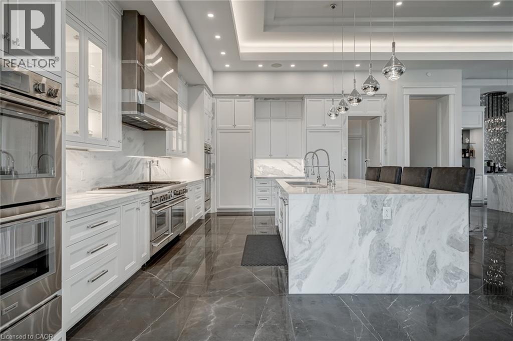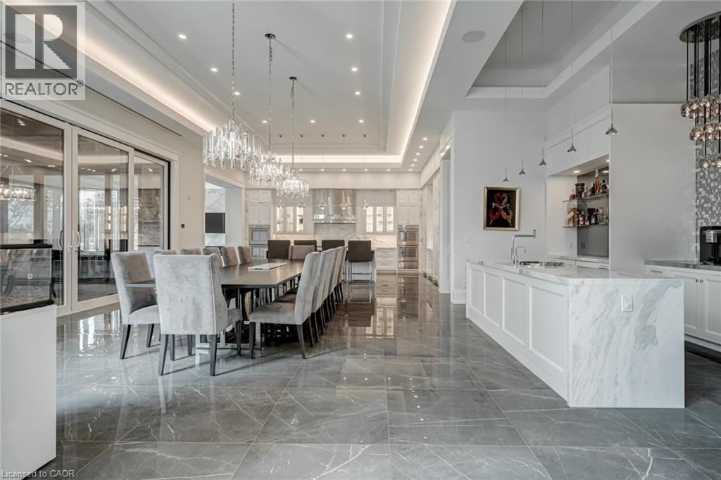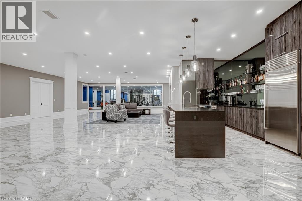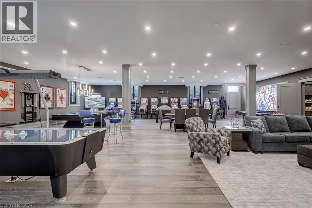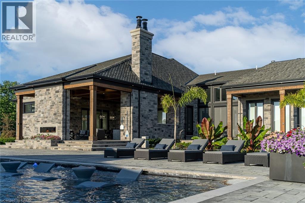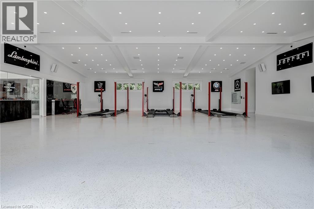 Set amidst a 5.2-acre estate, this extraordinary 32,000+ sq ft mansion offers unparalleled luxury and privacy. The gated and secured property features a stunning 1/3-acre aerated pond leading to a sprawling contemporary bungalow with lofted in-law quarters and a 5,210 sq ft detached garage with lounge, wash bay, and private gas pump—ideal for car enthusiasts.Surrounded by serene countryside, yet minutes from the heart of Ancaster, the renowned Hamilton Golf & Country Club, and Highway 403, offering both seclusion and convenience. Inside, every room showcases soaring 14 to 18-foot custom moulded ceilings, 32-inch porcelain flooring, and the highest quality materials and craftsmanship. The state-of-the-art home features whole-home automation by Control4. Spacious living areas feature custom granite walls with Town & Country fireplaces. A gourmet kitchen is equipped with top-tier appliances, including Sub-Zero, Thermador, and Miele. The luxurious lanai is perfect for entertaining, with heated Eramosa flagstone, a full outdoor kitchen, 72” Woods gas fireplace, and phantom screens. The opulent primary suite includes a private patio with hot tub and an expansive dressing room. The ensuite features heated herringbone floors, a soaker tub with fireplace, towel warmer drawers and a digital rain shower. The opposite wing offers three additional bedroom suites, each with walk-in closets and ensuites. A Cambridge elevator provides access to the entertainer’s dream basement, with a party room, full bar, professional gym with sauna and steam shower, games room, and a state-of-the-art home theatre. This 24-seat Dolby Atmos theatre features a 254-inch screen, 24-foot ceiling height, and a Kaleidoscope movie server for the ultimate cinematic experience. Outdoor amenities include a 35’ x 75’ heated pool, a 14-person hot tub, and an entertainment cabana with a media area and hosting bar. A regulation-size sports court and a children’s playground complete this family-friendly estate. (id:64974)