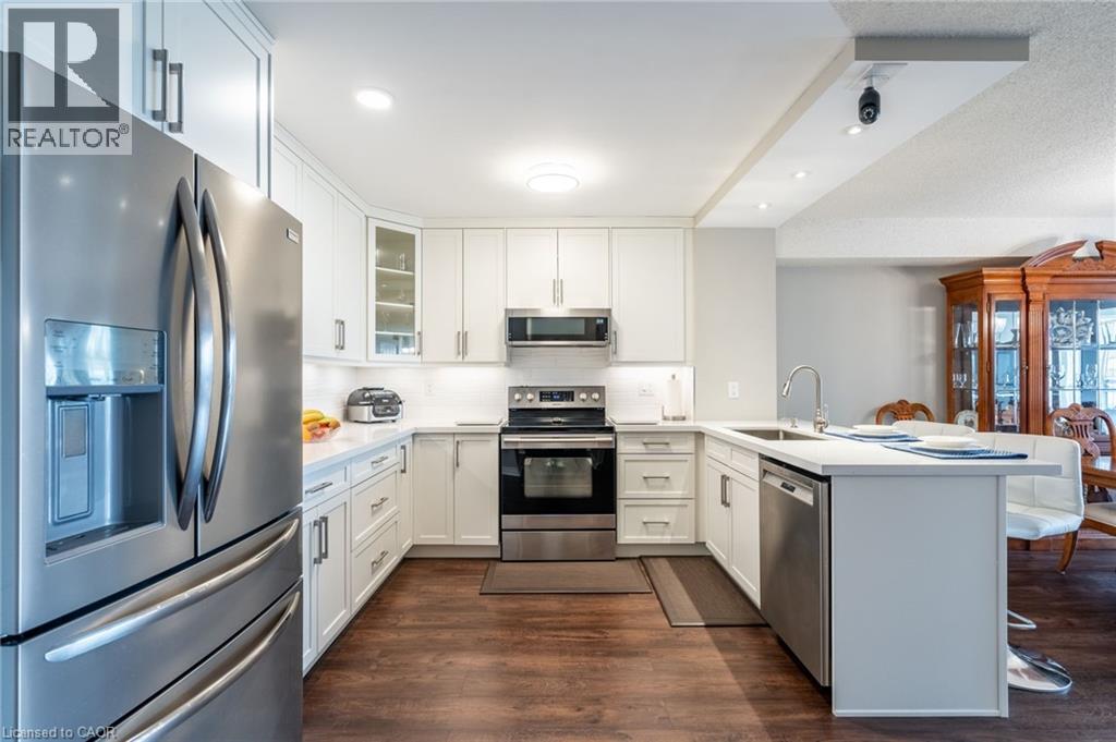Welcome to an exceptional opportunity to own a beautifully appointed two-bedroom + den, two-bathroom suite in one of Burlington’s most prestigious addresses. Set in Burlington’s vibrant south core, residents enjoy unparalleled access to the lakefront, scenic parks, fine dining, boutique shopping and top-tier healthcare at nearby Joseph Brant Hospital – all just minutes from your door. Spanning approximately 1,130 square feet, this thoughtfully designed residence offers refined living with a seamless blend of comfort and sophistication. The spacious primary suite features a private four-piece ensuite, while the expansive open-concept living and dining areas provide an ideal setting for entertaining. The stylish eat-in kitchen is enhanced by granite countertops and a charming dinette – ideal for enjoying your morning coffee with panoramic views. Freshly painted and finished with engineered wood flooring throughout, the suite is bathed in natural light and showcases breathtaking views of the Bay and the Escarpment, creating a truly exceptional, elevated living experience. The Grande Regency is an meticulously maintained, smoke-free and pet-free building known for its discreet luxury and first-class amenities, including: 24-hour concierge and security, outdoor pool and sun deck, tennis and racquetball courts, state-of-the-art fitness Centre, sauna and private library, rooftop terrace with BBQ lounge and stylish party room and well-appointed guest suites. All-inclusive condo fees cover utilities, high-speed internet, cable and one underground parking space – delivering effortless convenience in a building celebrated for its exceptional service and lifestyle. Don’t be TOO LATE*! *REG TM. RSA. (id:64974)