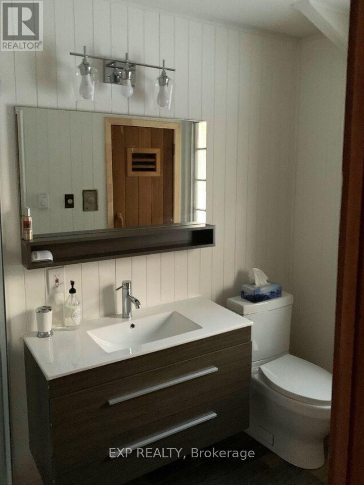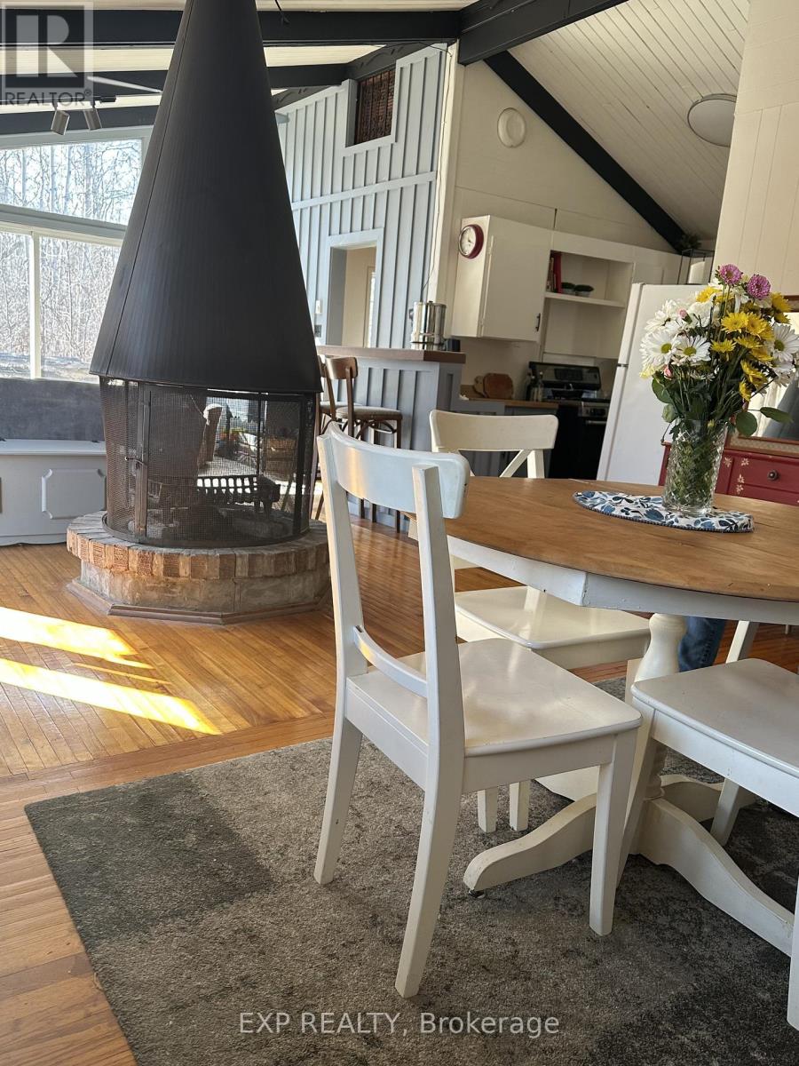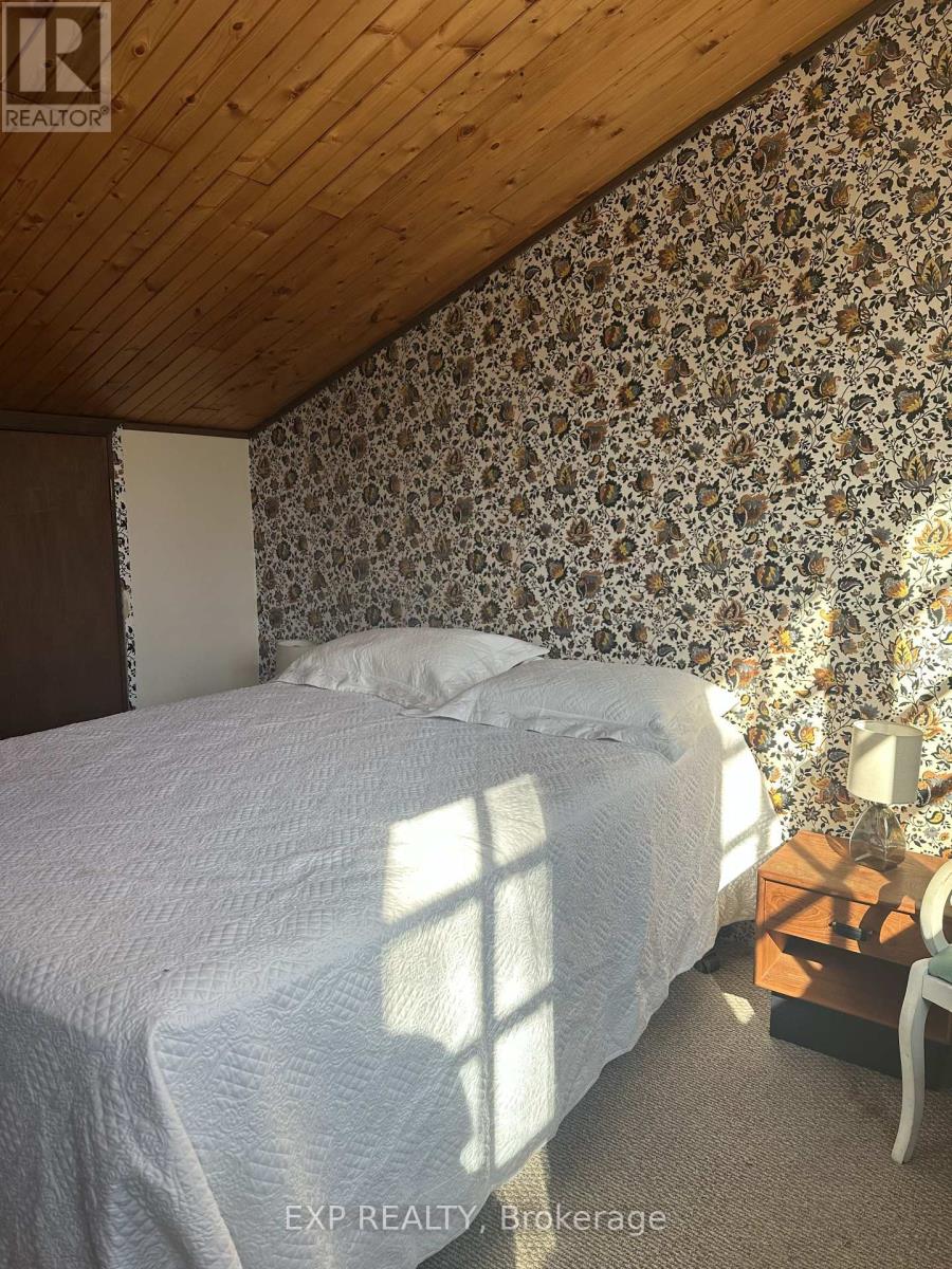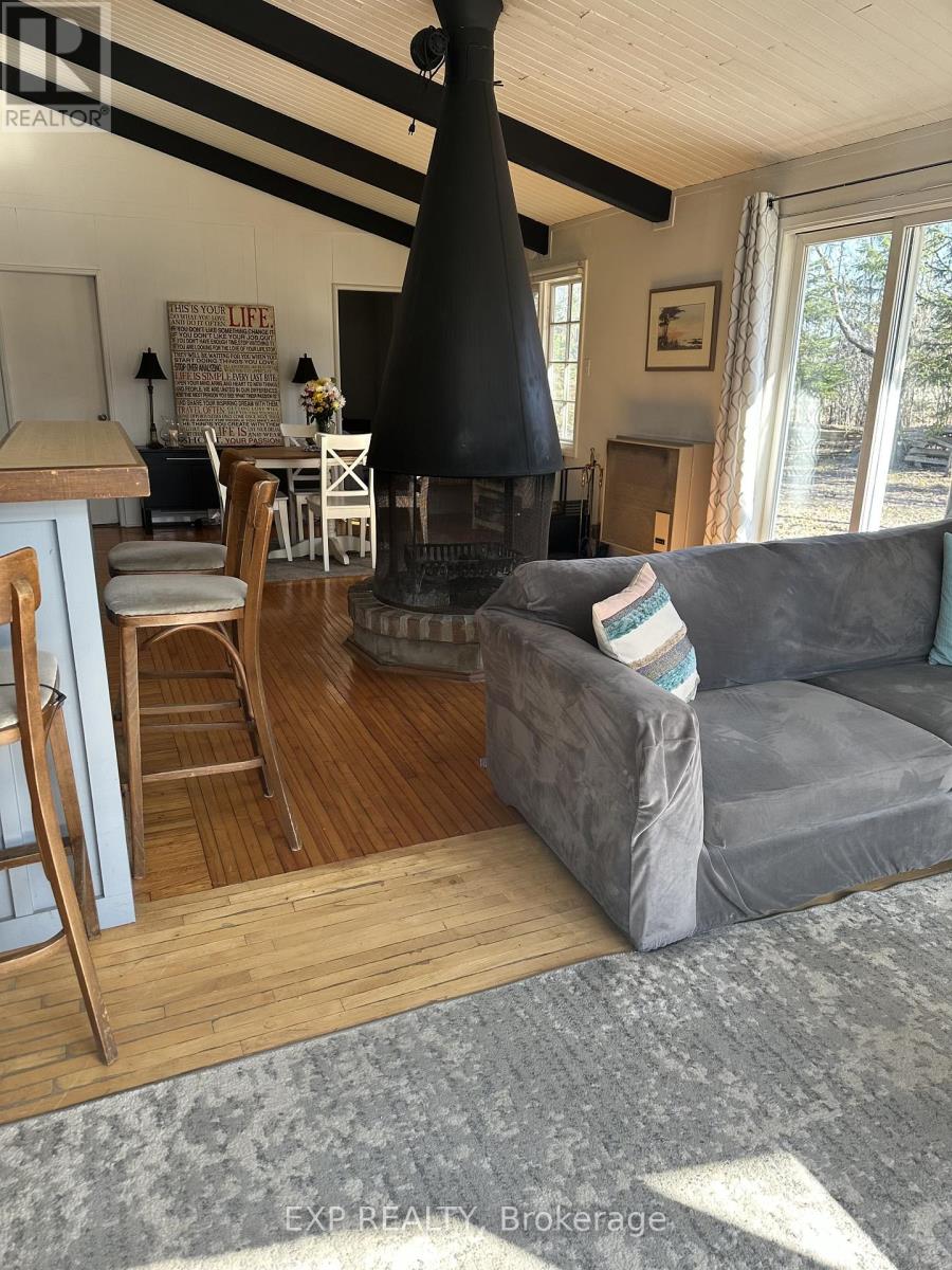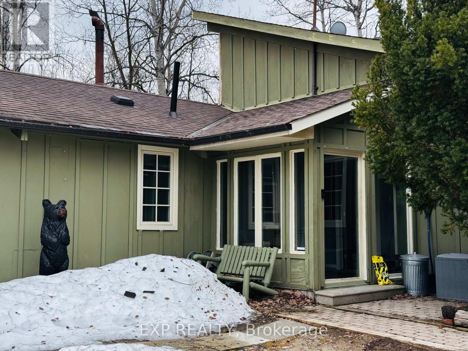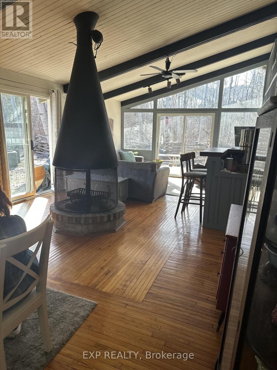Pet-Friendly Annual Lease Within Walking Distance to Blue Mountain Village Available June 1st. This charming 4-bedroom, 1.5 bath chalet offers an unbeatable four-season lifestyle and the privacy of a forested half acre lot. The main floor features 3 cosy bedrooms, an open-concept kitchen, dining, and living area with vaulted ceilings and a central wood-burning fireplace, a den, and main floor laundry. Two patio doors open to a private backyard, and there is ample parking for family and guests. Upstairs, a fourth bedroom with retro charm offers views of the ski hills, adding to the chalet's character and warmth. After a day outdoors, unwind in your own private sauna. A new metal roof is being installed in May, offering added durability and peace of mind. All of this within walking distance to the Blue Mountain Village's restaurants, shops, ski lifts, and hiking trails, while still enjoying privacy and quiet at home. (id:64974)