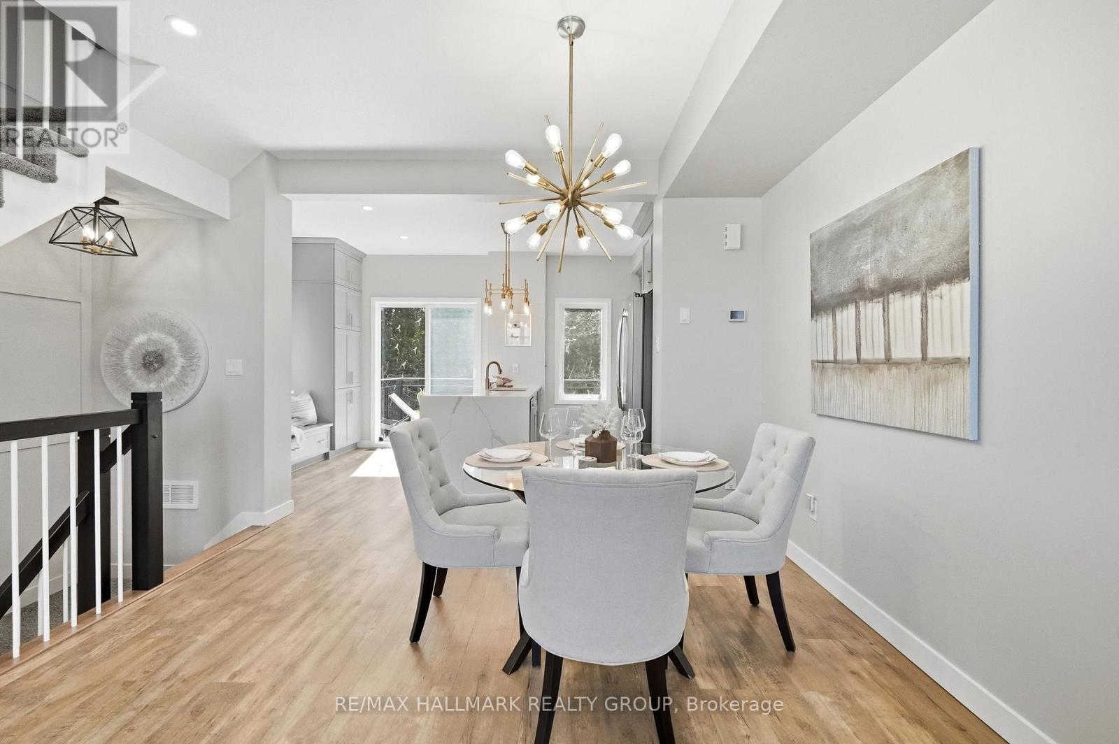Welcome to this beautifully renovated end-unit townhouse backing onto NCC forest, offering the perfect blend of modern sophistication and everyday comfort. Step inside to a welcoming, spacious entryway complete with a convenient powder room and a flexible den, perfect for a home office or additional living space. The second floor showcases a bright, sun-filled open-concept layout designed for both everyday living and entertaining. The fully renovated kitchen features sleek finishes and a stunning waterfall island, seamlessly connecting to the dining area and inviting living room with a cozy gas fireplace with a floor-to-ceiling stone façade. From the kitchen, step out onto the private balcony overlooking nature; an ideal spot to unwind and enjoy the tranquility of the surroundings. Upstairs, the third level offers two well-appointed bedrooms, including a generous primary with a large closet, along with a stylish 4-piece bathroom. An additional den with a large window provides excellent flexibility and could easily be converted into a third bedroom. Rich vinyl flooring throughout all levels adds warmth and timeless elegance. Outside, enjoy a private, fully fenced backyard complete with a wooden deck and 2 storage sheds. Backing directly onto NCC land, this property offers exceptional privacy and immediate access to scenic walking and biking trails. Conveniently located with quick access to Highways 416 and 417, and located only a few minutes away from DND and RCMP Headquarters. This turnkey home is a rare opportunity in a sought-after location; book your showing today! (id:64974)