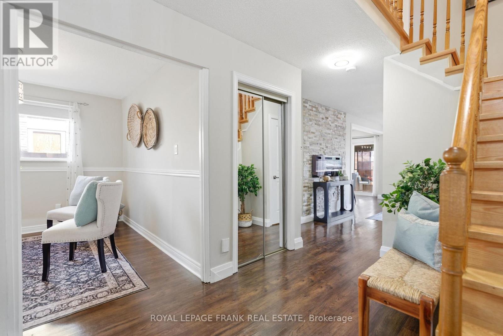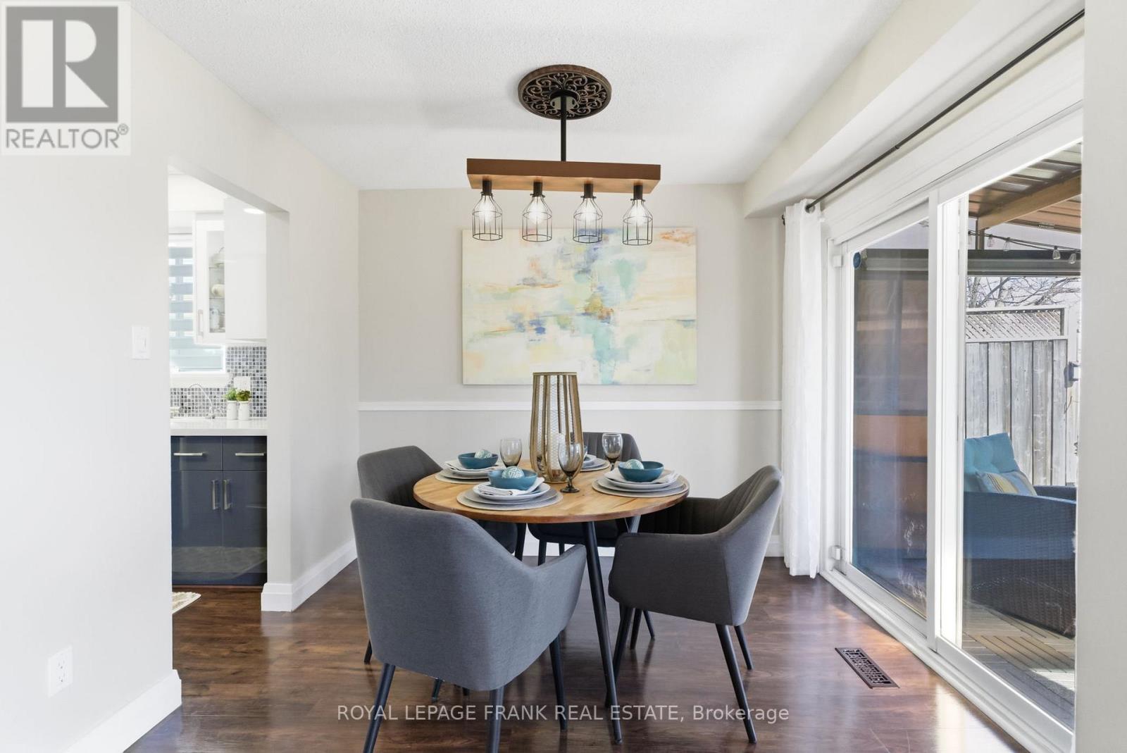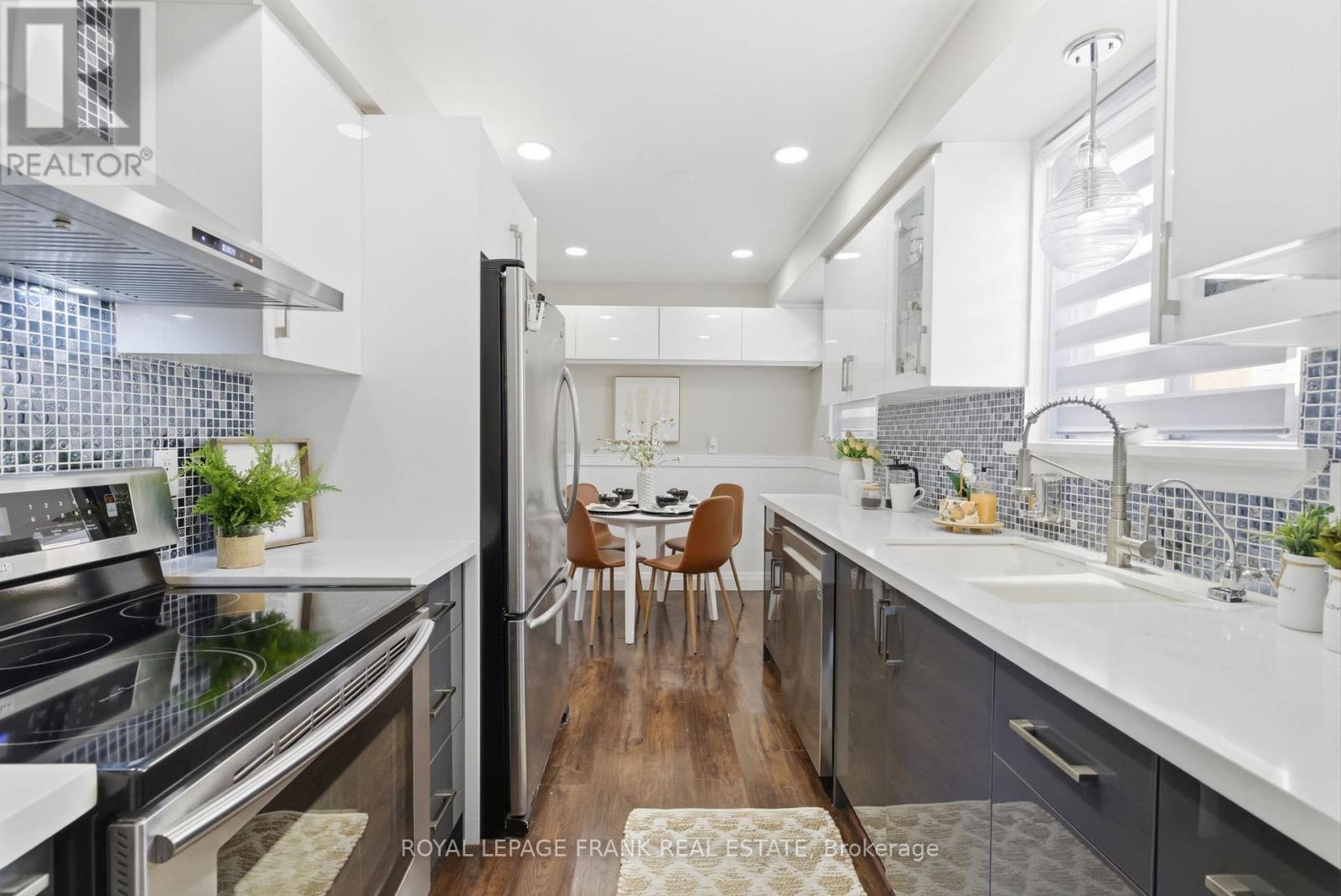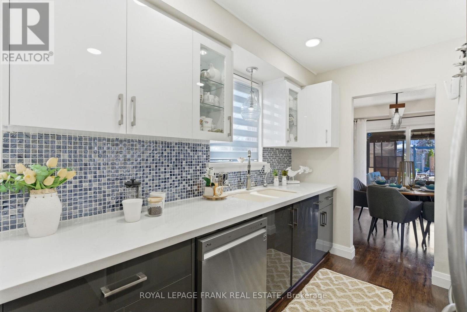 Offers anytime! Welcome to the perfect family home located in the desirable Eastdale neighbourhood of Oshawa. This beautifully updated 3 bedroom home provides plenty of space for a growing family. The remodelled modern kitchen features upgraded cabinetry, quartz countertops, stainless appliances, backsplash and pot lights. The dining area walks out to a covered gazebo and fully fenced landscaped backyard - perfect for entertaining. There are two separate living rooms - one which can be used as a convenient home office. Upstairs, you'll find 3 generous sized bedrooms. The primary bedroom includes a walk-in closet and updated semi-ensuite with a soaker tub and glass shower. The basement is fully finished, featuring a dry bar and plenty of storage space. Parking for 2 vehicles in the driveway. Close to schools, parks, public transit, all amenities and 401 access. New A/C in 2025. Kitchen renovated in 2021. Luxury vinyl plank flooring in basement and main level updated in 2021. Refinished driveway in 2025. ** This is a linked property.** (id:64974)