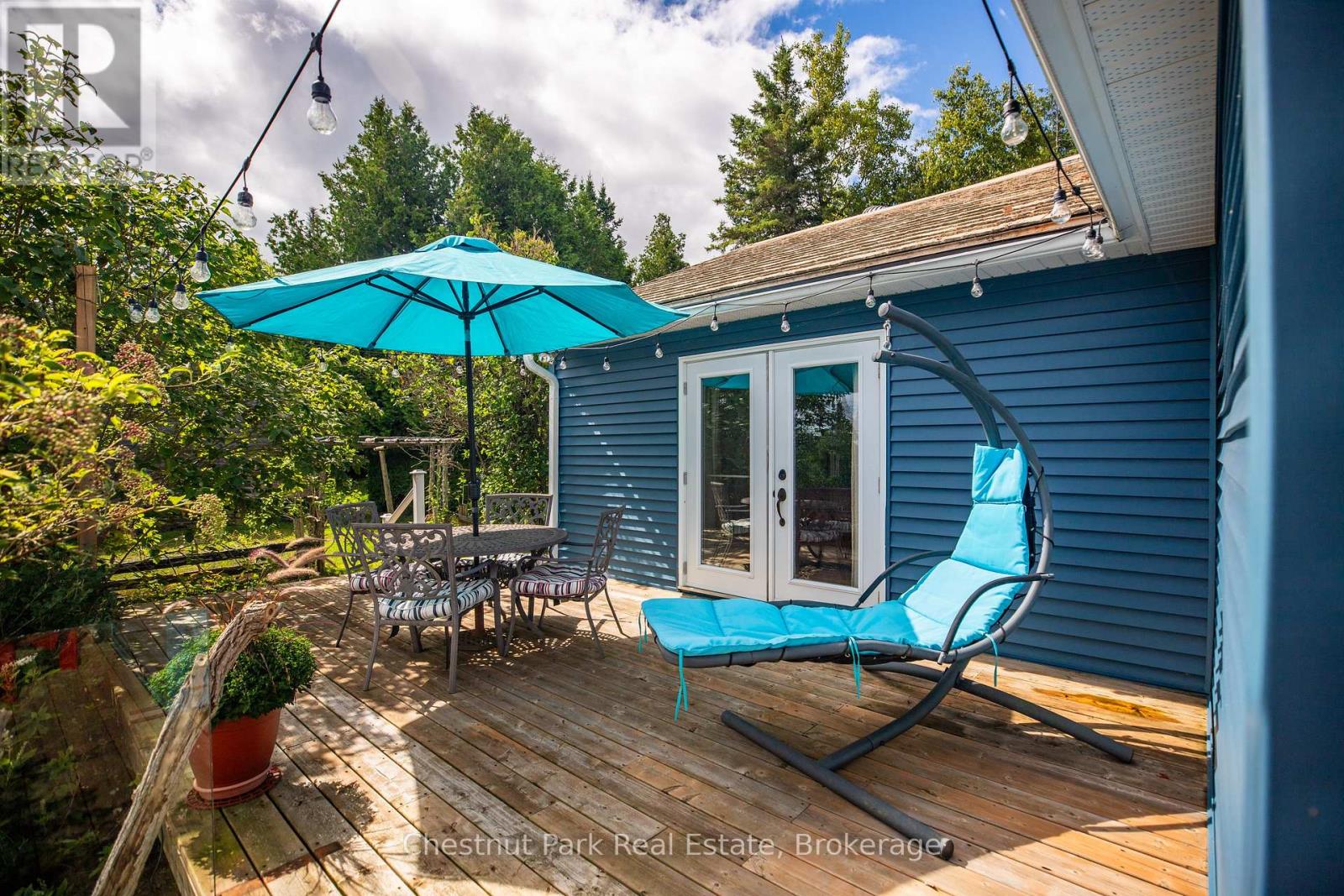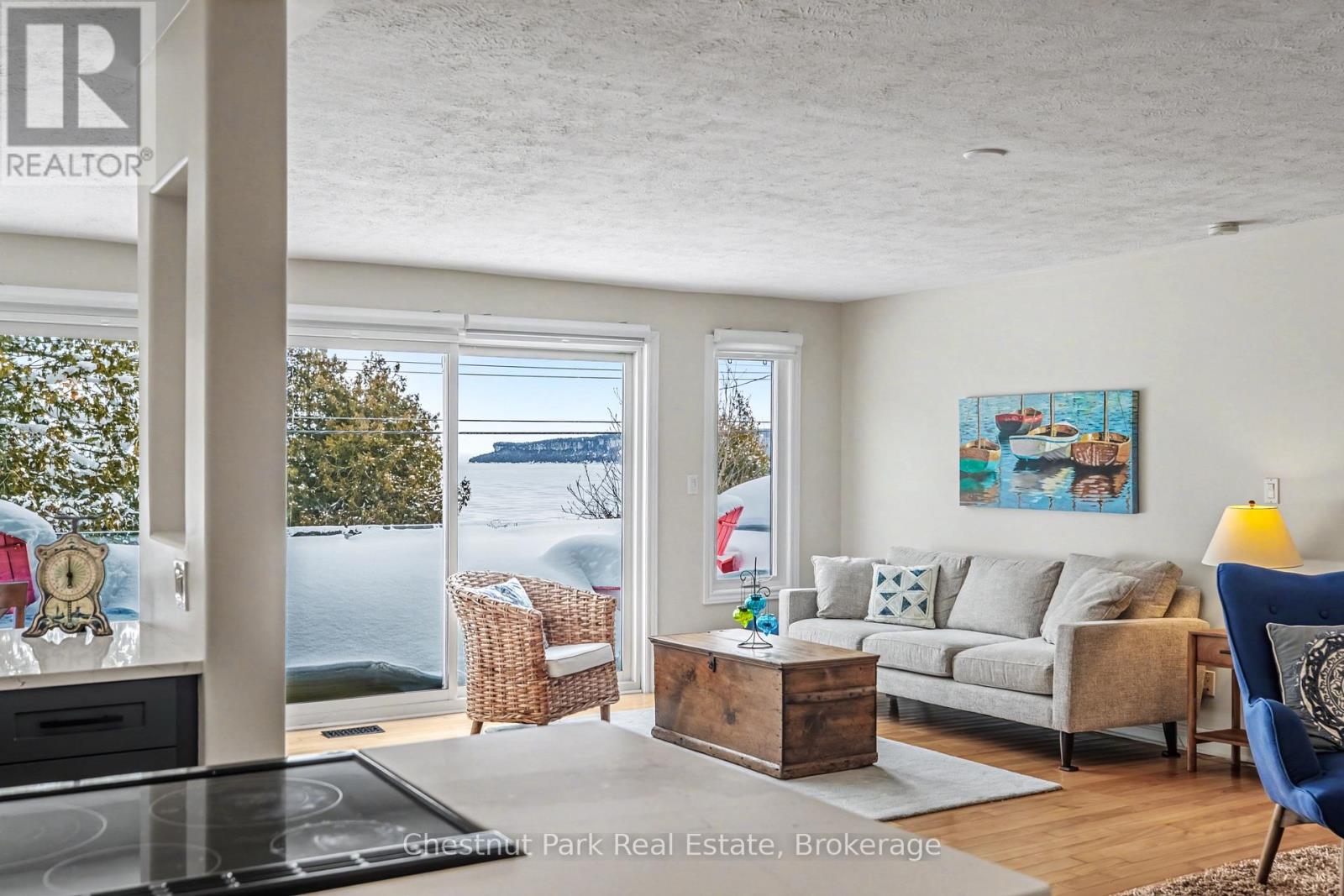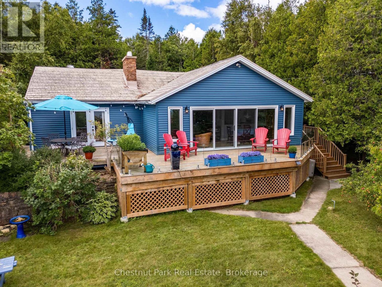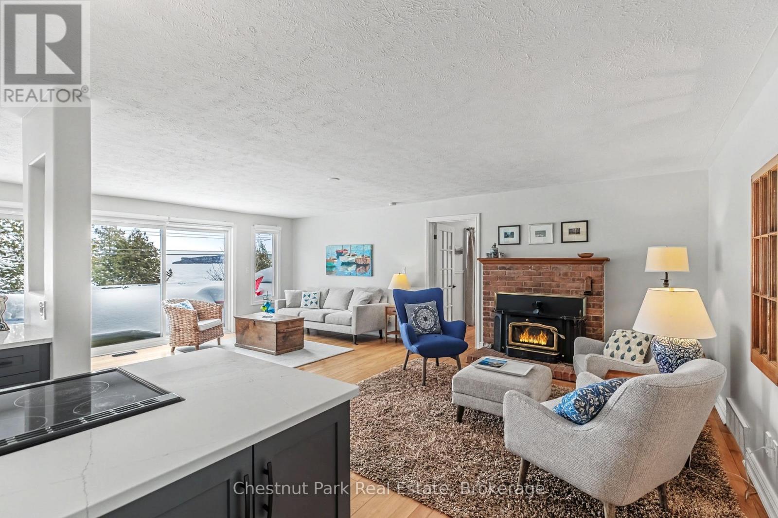 Set along the coveted shores of Isthmus Bay near Lion's Head, this exquisitely renovated, year-round 3-bedroom, 2-bath waterfront residence offers refined living on Georgian Bay. With 75 feet of pristine shoreline, two lots and uninterrupted bay views, the property provides direct access to crystal-clear, Caribbean-blue waters and iconic Bruce Peninsula scenery. The home showcases Manitoulin beechwood floors, a designer kitchen, oversized double patio doors, and a comprehensive suite of upgrades including new siding, windows, doors, and expansive decks that seamlessly connect indoor and outdoor living. Spacious bedrooms with generous storage, an inviting fireplace, and light-filled living spaces create an atmosphere of comfort and sophistication, ideal for both private retreats and elegant entertaining. Across the road, the separate waterfront parcel features a detached double garage with loft and a water-side deck, offering plenty of potential space for accommodating guests, pursuing hobbies, or enhancing the estate's versatility. With a rare flat rock shoreline, multiple outdoor lounging areas, and breathtaking Georgian Bay sunsets, this turn-key offering, on almost half an acre of land, represents a premier opportunity to own a distinguished waterfront escape on the Bruce Peninsula. (id:64974)