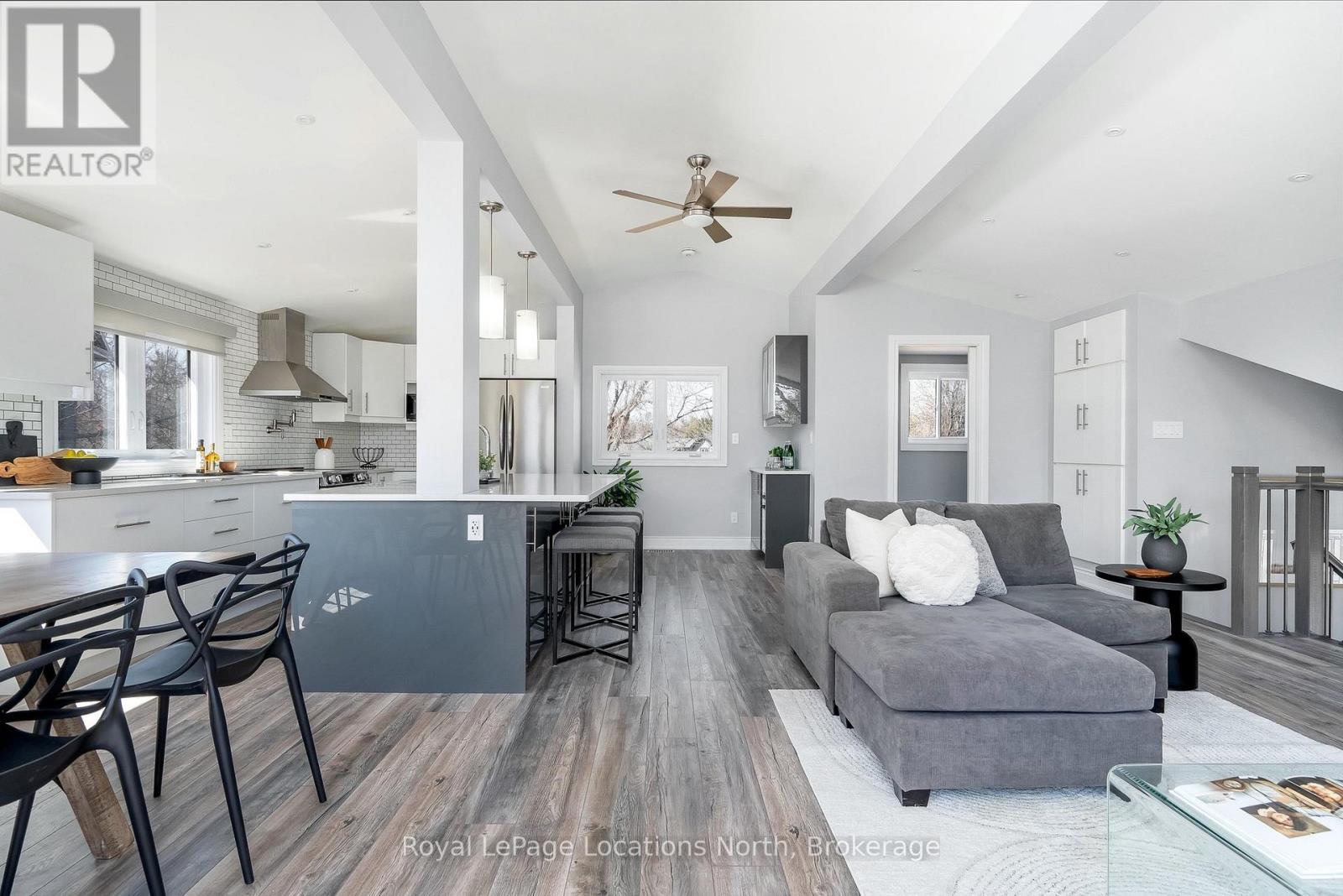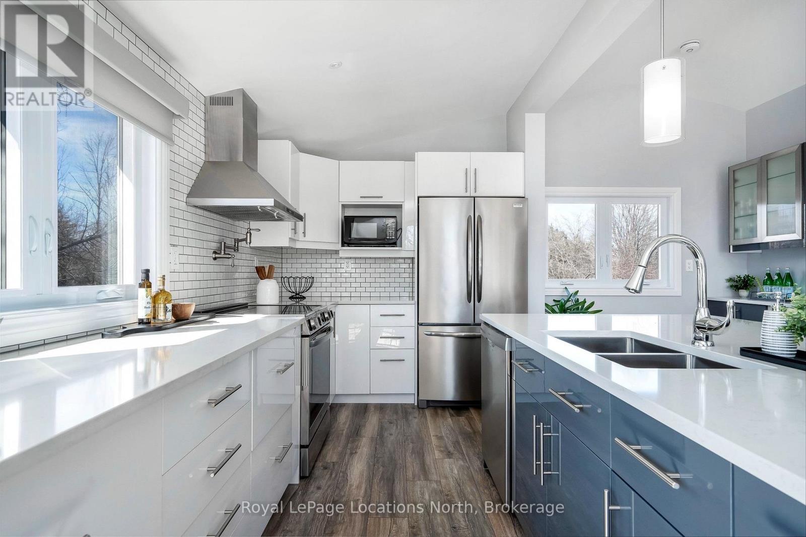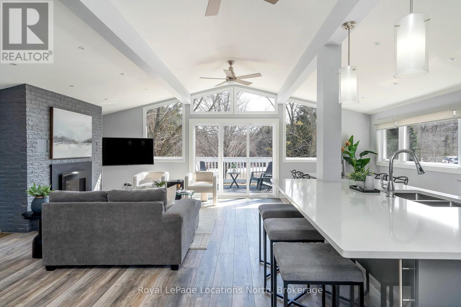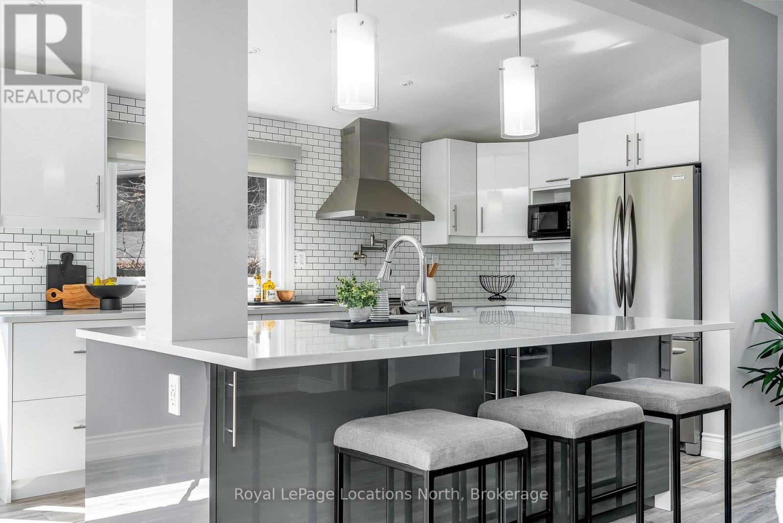 This beautifully upgraded home offers a perfect blend of modern luxury and comfort while maintaining the charm of a 70s chalet. Every detail, from the windows to the showerheads, has been thoughtfully designed. The main living area in this side-split layout is just a few steps up from the foyer and opens into a bright, spacious great room filled with natural light. Enjoy stunning sunset views, cozy up by the gas fireplace, or admire the smart layout of a spacious kitchen island, complete with a pot filler over the stove and built-in storage. Stylish blinds throughout allow you to control how much sunlight enters, creating a warm and inviting atmosphere. The foyer itself is practical, with a mudroom, a laundry closet, and a convenient three-piece bathroom with easy access to the outdoors. A few steps down from the foyer lead to the charming sleeping quarters - three cozy bedrooms and a well-designed shared four-piece bathroom with a heated floor for added comfort. Located in the peaceful Swiss Meadows community at the top of Blue Mountain, this area offers oversized lots and a calm, scenic setting typical of this quiet, mature neighborhood. It's a perfect base for skiing and ski lifts are within walking distance. You can also hike the nearby Bruce Trail, explore the Scenic Caves, or take a short drive to Collingwood or Blue Mountain Village. After a day of adventure, relax on your deck or gather around the fire pit to enjoy community events that create a friendly, welcoming atmosphere. (id:64974)