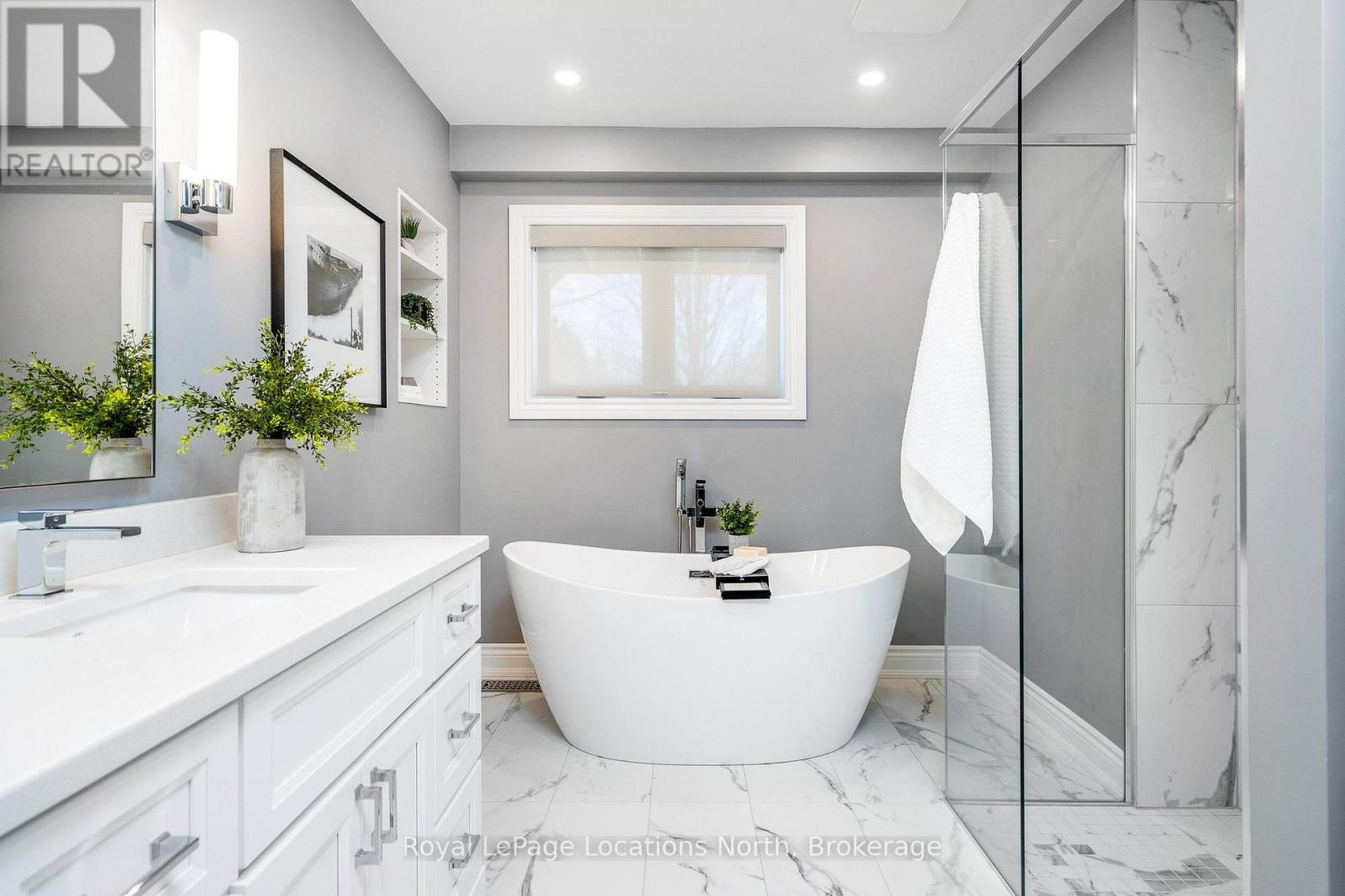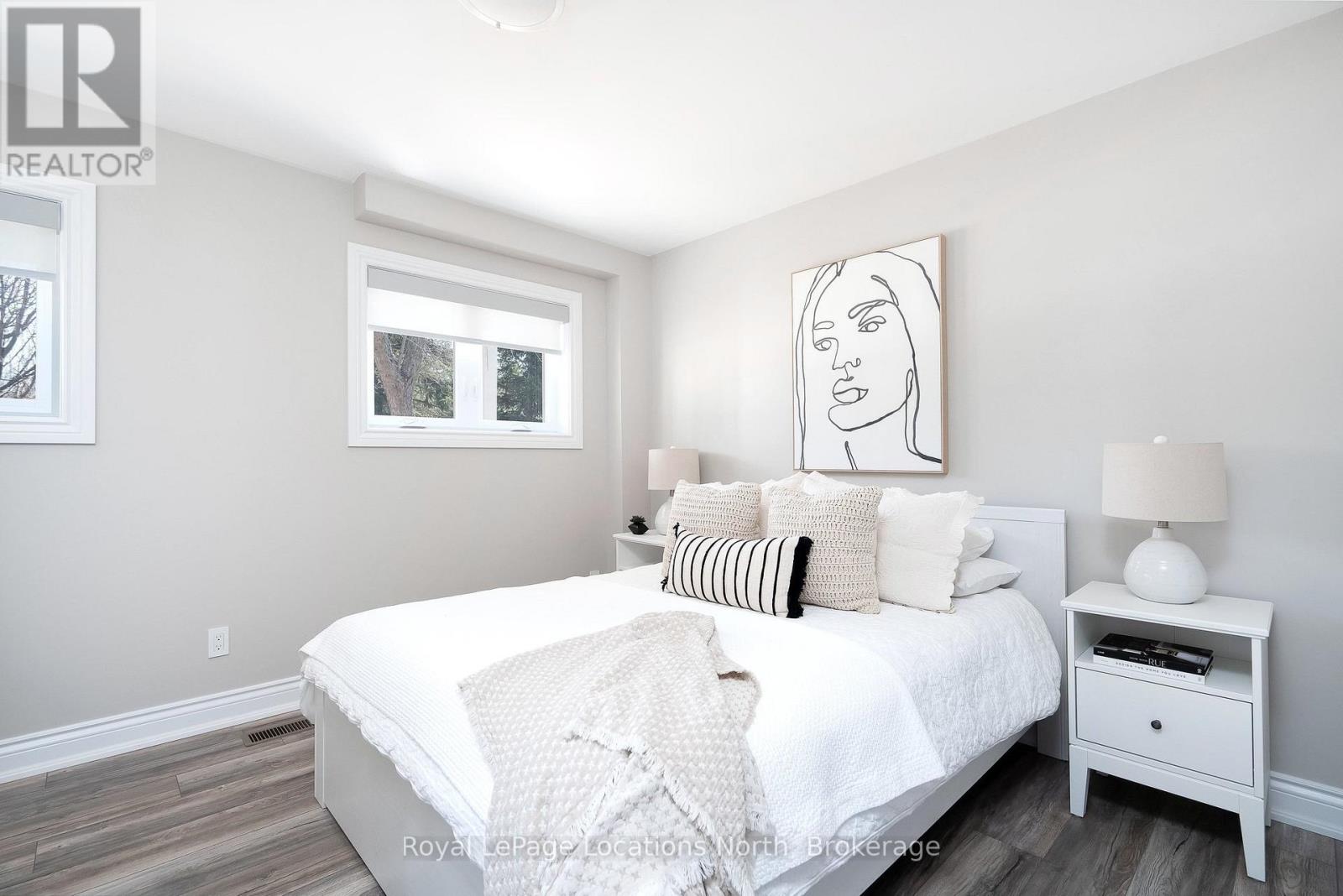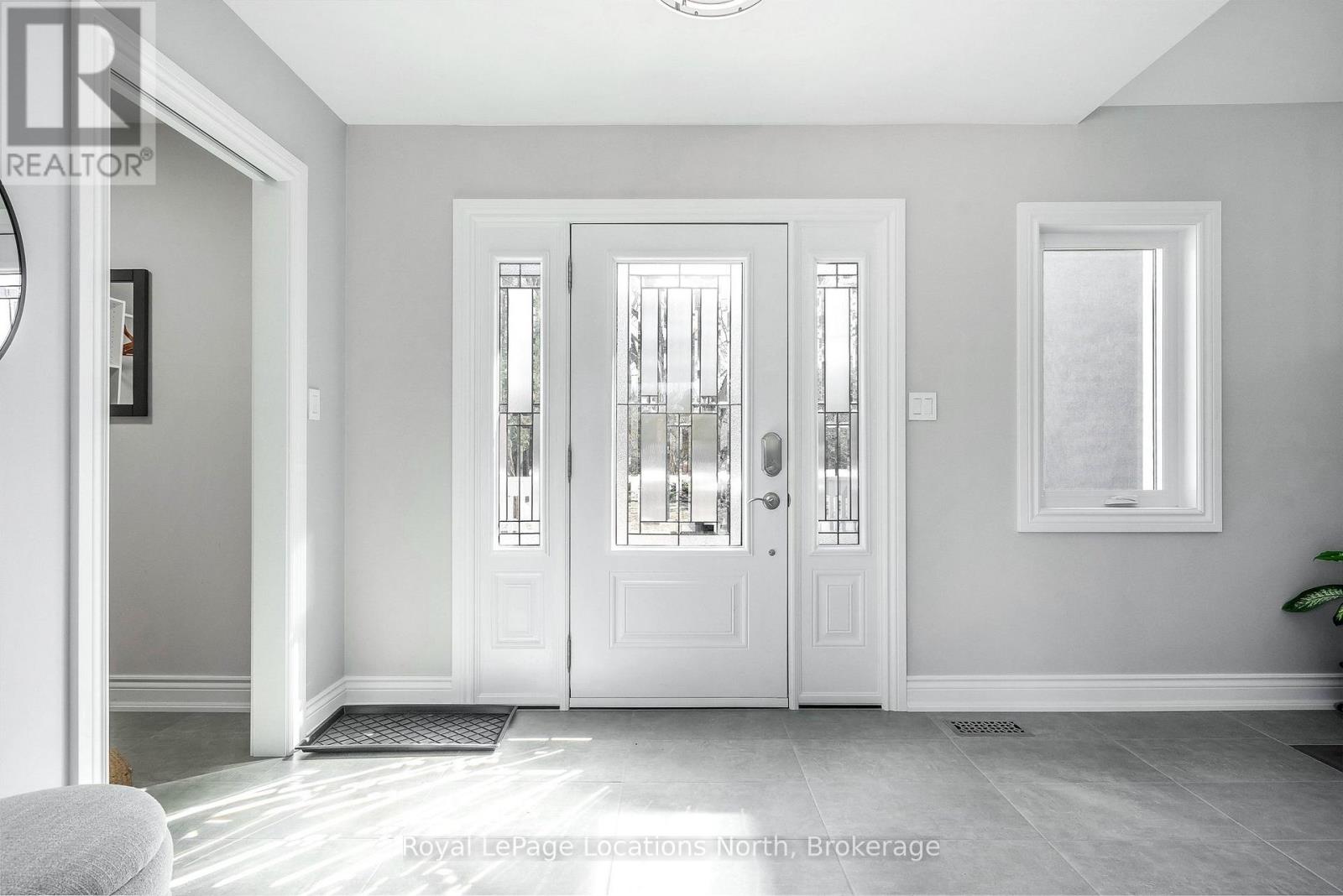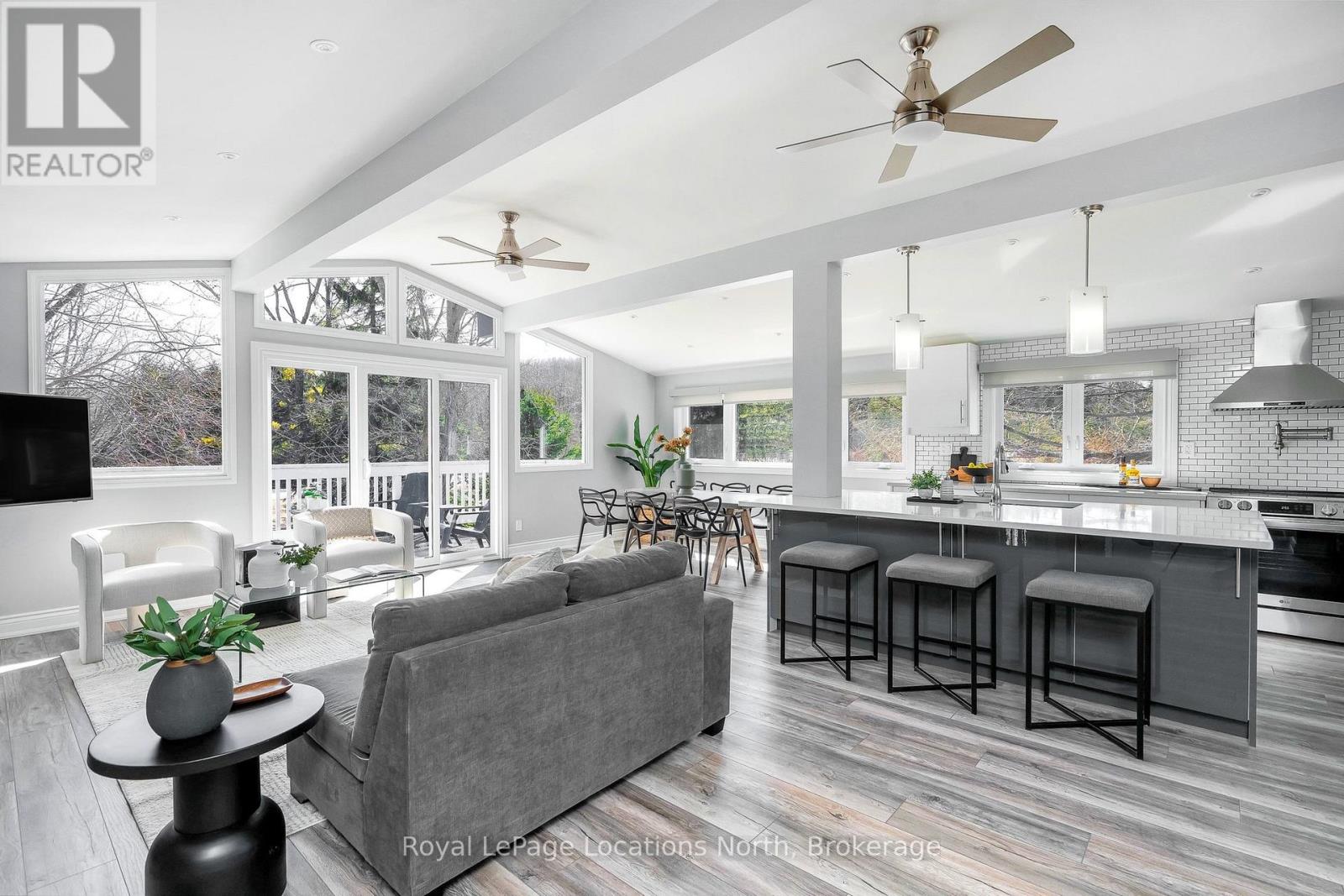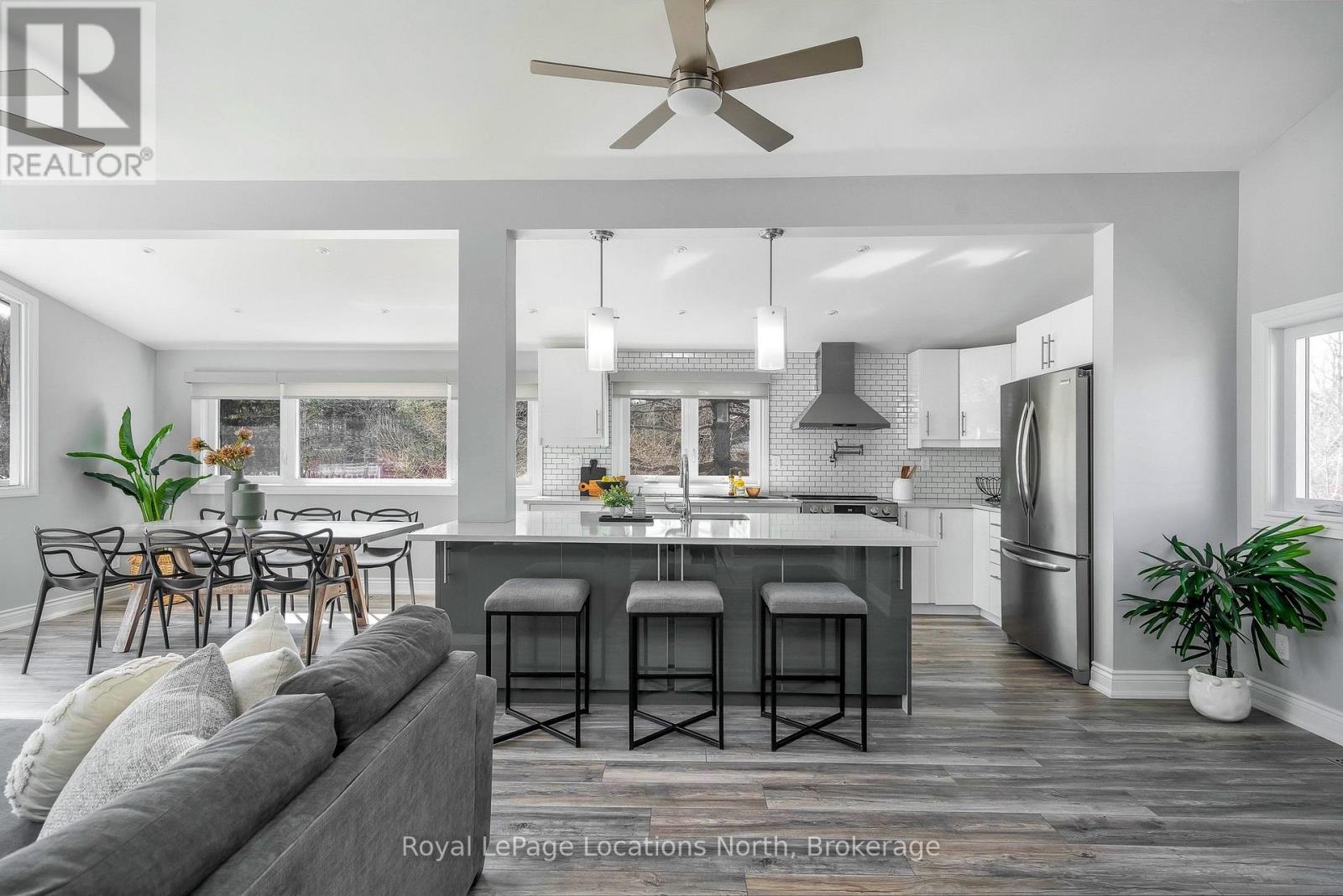 This beautifully upgraded home offers a perfect blend of modern luxury and comfort while maintaining the charm of a 70s chalet. Every detail, from the windows to the showerheads, has been thoughtfully designed. The main living area in this side-split layout is just a few steps up from the foyer and opens into a bright, spacious great room filled with natural light. Enjoy stunning sunset views, cozy up by the gas fireplace, or admire the smart layout of a spacious kitchen island, complete with a pot filler over the stove and built-in storage. Stylish blinds throughout allow you to control how much sunlight enters, creating a warm and inviting atmosphere. The foyer itself is practical, with a mudroom, a laundry closet, and a convenient three-piece bathroom with easy access to the outdoors. A few steps down from the foyer lead to the charming sleeping quarters - three cozy bedrooms and a well-designed shared four-piece bathroom with a heated floor for added comfort. Located in the peaceful Swiss Meadows community at the top of Blue Mountain, this area offers oversized lots and a calm, scenic setting typical of this quiet, mature neighborhood. It's a perfect base for skiing and ski lifts are within walking distance. You can also hike the nearby Bruce Trail, explore the Scenic Caves, or take a short drive to Collingwood or Blue Mountain Village. After a day of adventure, relax on your deck or gather around the fire pit to enjoy community events that create a friendly, welcoming atmosphere. (id:64974)