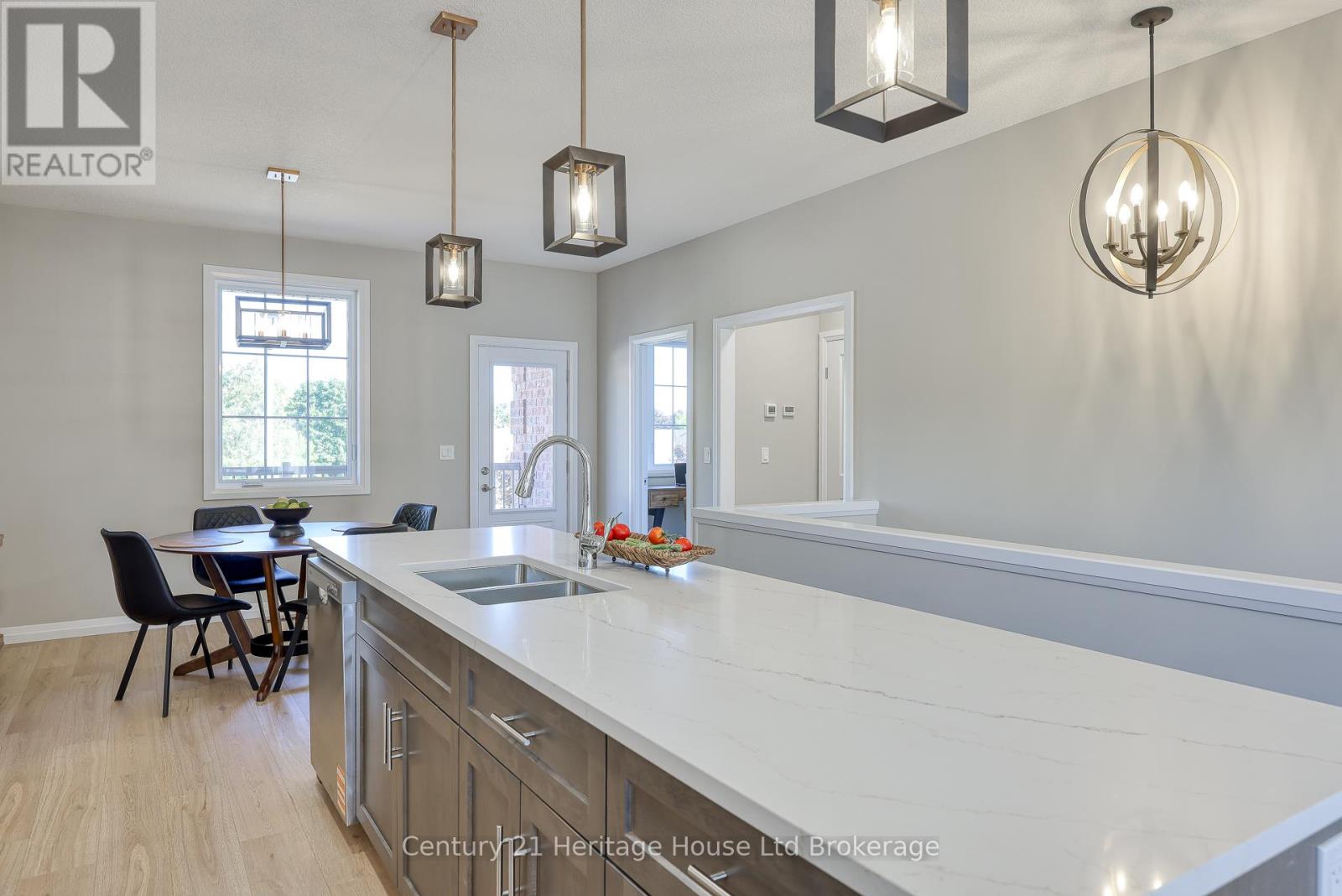 Welcome to the this home offering over 1300 sq ft of living space. Finishes for this home have been chosen providing a modern and luxurious finish. Easy deposit structure. A rare opportunity to own a brand NEW thoughtfully designed open floor plan bungalow townhouse. Buy from renowned local builder, Hunt Homes, known for their exceptional quality and craftsmanship. Ideally located close to all amenities incl. bus line, shopping, parks, 401 corridor. Step inside and experience the large windows providing generous light and open concept design. The FIRST TIME HOME BUYERS REBATES could make this NEW home the home of your dreams. This home qualifies for the FIRST TIME HOME BUYER FEDERAL AND PROVINCIAL REBATES-first time home buyer eligibility, rebate amounts, and application are subject to government programs and buyer qualification-inquire for details. Enjoy east-facing morning sun from your dinette with a walk-out to your own balcony, and west-facing sunsets from the great room with 6 ft patio doors leading to your 10x12 deck. Designed with lifestyle in mind this modern boasts soaring 9' ceilings throughout the main floor creating an airy ambiance. Chef's kitchen with crown molding, under-cabinet lighting, cabinet valance, large island with breakfast bar ideal for both casual dining and hosting. Generous primary suite w/3-piece Ensuite featuring a tile and glass walk-in shower, and the spacious second bedroom with a nearby 4-piece bathroom with tiled tub surround. Ask about our lower level finish which includes a family rm, bedroom and 3 pc bath. Accessibility features such as ability for level entrance with wheelchair access, we've even completed the rough in for an interior elevator. There is a single-car garage, paved driveway, fully sodded lot, central air, Energy Recovery Ventilator (ERV) for improved air quality and humidity control. New Build taxes to be assessed. Open House at 331 Anderson Sat/Sun 1-4 pm. (id:64974)