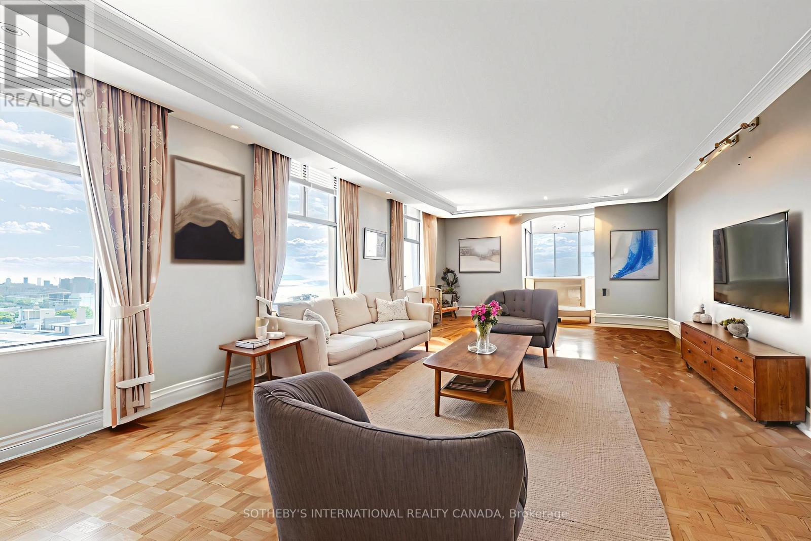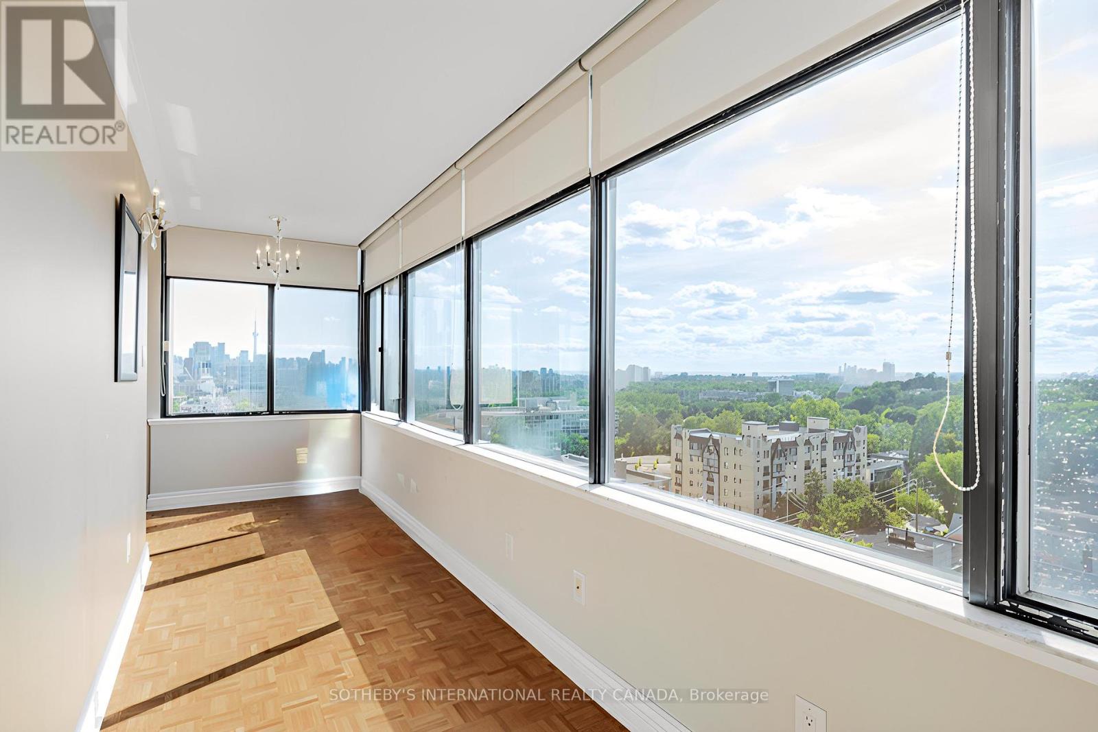Spectacular 360 city views at Yonge/Avenue & St. Clair! Welcome to a rare offering in one of Toronto's most sought after neighbourhoods. With direct elevator access into the suite, this residence occupies an entire floor, providing approx. 1,823 sq.ft. of luxurious living space with unobstructed, panoramic views of the city skyline. The suite features 2 spacious bedrooms/2.5 baths plus a versatile den/sunroom, perfect as a home office, reading lounge, or creative space. The enclosed sunroom is a serene retreat with breathtaking outlooks in every direction. Recent upgrades complement the open-concept living and dining area, highlighted by built-in bookcases, pot lighting, and elegant parquet flooring throughout. A renovated kitchen with granite counters and premium appliances offers both style and function. The primary bedroom boasts a 5-piece ensuite, while the second bedroom includes its own 3-piece ensuite, ensuring privacy and comfort. With one unit per floor, you will enjoy exceptional privacy and an elevated sense of exclusivity. Additional conveniences include ensuite laundry, use of one underground parking space, and one out-of-suite locker. Located just steps to shops, dining, parks, schools, and the TTC, this residence combines luxury with unmatched convenience in the heart of Toronto. **Some photos have been virtually staged. (id:64974)