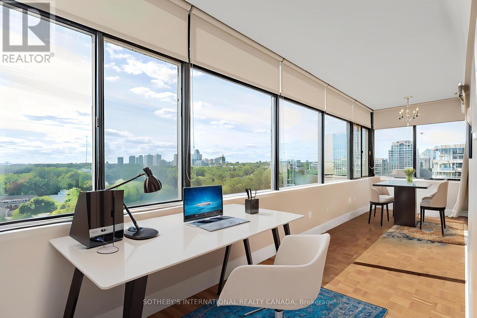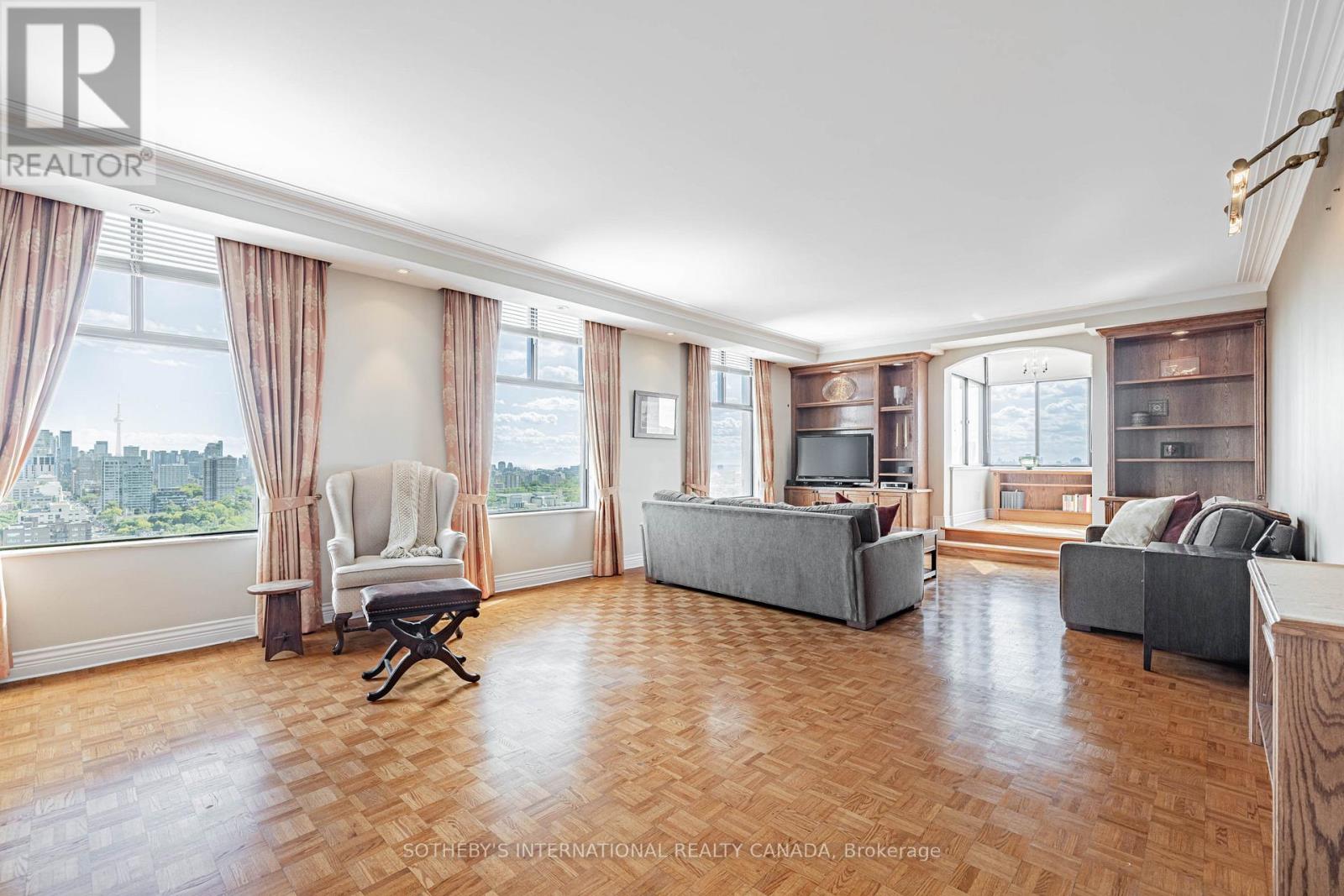 Spectacular 360 city views at Yonge, Avenue & St. Clair. A rare full-floor residence in one of Toronto's most established and desirable neighbourhoods. Direct elevator access opens into approximately 1,823 square feet of refined living space, wrapped in unobstructed panoramic skyline views from every angle.Designed for both comfort and impact, the suite offers 2 generous bedrooms, 2.5 baths, and a flexible den or sunroom ideal for a home office, library, or quiet retreat. The enclosed sunroom delivers a truly serene experience, surrounded by sweeping city vistas.The open concept living and dining areas are thoughtfully updated with elegant parquet flooring, custom built-in bookcases, and pot lighting throughout. A renovated kitchen features granite counters, quality appliances, and a functional layout suited to both everyday living and entertaining.The primary suite includes a well-appointed 5-piece ensuite. The second bedroom enjoys its own private 3-piece ensuite, offering comfort and privacy for guests or family.One suite per floor ensures an exceptional level of privacy and exclusivity. Additional features include ensuite laundry, one underground parking space, and an out-of-suite locker.An outstanding opportunity just steps to Yonge and St. Clair shops, restaurants, parks, top schools, and the TTC. Luxury living paired with unmatched convenience. Some photos have been virtually staged. (id:64974)