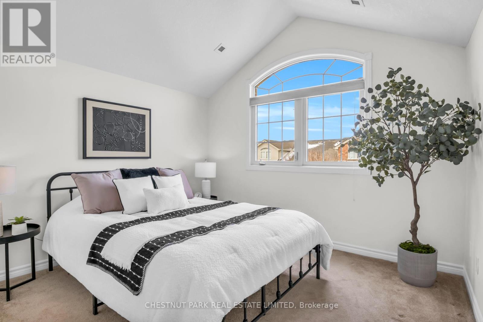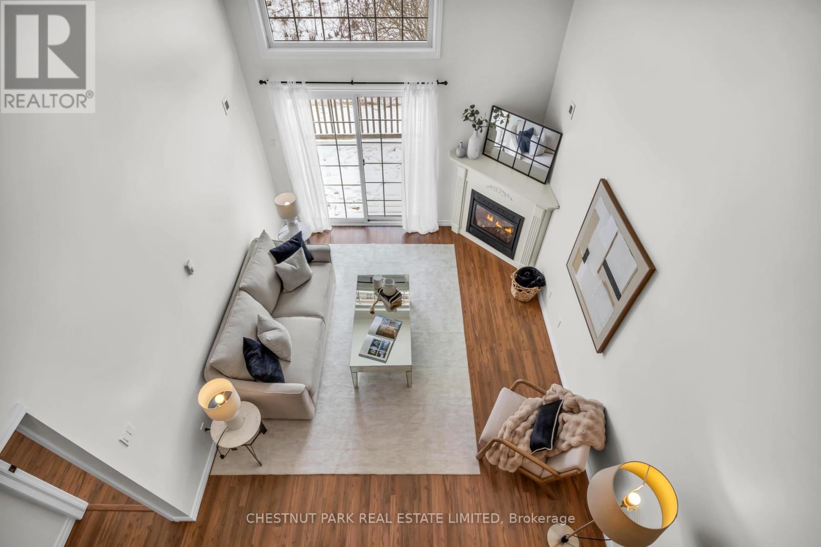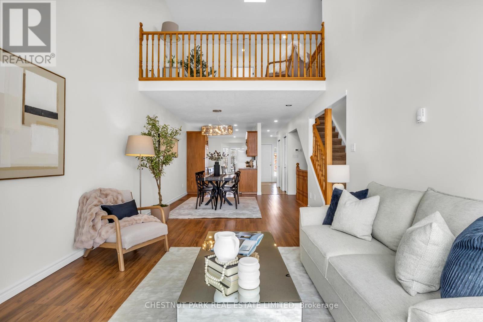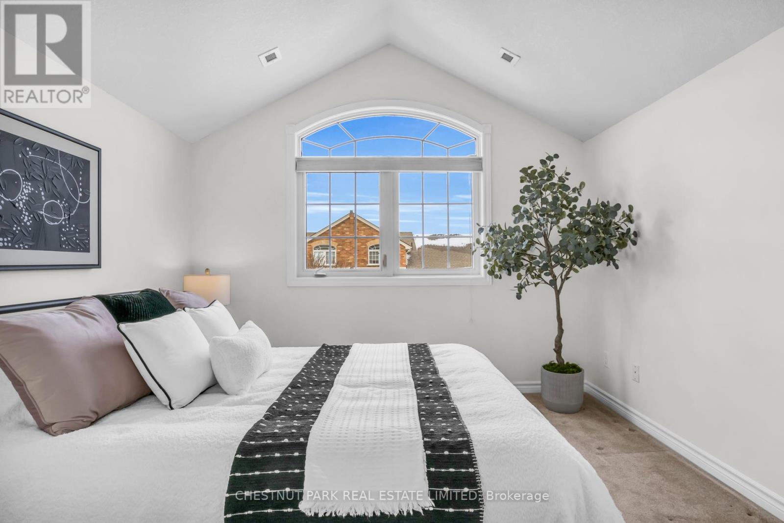 Nathan Court - Where Easy Living Finds Its Groove. There's a particular kind of ease that settles over you in a home where everything you need is right there... no stairs to negotiate, no compromise on light. That's the quiet gift of this 1,491 sf bunga-loft in the quiet Nathan Court community. East-west exposure means the sun moves through all day. Mornings arrive gently at the breakfast table framed by a bay window; evenings ease into the living room with a vaulted ceiling and, where a gas fireplace holds court and patio doors open to a private deck with a retractable awning - and an open view rather than a wall of someone else's siding.The main floor is thoughtfully connected: a galley-style kitchen flows into the dining room, which opens to the living space. All laminate underfoot in the principal rooms on the main floor, freshly painted throughout - the kind of move-in condition that doesn't need apology.The primary bedroom is generously served by a five-piece ensuite - large enough that a second sink and toilet offer easy guest access without compromise. Laundry is discreetly tucked in to the bathroom closet. Upstairs, the loft is its own quiet world: a spacious room for family or guests with a private three-piece bath, and a sitting area that works equally well as a den or home office. Carpet up here - by design, to hold the sound.The unfinished basement is a blank slate for storage or future living. Appliances included - fridge, stove, built-in dishwasher, stacked washer and dryer. And then there's Stratford itself. This city has always known how to hold culture and community in the same hand - world-class theatre, farmers' markets overflowing with local harvest, restaurants that take their craft seriously, and a walkability that puts most of it within easy reach. Nathan Court sits comfortably inside all of that... without the fuss. (id:64974)