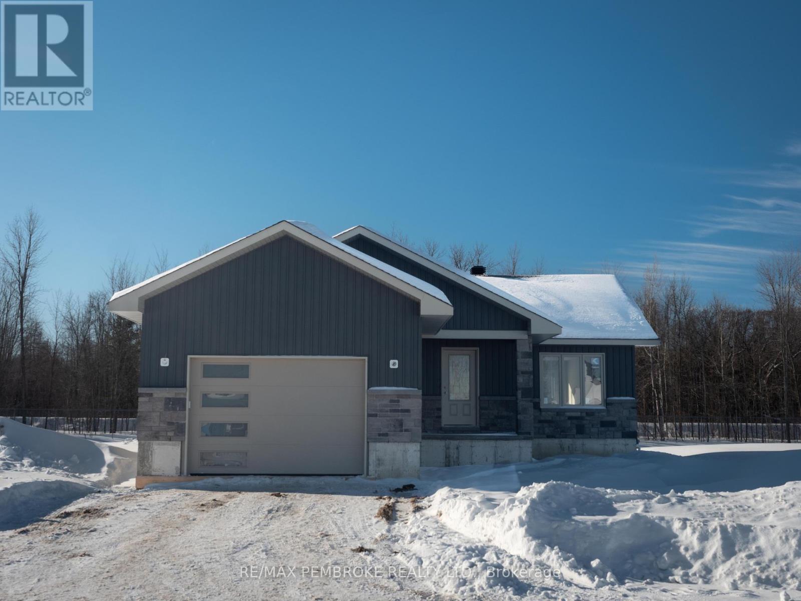 Welcome to " The Teddy" at 13 Eddy Crescent in Pembroke's desirable west end, a beautifully built brand new bungalow located in a brand new subdivision with no rear neighbours , offering the perfect blend of modern living and outdoor lifestyle. This thoughtfully designed home offers approximately 1,232 sq. ft. of bright open-concept main floor living space featuring a modern kitchen with a large center island and a spacious dining area with patio door access. The inviting living room is filled with natural light, creating a warm and welcoming atmosphere. The main level includes three bedrooms and a full bathroom, including a spacious primary bedroom, along with the convenience of an attached oversized garage. The full basement has already been framed, rough wired, and rough plumbed for a future bathroom and is laid out for a large rec room, additional bedroom, office, and storage area which can be completed prior to closing at the Buyer's option for an additional cost, offering excellent potential to expand living space and add value. Built with quality construction including an engineered truss roof system, 8-foot poured concrete foundation, HRV system, radon rough-in, R-60 attic insulation, and R-20 wall insulation, this home offers efficiency and peace of mind. Located close to schools, parks, shopping, and amenities, this move-in ready property is ideal for families, downsizers, or buyers seeking a new home with future development potential in Pembrokes newest subdivision.Purchase price includes HST with rebates signed back to the Builder. Full Tarion Warranty. Interior will be completed within two weeks and photos added (id:64974)