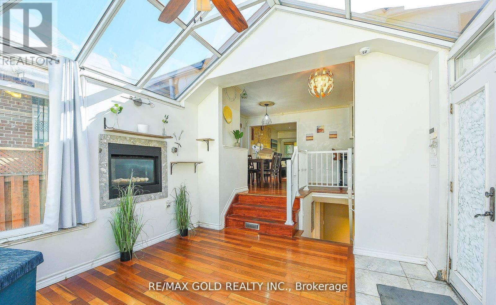 Welcome to 13 Foster Rd! This beautiful detached corner-lot home has been tastefully maintained & upgraded, featuring hardwood floors, crown moulding, and a cozy gas fireplace in the living room. The spacious primary bedroom offers a walk-in closet & semi-ensuite, while the functional kitchen includes a gas range, walk-in pantry, and serving peninsula. A stunning glass sunroom with gas fireplace and walk-out to the rear yard & garage provides year-round enjoyment. The fully finished basement boasts a rec room, 2 bedrooms, 3-piece bath, and large laundry room with built-ins. Situated on a mature landscaped lot with oversized garage, 4-car driveway & garden shed, all in a prime location near highways, transit, Malton GO, schools & amenities. (id:64974)