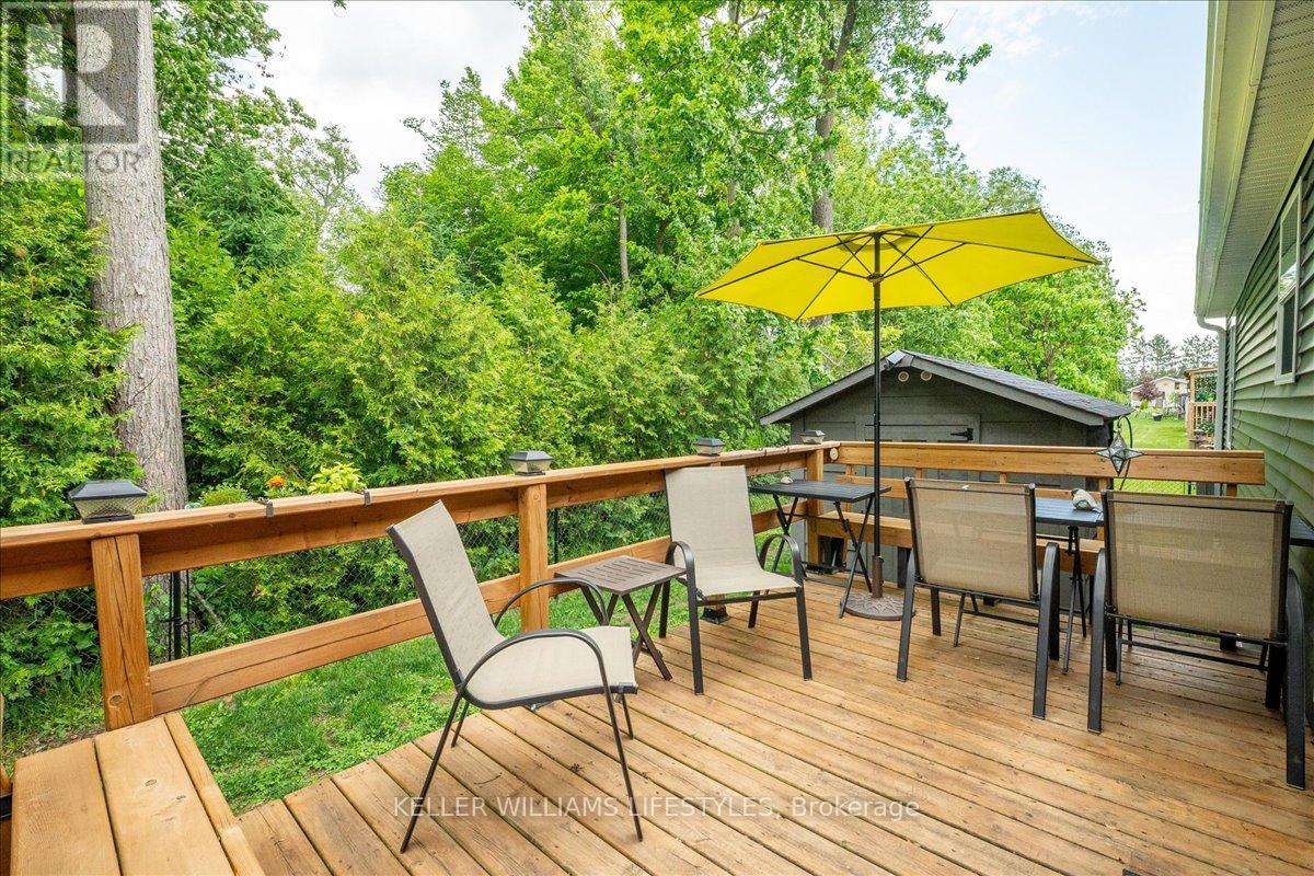 Welcome to the newest home in Twin Elm, a private, rent-controlled, adult-lifestyle land-lease community just a short walk to shopping and Caradoc Sands Golf Club.This 4-year-old, energy-efficient Titan Home sits on a clean, dry slab foundation crawlspace and includes a whole-home surge protector, 10kW Generac generator, and gutter leaf guards on all eavestroughs for low-maintenance living. Step in from the covered porch to a bright, open-concept layout with luxury vinyl plank flooring. The living room features a freestanding natural gas Valour fireplace, while the kitchen offers Whirlpool appliances, ceramic backsplash, pantry with pullouts, island with seating, and pot drawers. Convenient laundry/mechanical room with extra pantry space nearby. The primary bedroom includes a walk-in closet and ensuite with double sinks and a large shower. Two additional bedrooms and a 4-piece main bath are thoughtfully separated from the primary suite. The oversized R-12 insulated garage/workshop features a workbench and cupboards. A new sliding patio door leads to a large deck with built-in seating, BBQ pad, privacy-screened patio with retractable awning, and a fully fenced backyard-ideal for pets and entertaining. Enjoy the 8x8 pine shed, sandpoint well for irrigation, perennial gardens, and cedar-sided raised vegetable bed. The community clubhouse offers a hall, kitchen, gym, darts, billiards, shuffleboard, and weekly events. On-site RV/boat storage is available for an additional fee. Don't miss this opportunity to enjoy modern living, peace of mind, and a vibrant community lifestyle in Twin Elm Estates. (id:64974)