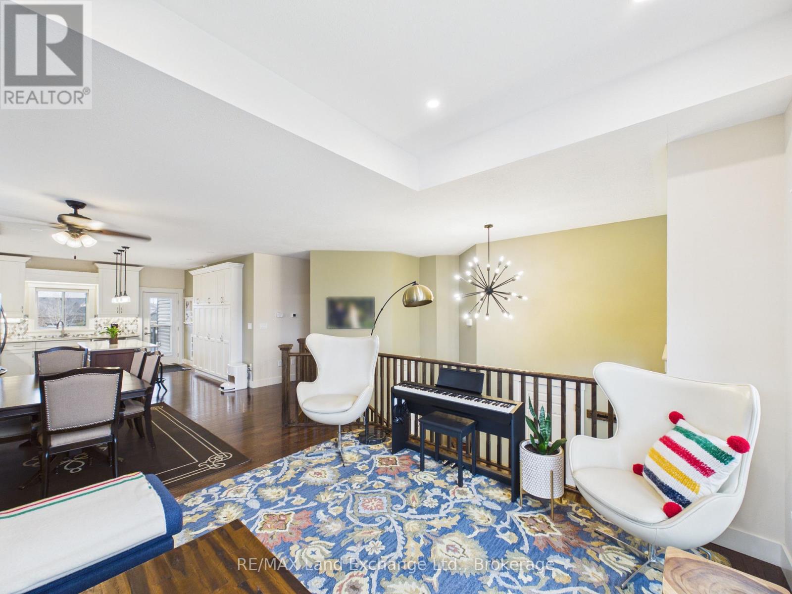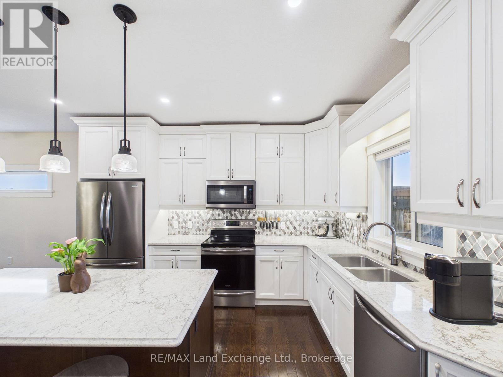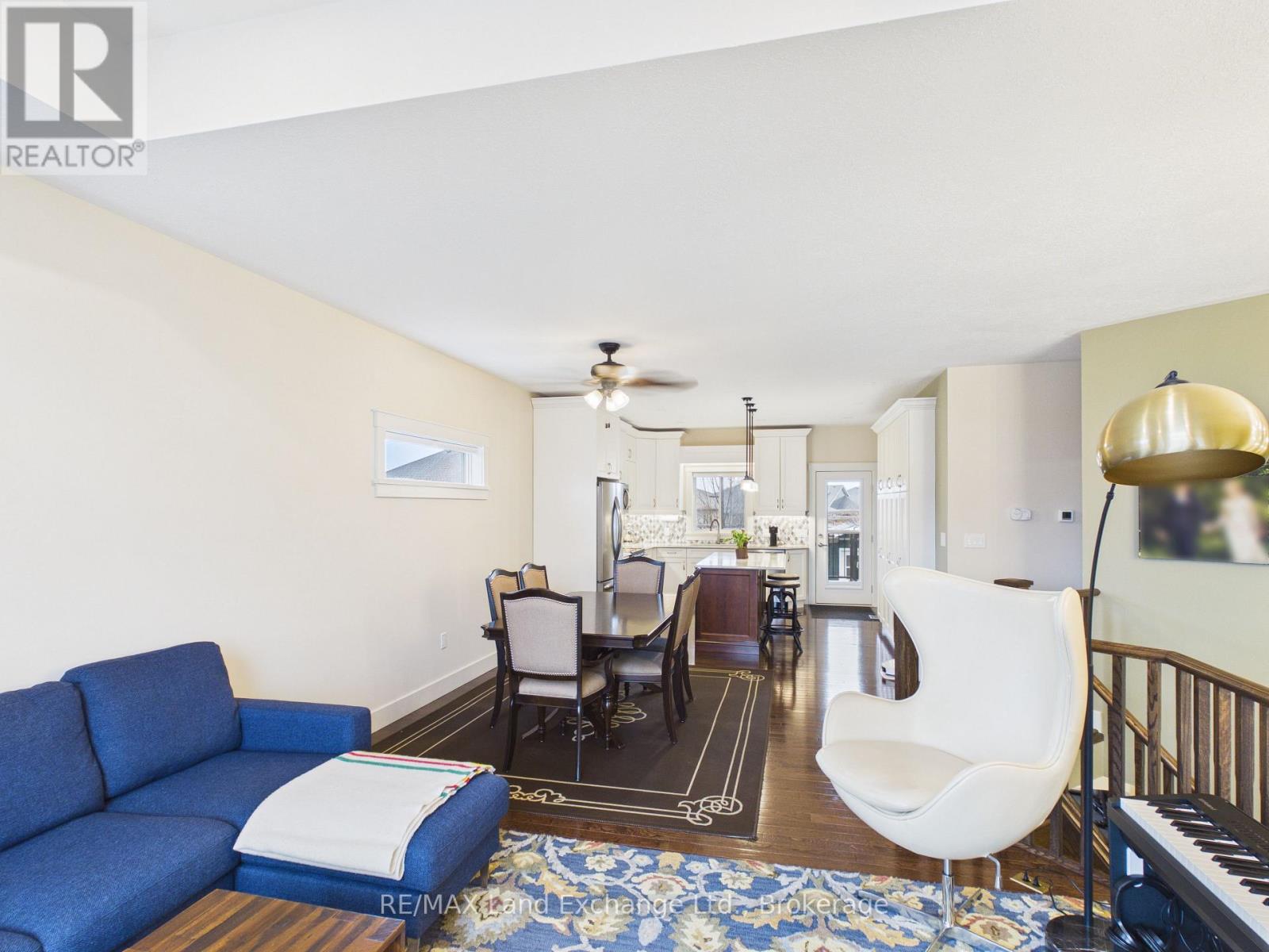 Welcome to this beautifully designed, custom-built home located in the highly sought-after Lakefield Estates. This spacious residence features 5 bedrooms (3 up, 2 down) and 3 full bathrooms, offering plenty of room for families and guests. The open-concept main level showcases a stunning Rona Design kitchen complete with granite countertops, a large island, and high-end finishes, seamlessly connecting the kitchen, dining, and living areas-perfect for both everyday living and entertaining. Elegant hardwood and ceramic flooring run throughout the main level, with ceramic in the foyers and bathrooms. The primary suite features a luxurious ensuite with an oversized marble composite shower and dual shower heads, along with quartz countertops that match the other bathrooms. Downstairs, the fully finished lower level offers a spacious L-shaped family room (approx. 18' x 24' plus 7' x 10'), two additional bedrooms, and a large utility room with convenient stairs leading to the full double garage. Additional highlights include: 9-foot ceilings on the main floor. Upgraded LED lighting with rheostatic dimmers throughout, and plenty of storage space. Large 12' x 13' partially covered deck. Step outside to your private backyard oasis, featuring a partial inground pool, gazebo, and professional landscaping-ideal for relaxing or entertaining and backing onto green space. Located just over two blocks from Boiler Beach, with a beach walkway only steps away from Lakefield, this home combines comfort, style, and an unbeatable location. Completely move-in ready-just unpack and enjoy! (id:64974)