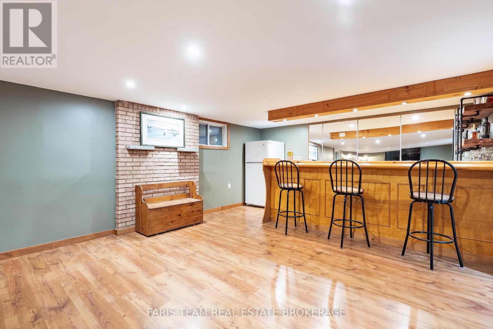 Top 5 Reasons You Will Love This Home: 1) Set in a sought-after east end location in a family-friendly neighbourhood close to schools, parks, shopping, Kempenfelt Bay, Royal Victoria Health Centre, and convenient access to Highway 400 2) Great curb appeal and outdoor living are highlighted by an interlock double driveway and walkway, single-car garage, and a fully fenced yard, all complemented by a large 11'x28' entertaining deck with gas barbeque hookup and a garden shed for additional storage 3) Spacious layout for families offering three bedrooms on the main level and an additional bedroom or office on the lower level, along with two full bathrooms, ideal for those seeking functional one-level living with extra space below 4) Bright open concept main level with a combined living and dining area featuring updated laminate flooring and fresh paint, complemented by a large kitchen with abundant cabinetry, extensive counterspace, and a pantry 5) Fully finished lower level with great entertaining space featuring a custom built-in bar with sink, mirrored wall, and shelving open to the recreation room with a corner gas fireplace and large window, complete with a full 3-piece bathroom, laundry, and plenty of storage. 1,313 above grade sq.ft. plus a finished lower level. (id:64974)