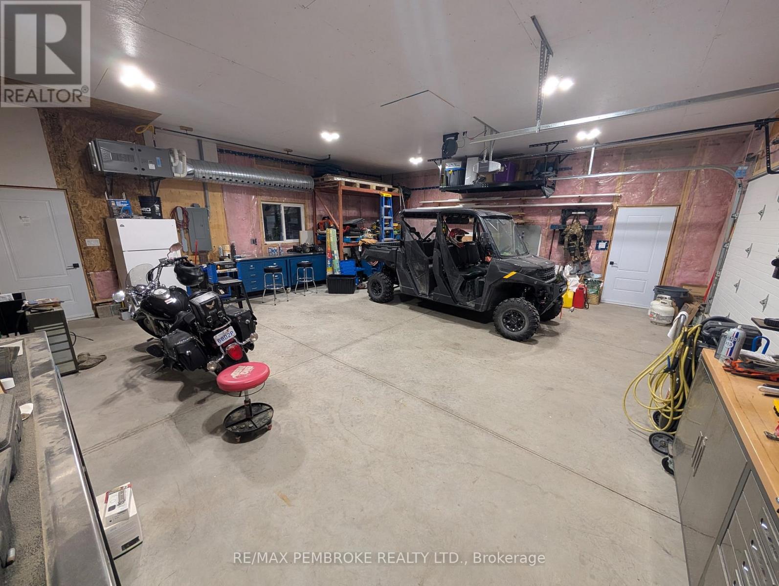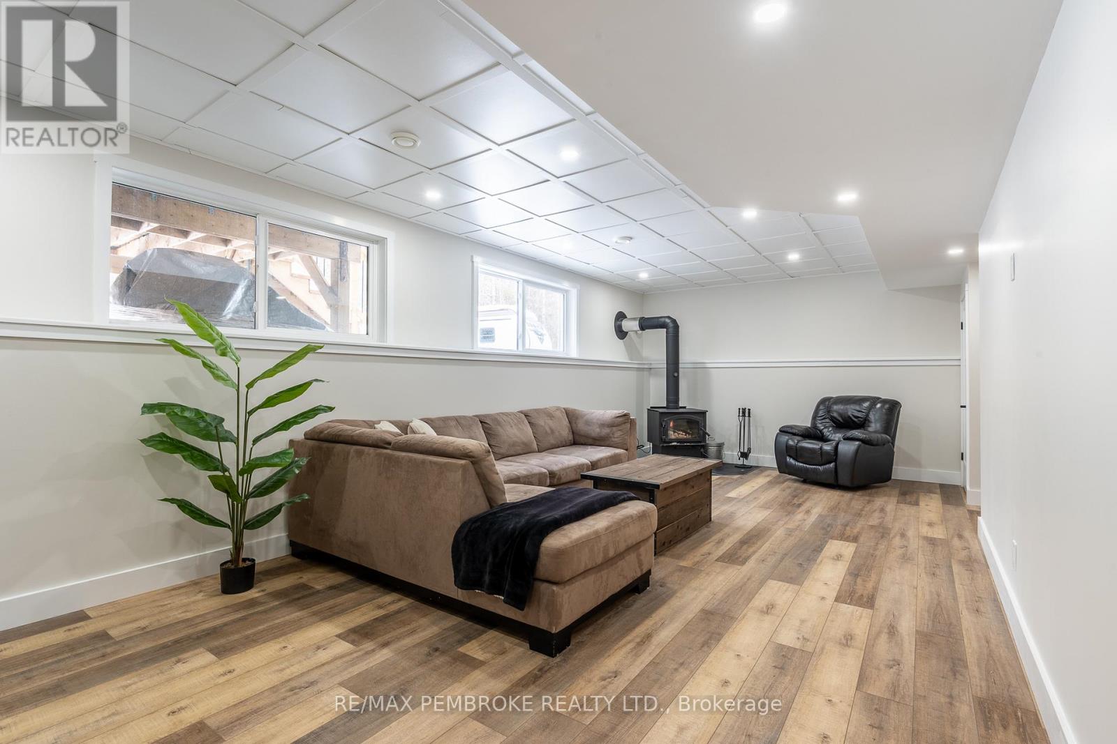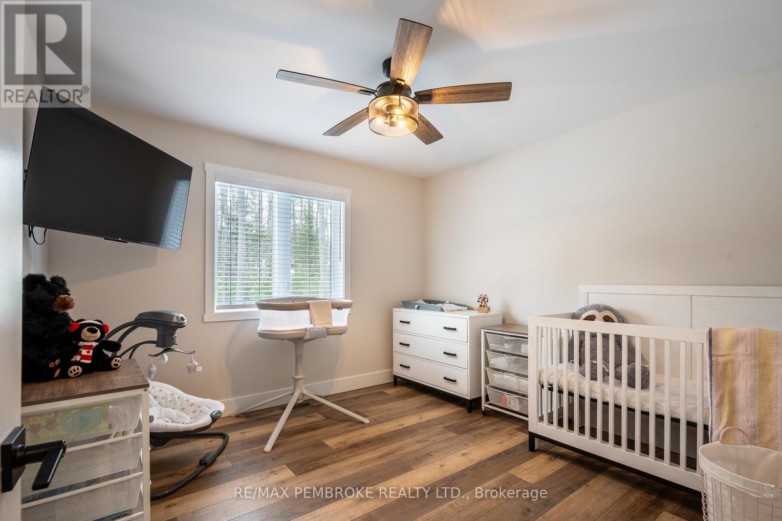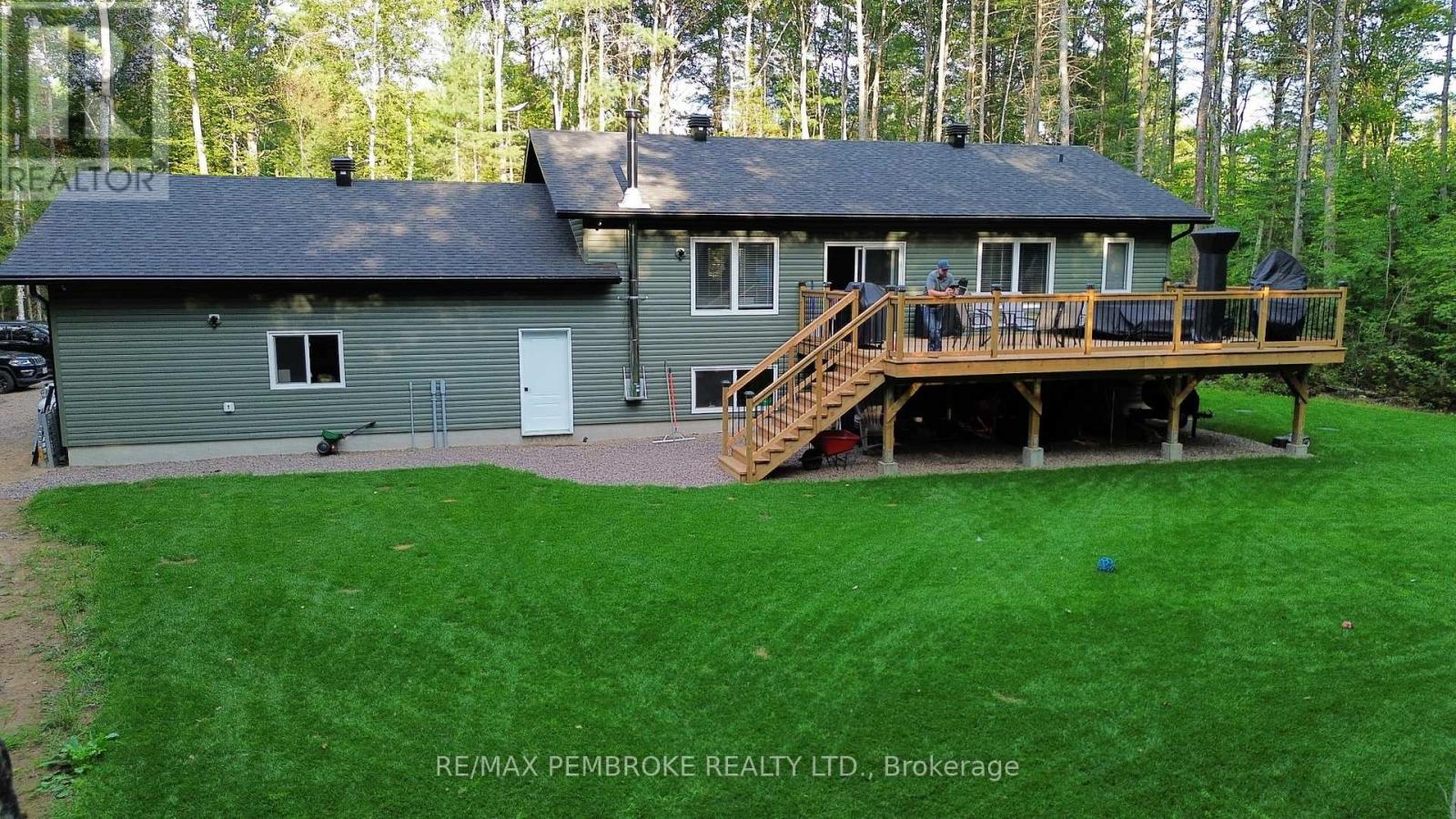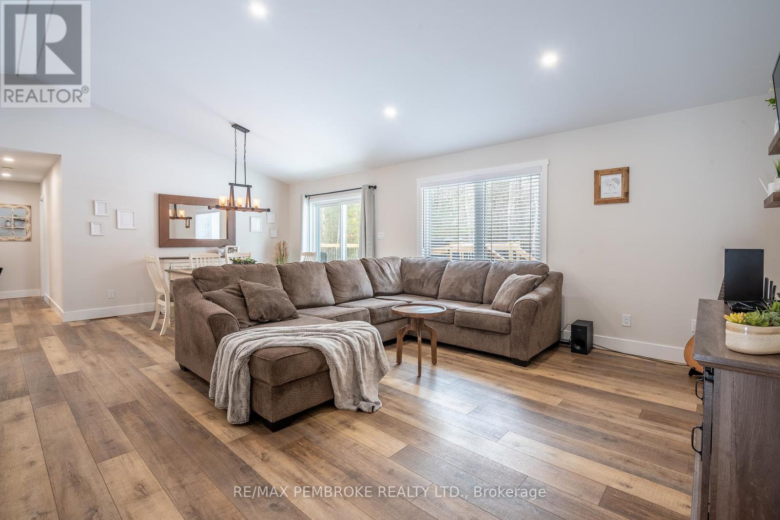 Beautifully appointed raised bungalow built by respected local builder, Dugan Hawkins, at 13 Rantz Road, where privacy, space, and convenience come together in one of Petawawa's most desirable upscale rural settings. Nestled on a 1.66-acre wooded lot, a peaceful retreat surrounded by nature while remaining close to town amenities. Outdoor enthusiasts will appreciate the quick drive to the boat launch at beautiful Black Bay on the Petawawa River. Vaulted ceilings, abundance of south-facing windows, patio doors all provide for great amounts of natural light to pour through the main living spaces. At the heart of the home is a remarkably spacious kitchen, it's U-shaped layout offers extensive modern cabinetry and miles of granite countertops, the long peninsula with overhang provides the perfect gathering place for casual meals, morning coffee, or conversation while meals are prepared. All four bedrooms offer comfortable proportions and a sense of space, ensuring everyone has room to unwind. Primary suite easily accommodates a king-size bed, features a walk-in closet along with a well-appointed 3-piece ensuite with shower. Fully finished lower level features a spacious recroom, anchored by a cozy wood stove and offers endless possibilities for relaxation & entertaining. Two of the four generously sized bedrooms are located on this level, including one currently serving as an ideal home office. Newly completed third bathroom showcases a striking glass-enclosed tile shower with elegant, spa-inspired finishes. Step outside to the expansive 16'x30' deck, accessed directly from the dining room, perfect for alfresco dining or relaxing while overlooking the tranquil wooded backyard and the lush green lawn with irrigation system. Attached 28'x30' garage is a standout feature-fully insulated and heated with its own propane furnace, creating a comfortable year-round workshop or hobby space. Grown-up Toy parking is plentiful as the driveway extends beyond the rear of garage! (id:64974)