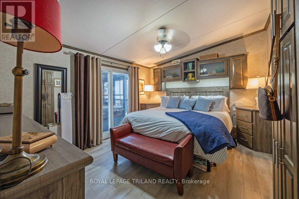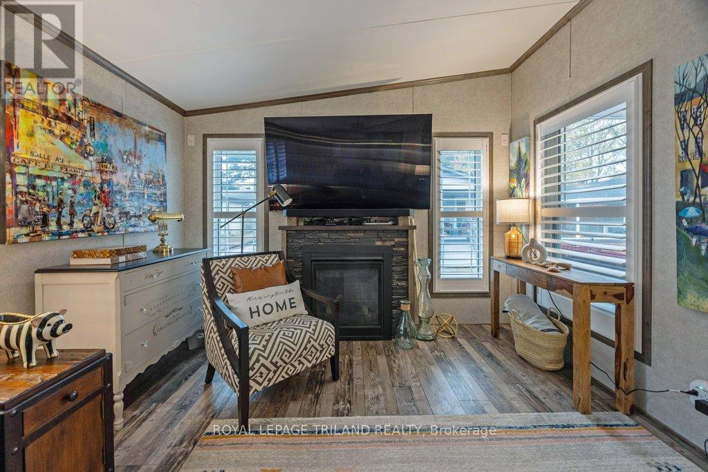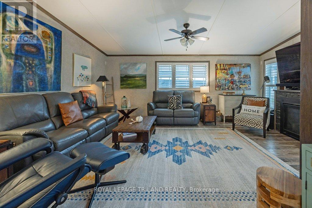 Welcome to unit #130 - this has to be one of the best units in the park! Original owners bought this unit in 2017. Foyer is spacious and bright with laminate wood flooring. Kitchen was just renno in 2024 and it is a dream space to work in. It's a mixture of white with black accents (farm sink). White subway tile backsplash and quartz countertops. Under cabinet lighting. Island. Appliances 2024. Eating area has patio doors leading to covered porch with propane fire table (included). Spacious great room has propane fireplace and lots of windows for natural light. Laundry has tons of storage. Dryer is propane. Primary is oversized with king bed and lots of built in furniture (included). Walk through closet and three piece en-suite with built ins. Second bedroom is awesome use of space with Murphy bed (included) that becomes a desk when not in use. Lots of room for a reading room or office when not entertaining guests. Main bath 4 piece with quartz countertop and backsplash (2024). The best part is the extra large deck (approx 400 square feet) with 3 season gazebo that is approx 12 ft x 17 ft. Adds so much space to unit and great to watch the game or a cozy summer movie. Electric fireplace and TV included on gazebo. Golf cart included. Propane BBQ included. Shed. Storage under the house. Double driveway. (id:64974)