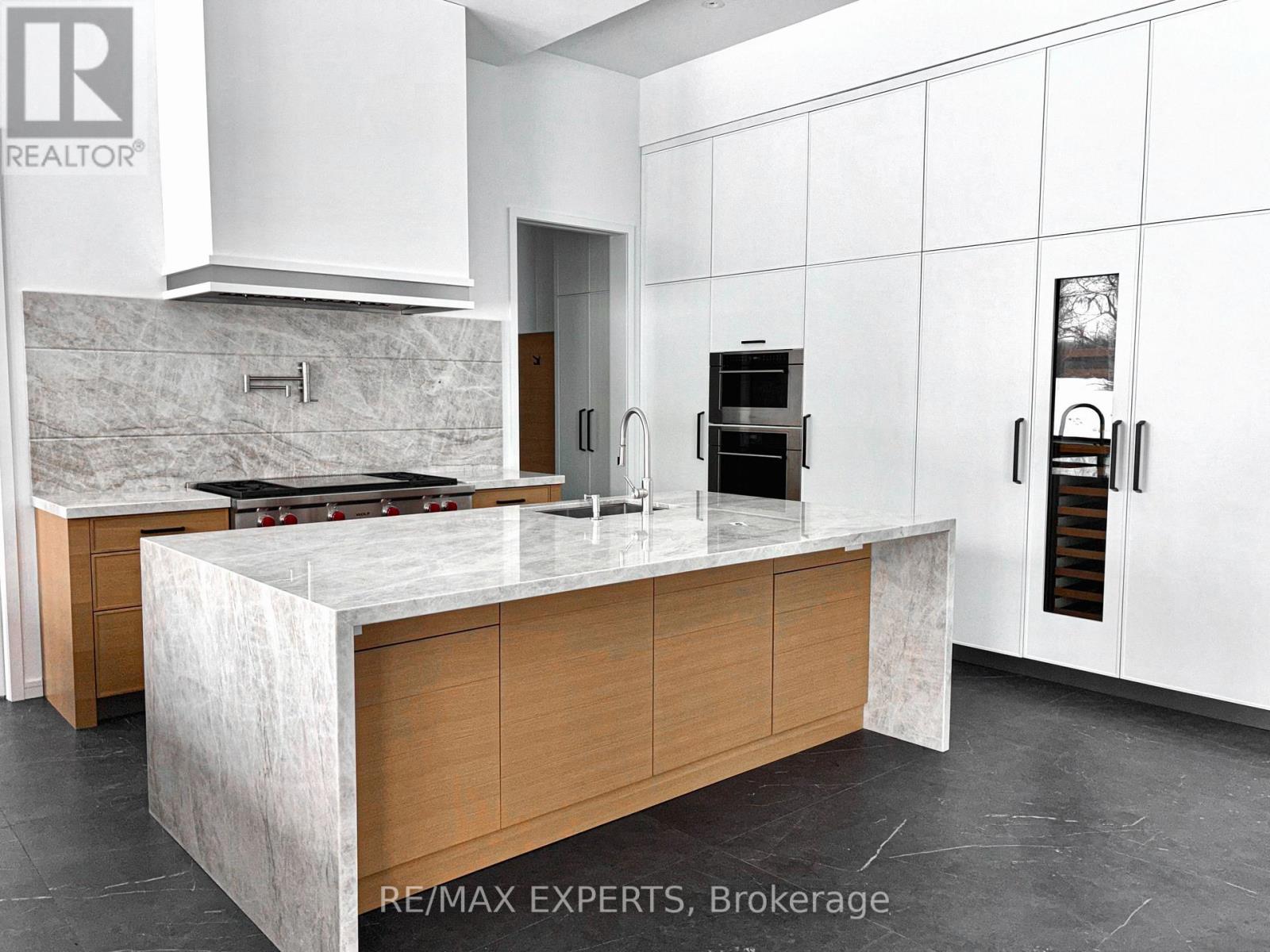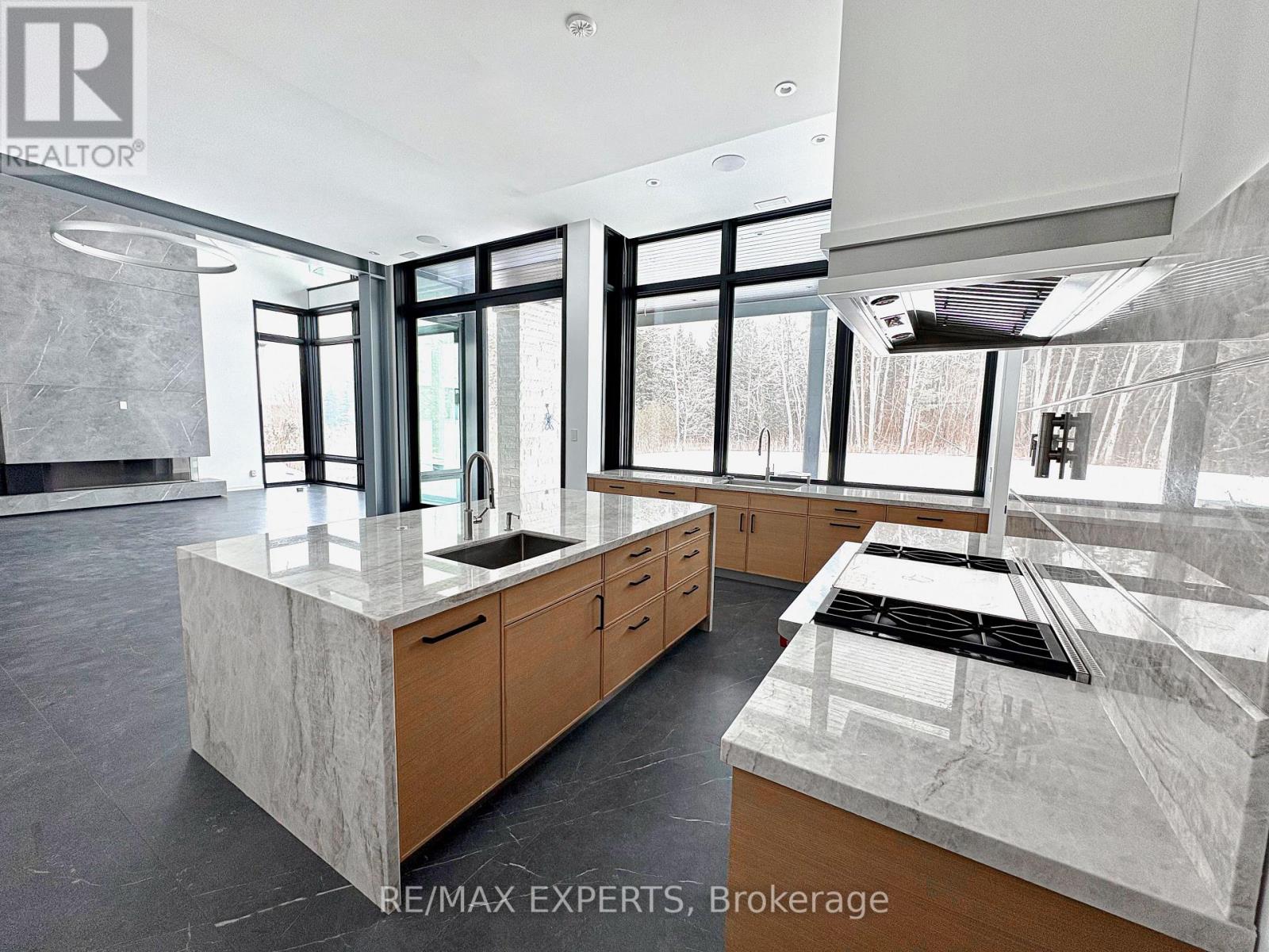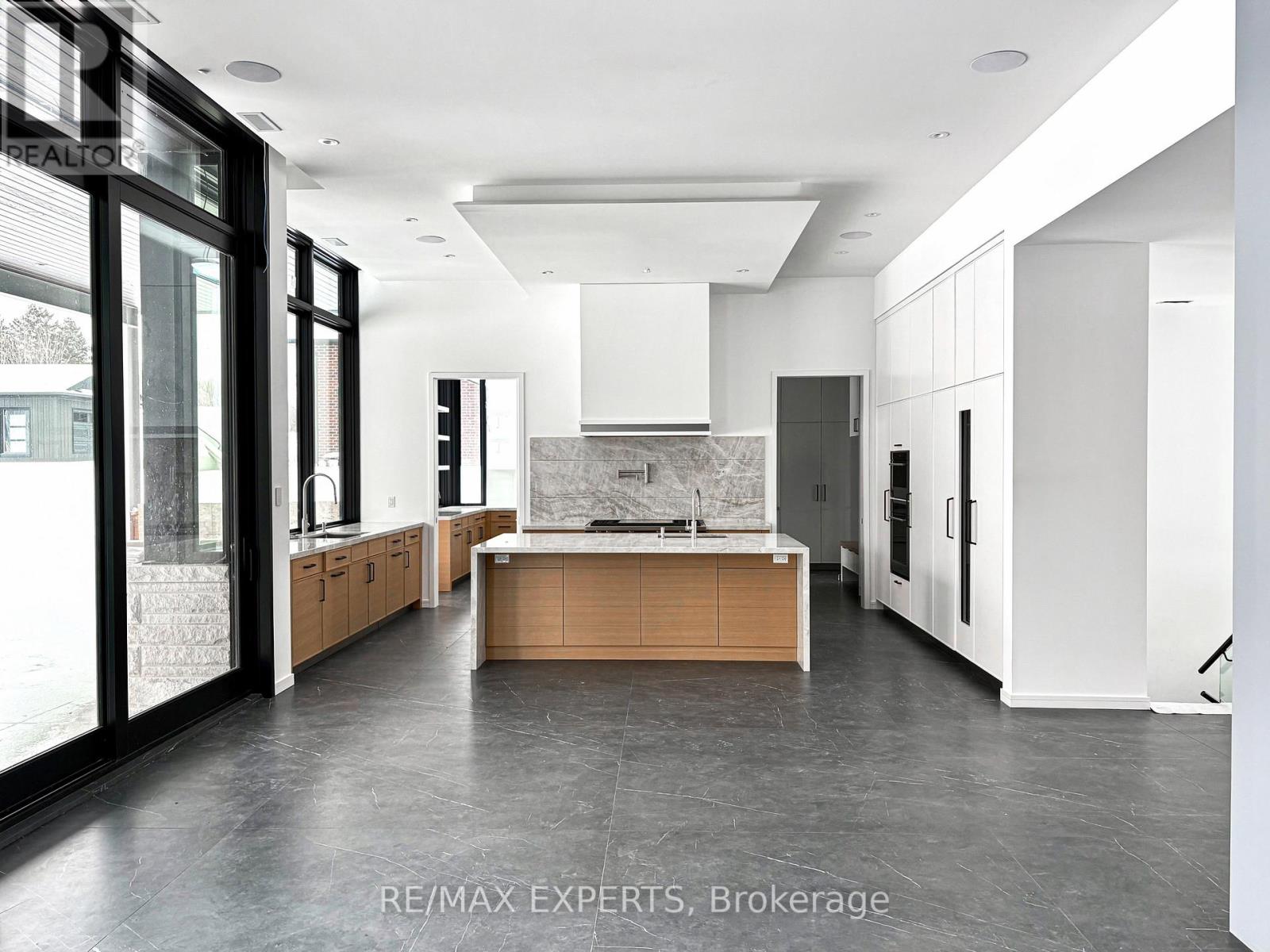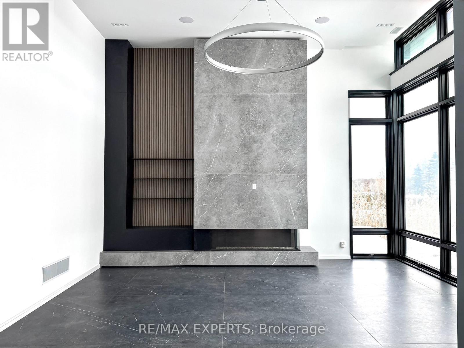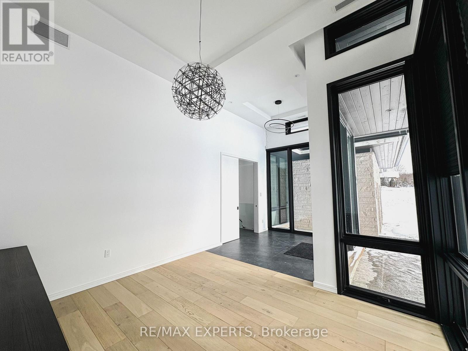 Welcome to 130 Dale Crescent, a modern bungalow set on a private 1.5-acre lot backing onto a protected forest. Large floor-to-ceiling windows, vaulted features, and heated tile surfaces create a bright, open, and calming atmosphere throughout the main living spaces.The kitchen offers high-end built-in appliances, quartz surfaces, custom cabinetry, and anisland designed for both cooking and gathering. A separate walk-out pantry adds freezer andcooling drawers for extra storage and prep. Warm hardwood, solid core doors, built-in speakers, and smart-home wiring complement the home's clean, contemporary feel. A spacious family room with a gas fireplace, exposed steel accents, and views into the forest creates an inviting place to unwind. A bright front office with southern exposure provides a comfortable work space.The bedroom layout provides privacy and comfort, including a generous primary suite with a 5-piece bath, walk-in closet, and a private walk-out. Additional bedrooms are positioned near their own bathrooms, offering flexibility for family or guests.The walk-up lower level adds nearly 3,000 sq. ft. of extra living space, featuring a recreation area, wet bar, gym space, bedroom with walk-in closet, and a bathroom designed to accommodate a steam shower - along with storage areas and a future theatre room space. A covered patio extends the living space outdoors with heating rough-ins, wiring for A/V, and abuilt-in BBQ area. A full-home generator, hydronic in-floor heating, and high-efficiency mechanical systems add ease and comfort year-round. All set in a quiet estate enclave just minutes to Hwy 400, nearby golf, local farm markets, and Bradford's everyday amenities. (id:64974)