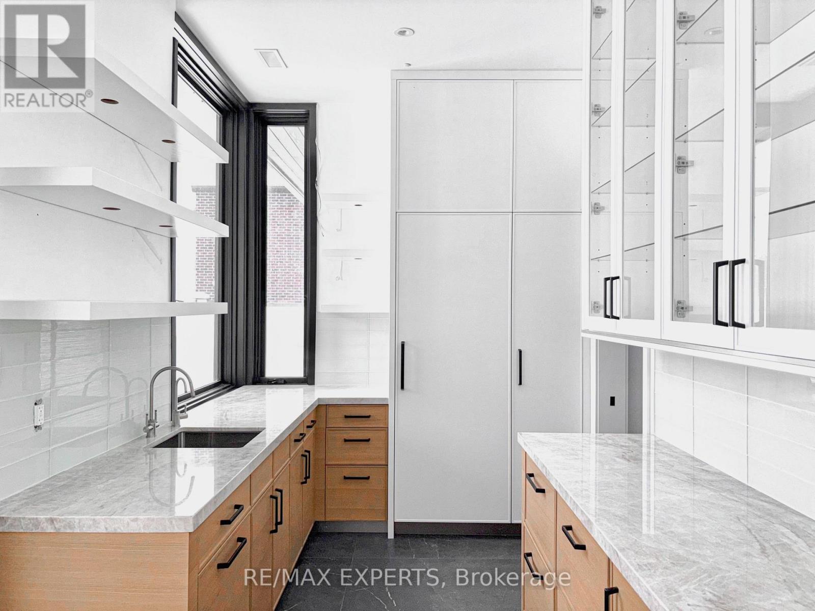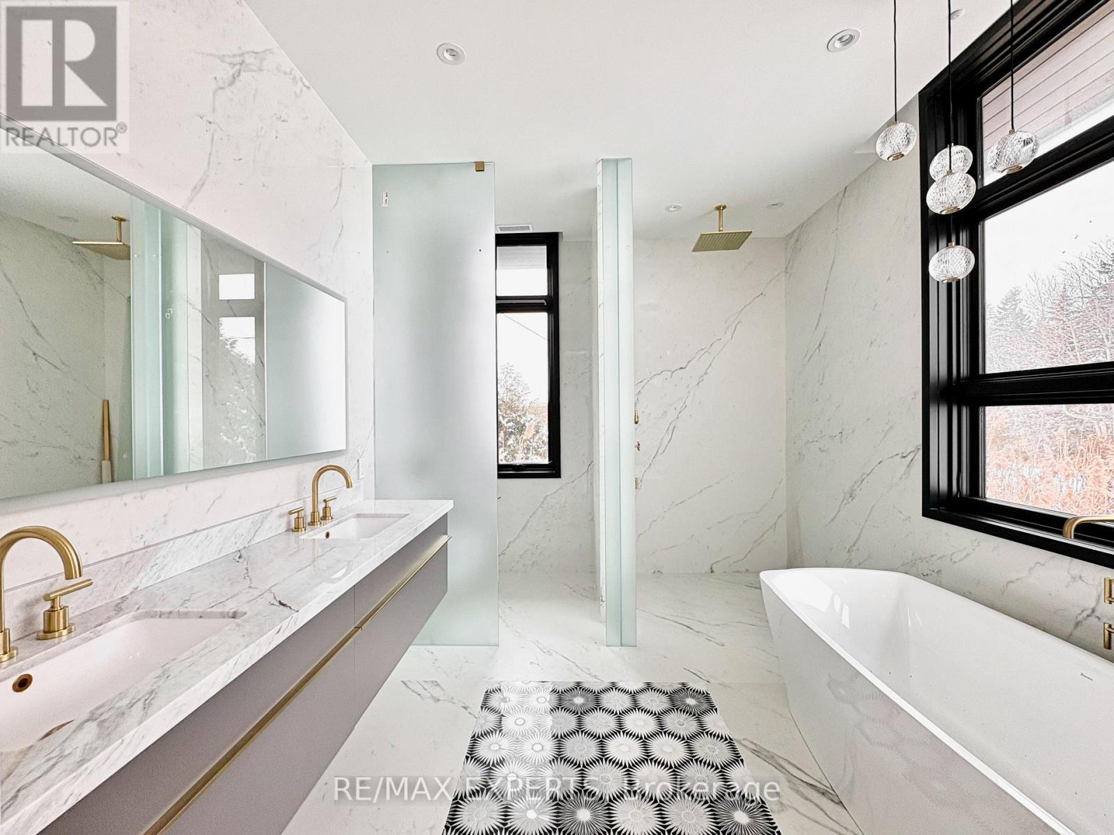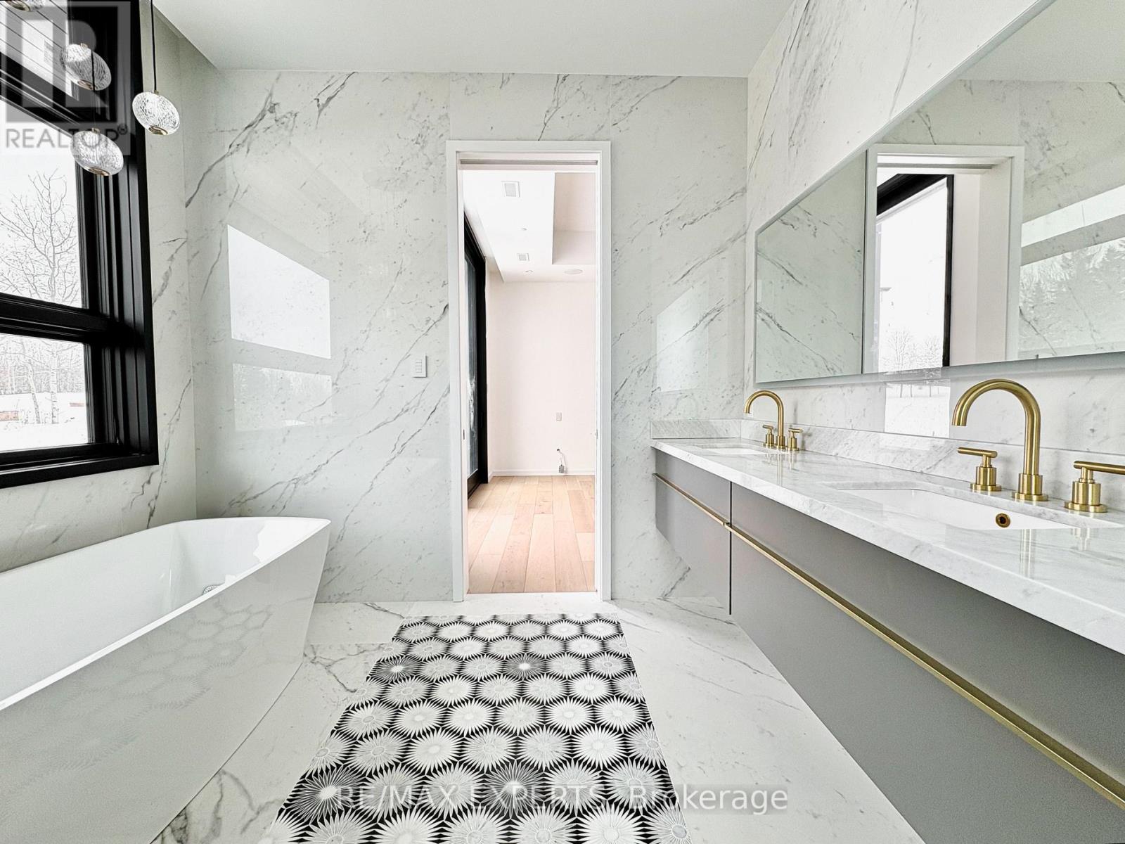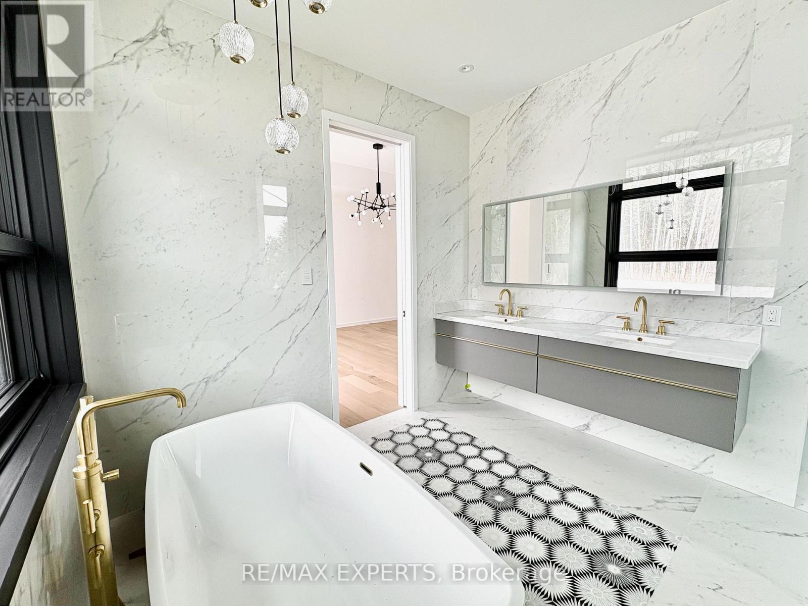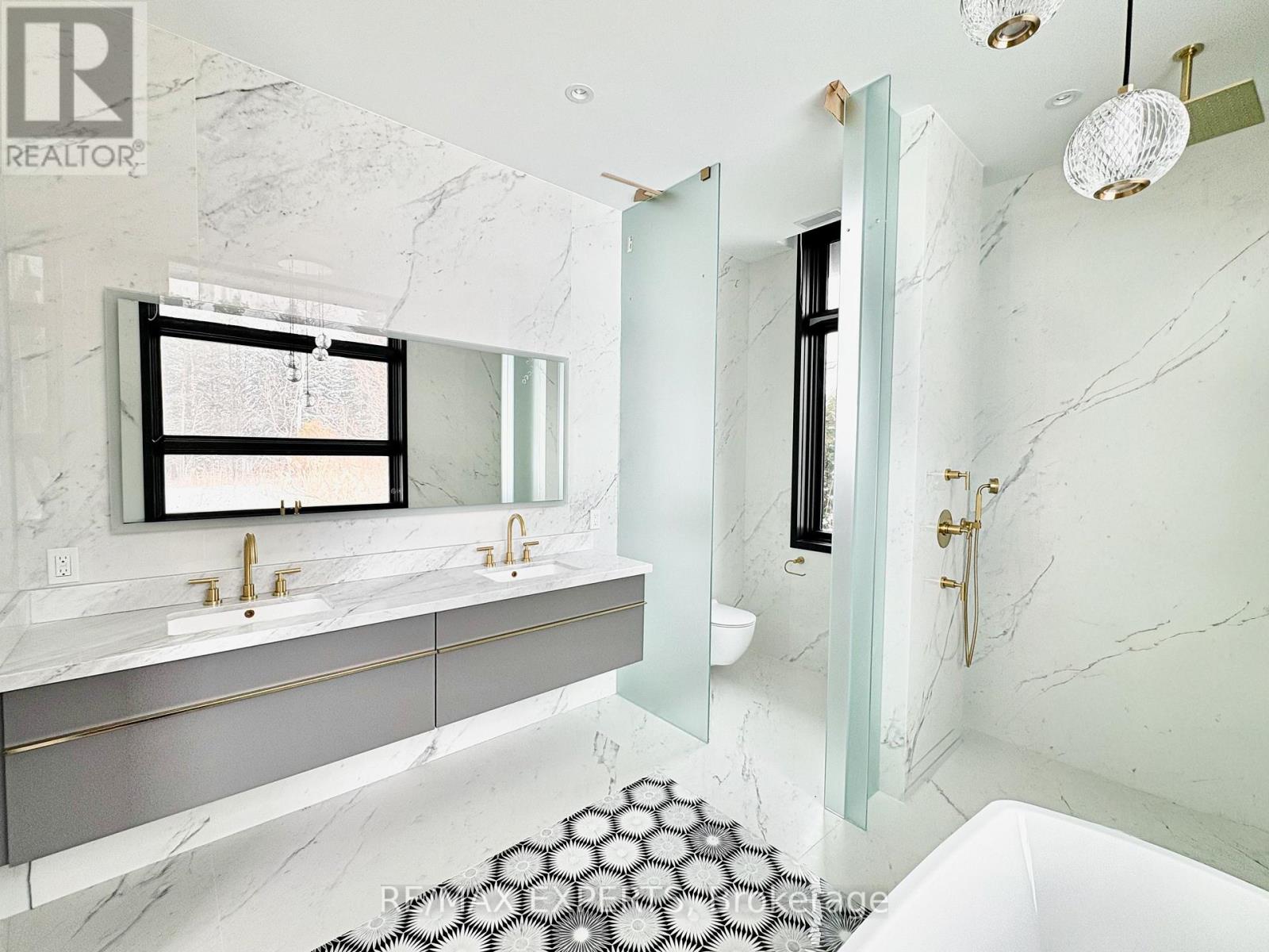 Welcome to 130 Dale Crescent, a modern bungalow set on a private 1.5-acre lot backing onto a protected forest. Large floor-to-ceiling windows, vaulted features, and heated tile surfaces create a bright, open, and calming atmosphere throughout the main living spaces.The kitchen offers high-end built-in appliances, quartz surfaces, custom cabinetry, and anisland designed for both cooking and gathering. A separate walk-out pantry adds freezer andcooling drawers for extra storage and prep. Warm hardwood, solid core doors, built-in speakers, and smart-home wiring complement the home's clean, contemporary feel. A spacious family room with a gas fireplace, exposed steel accents, and views into the forest creates an inviting place to unwind. A bright front office with southern exposure provides a comfortable work space.The bedroom layout provides privacy and comfort, including a generous primary suite with a 5-piece bath, walk-in closet, and a private walk-out. Additional bedrooms are positioned near their own bathrooms, offering flexibility for family or guests.The walk-up lower level adds nearly 3,000 sq. ft. of extra living space, featuring a recreation area, wet bar, gym space, bedroom with walk-in closet, and a bathroom designed to accommodate a steam shower - along with storage areas and a future theatre room space. A covered patio extends the living space outdoors with heating rough-ins, wiring for A/V, and abuilt-in BBQ area. A full-home generator, hydronic in-floor heating, and high-efficiency mechanical systems add ease and comfort year-round. All set in a quiet estate enclave just minutes to Hwy 400, nearby golf, local farm markets, and Bradford's everyday amenities. (id:64974)