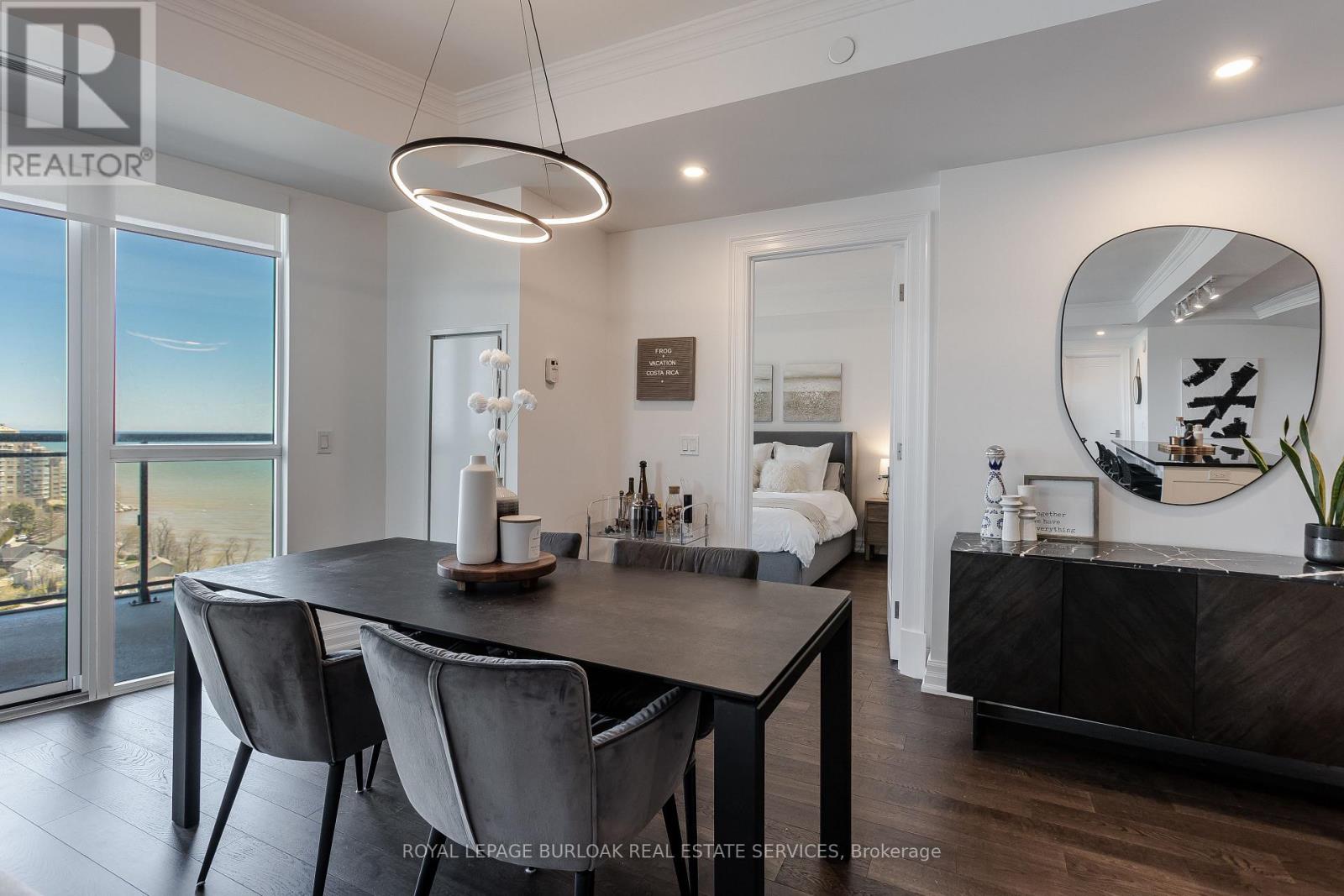 Experience unparalleled luxury at Bridgewater Residences on the lake. This stunning 1,269SF unit boasts a flawless layout and breathtaking, unobstructed views of Lake Ontario, from Burlington to the Toronto skyline. Every detail speaks of quality, from the hardwood floors to the high-end Thermador built in kitchen appliances, including a 5-burner gas range set in granite countertops. Floor-to-ceiling windows flood the open-concept living and dining area with natural light, while offering access to a spacious balcony equipped for BBQs. Both bedrooms feature spectacular views and luxurious en-suites-the primary with a 5-piece set including a separate tub and glass shower, all complemented by marble and granite finishes with heated floors. The secondary bedroom enjoys ensuite privileges and also boasts heated floors. A generous corner den provides a flexible space, ideal for a home office or gym, equipped with built-in cabinetry, which can be easily converted into a 3rd bedroom. Included are central vacuum and a garbage disposal unit. Enjoy the building's exclusive amenities: indoor pool, rooftop courtyard, dual gyms, games and party rooms, and a lakefront deck. Benefit from 24-hour concierge, bike storage, valet visitor parking, and two EV-ready parking spaces, enhancing this premium living experience. (id:64974)