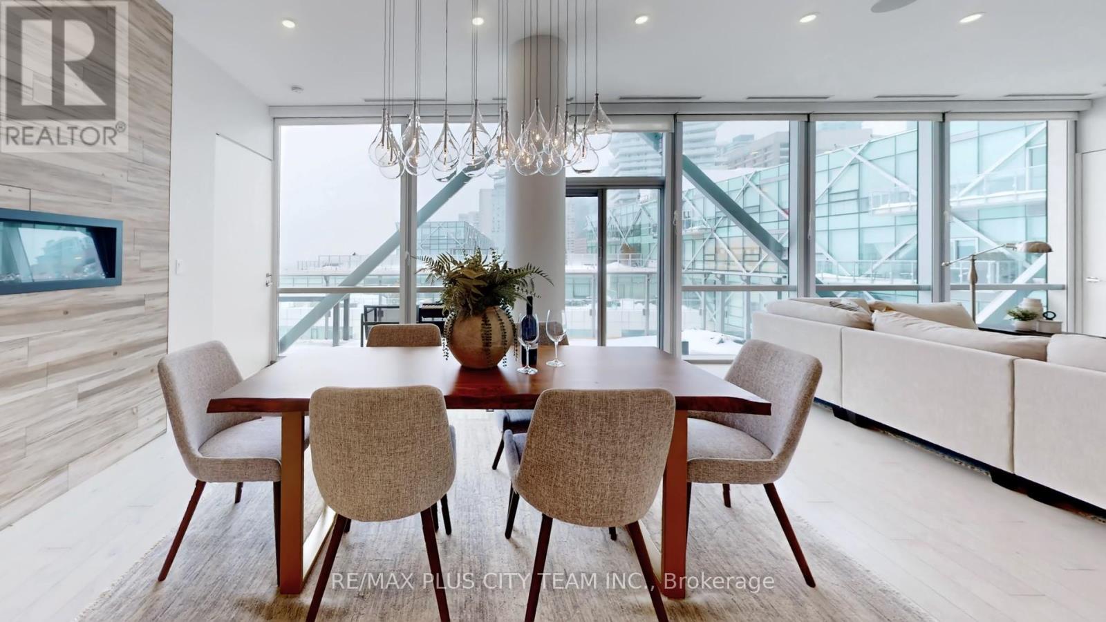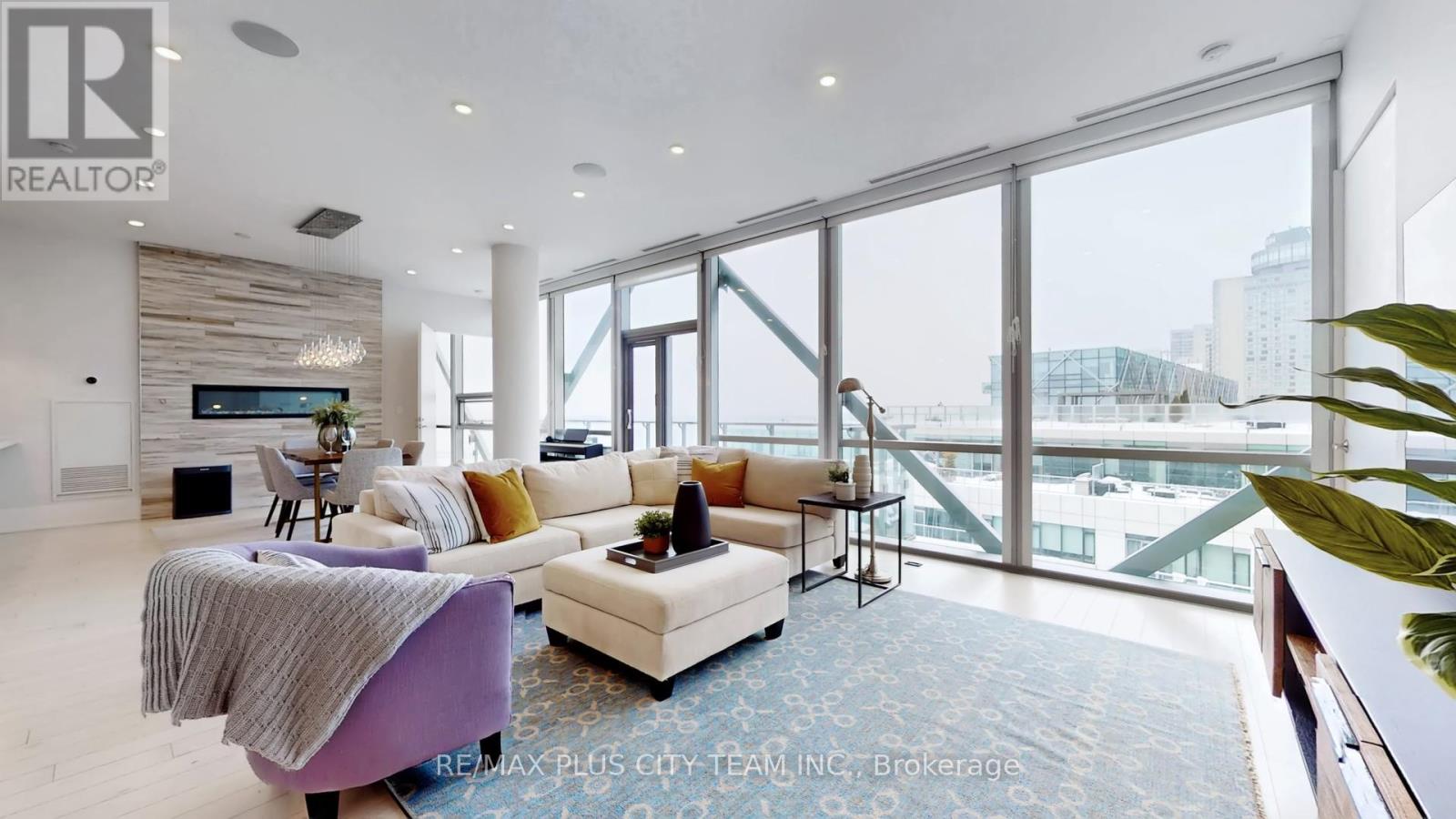 Experience elevated waterfront living in this sub-penthouse residence at Pier 27, one of Toronto's most prestigious addresses. Boasting over 1,700 sq. ft. of refined living space, this 3-bedroom plus den, 3-bathroom suite combines luxury, comfort, and breathtaking unobstructed lake views through expansive 10-foot floor-to-ceiling windows that flood the home with natural light. The open-concept living and dining area features a custom-built-in fireplace and seamless flow for entertaining, while the chef-inspired kitchen showcases integrated Miele appliances, quartz countertops, and sleek cabinetry that balance modern design with everyday functionality. The primary suite offers a private retreat complete with a walk-in closet and spa-like ensuite featuring Toto fixtures. Two additional bedrooms and a den provide versatility for guests or a home office. This residence includes two parking spaces and two storage lockers for exceptional convenience. Residents enjoy an exclusive selection of five-star amenities, including indoor and outdoor pools, a fitness centre with sauna and steam room, theatre, lounge, party rooms, guest suites, and visitor parking. Located in the heart of the Toronto waterfront, steps from Union Station, the Financial District, and Harbourfront, with Loblaws, Farm Boy, LCBO, and some of the city's best restaurants and cafés just across the street. Discover a rare opportunity to own a truly exceptional sub-penthouse where contemporary luxury meets serene lakefront living (id:64974)