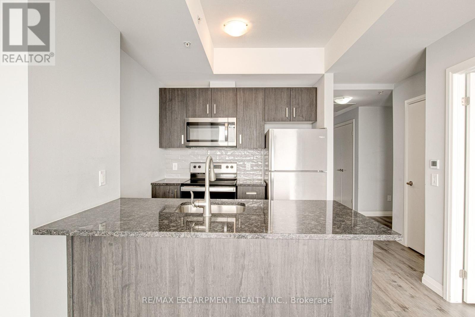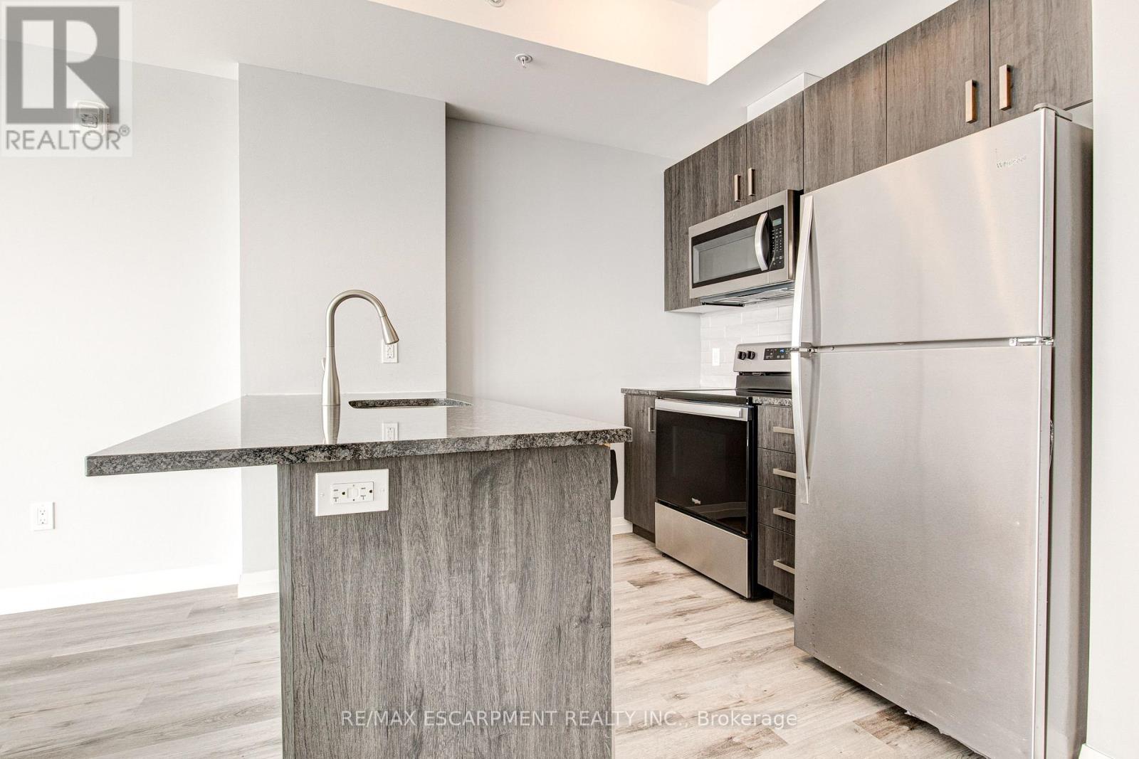 On the edge of downtown Kitchener, this north-facing 1 bedroom condo at 108 Garment Street offers downtown living in a bright and modern unit with unobstructed views. Completed in 2022, the unit features a functional layout anchored by a sleek kitchen with stainless steel appliances, a double sink, dishwasher, and generous counter space. An peninsula comfortably seats three, ideal for casual dining or entertaining.The open living area flows to a private north-facing balcony with open views toward Uptown Waterloo and beautiful sunset light. A dedicated den provides valuable flexibility-perfect for a home office or organized storage. The bedroom is comfortably sized with a walk-in closet and floor to ceiling windows overlooking the private balcony and views, complemented by a bathroom with a tub/shower and the convenience of in-suite laundry. One underground parking space and a storage locker are included. Residents enjoy use of a fitness room, yoga studio room, party room, and a large outdoor terrace with pool, basketball court, BBQs, and seating, along with convenient public visitor parking next door. With LRT, bus routes, dining, shops, and the tech district at your doorstep, this unit offers an easy, low-maintenance home and lifestyle in a central, connected location. (id:64974)