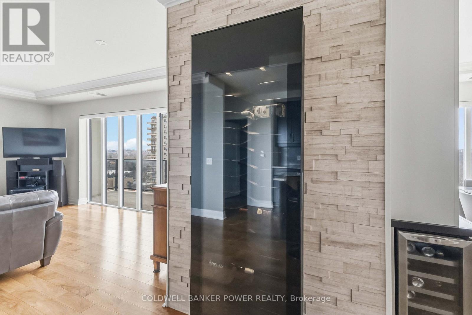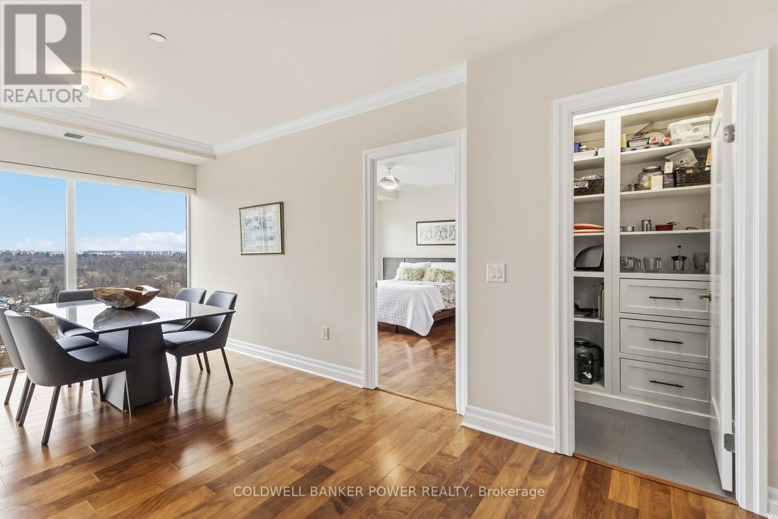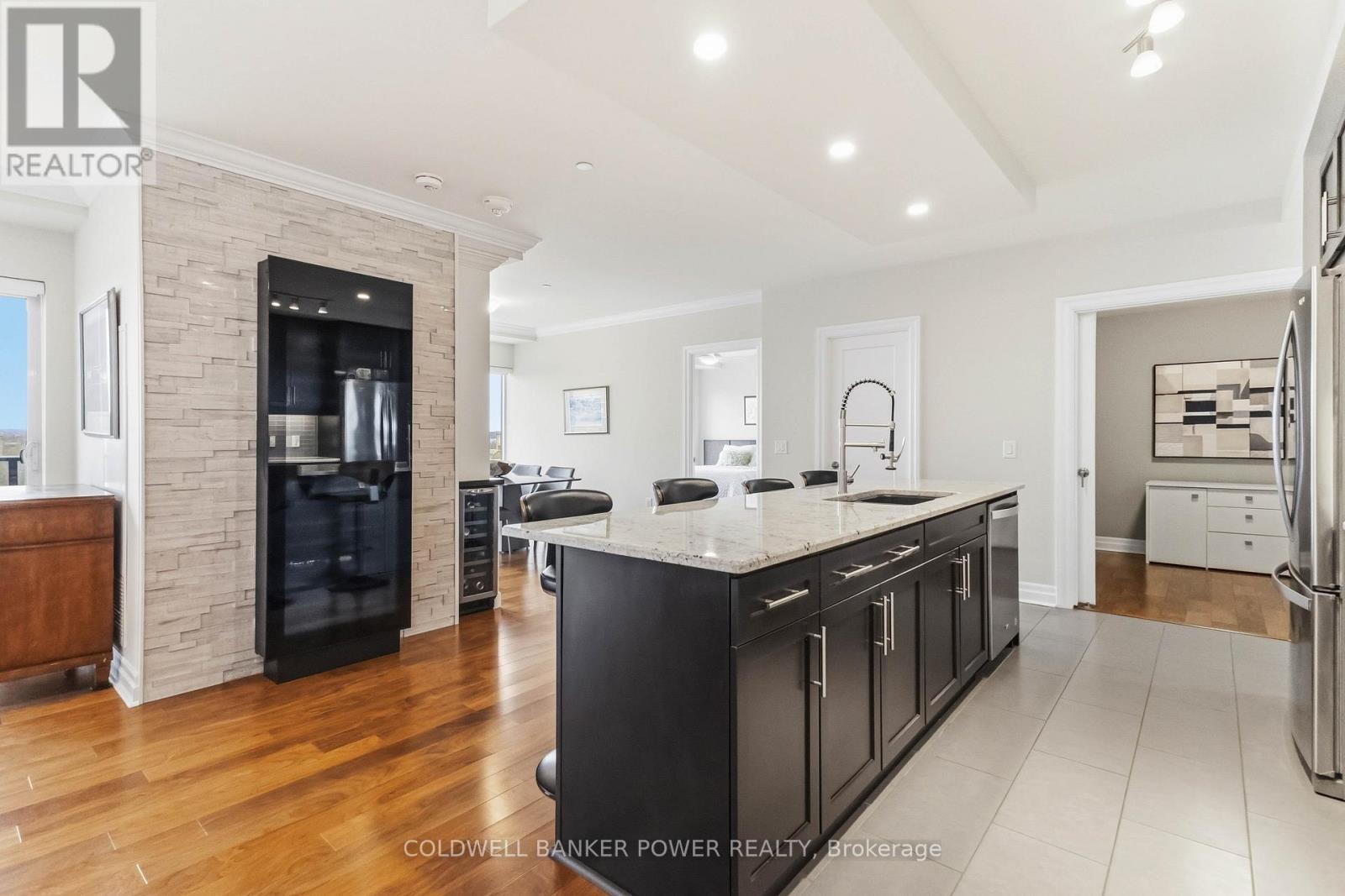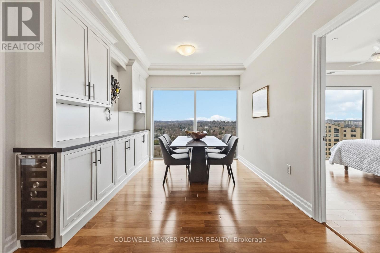 Welcome to Azure Condominiums, one of downtown London's premier luxury high-rise communities. Offering 1,615 sq. ft. of interior living space plus a 135 sq. ft. private balcony, the Madison 2H model provides the size and layout many buyers look for but rarely find in condo living. Located on the 13th floor, Suite 1309 features 2 bedrooms, a den, and 2 full bathrooms, all arranged within a highly functional floor plan designed for both everyday living and entertaining. The open living and dining space feels bright and welcoming, complemented by hardwood flooring throughout with no carpet. Extensive custom cabinetry has been thoughtfully added throughout the unit, including the dining area, hallway closet, pantry, and primary bedroom closet, maximizing storage while maintaining a clean built-in look. Just off the kitchen, a custom feature wall with a built-in wine display fridge creates a striking focal point that guests will notice right away. The den offers excellent flexibility, serving as a home office while also functioning as guest space thanks to a custom Murphy bed that allows the room to easily convert when needed. Practical features continue with 2 underground parking spaces, both equipped with EV chargers capable of fast charging and conveniently located close to the building entrance and elevators. The unit also includes a convenient and large private storage locker located on the same floor. Condo fees include heating, cooling, water, and hot water, leaving owners responsible only for personal hydro. Azure residents enjoy exceptional amenities including a 29th floor rooftop terrace with BBQs and gas fire pits, fitness centre, golf simulator, social lounge, billiards room, library, and guest suite. All of this is located in the heart of downtown London, just steps from restaurants, entertainment, parks, and major employers. A fantastic opportunity to enjoy over 1,600 sq. ft. of upgraded condo living in one of the city's most sought-after buildings. (id:64974)