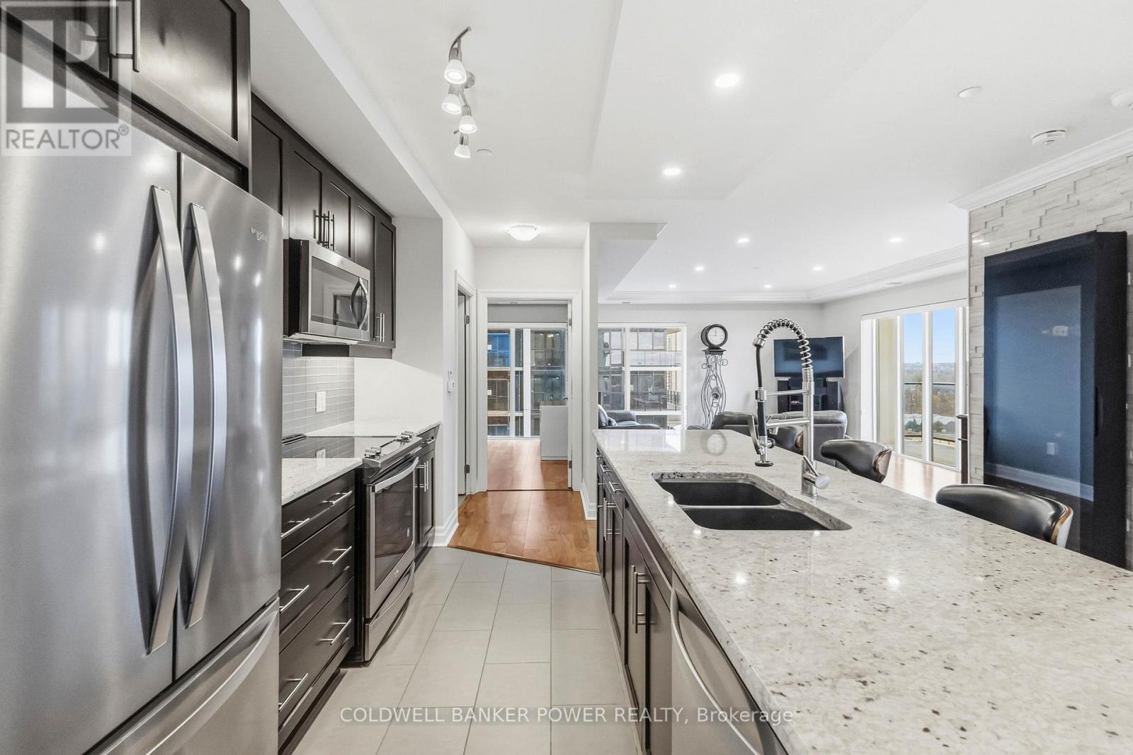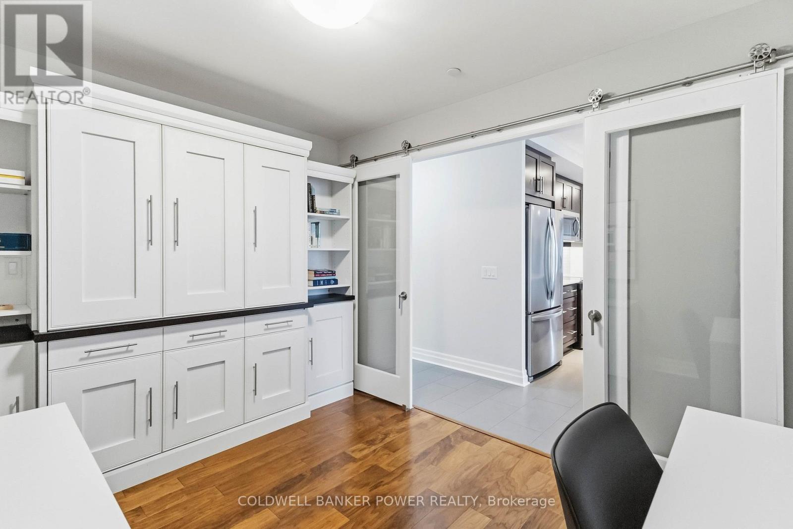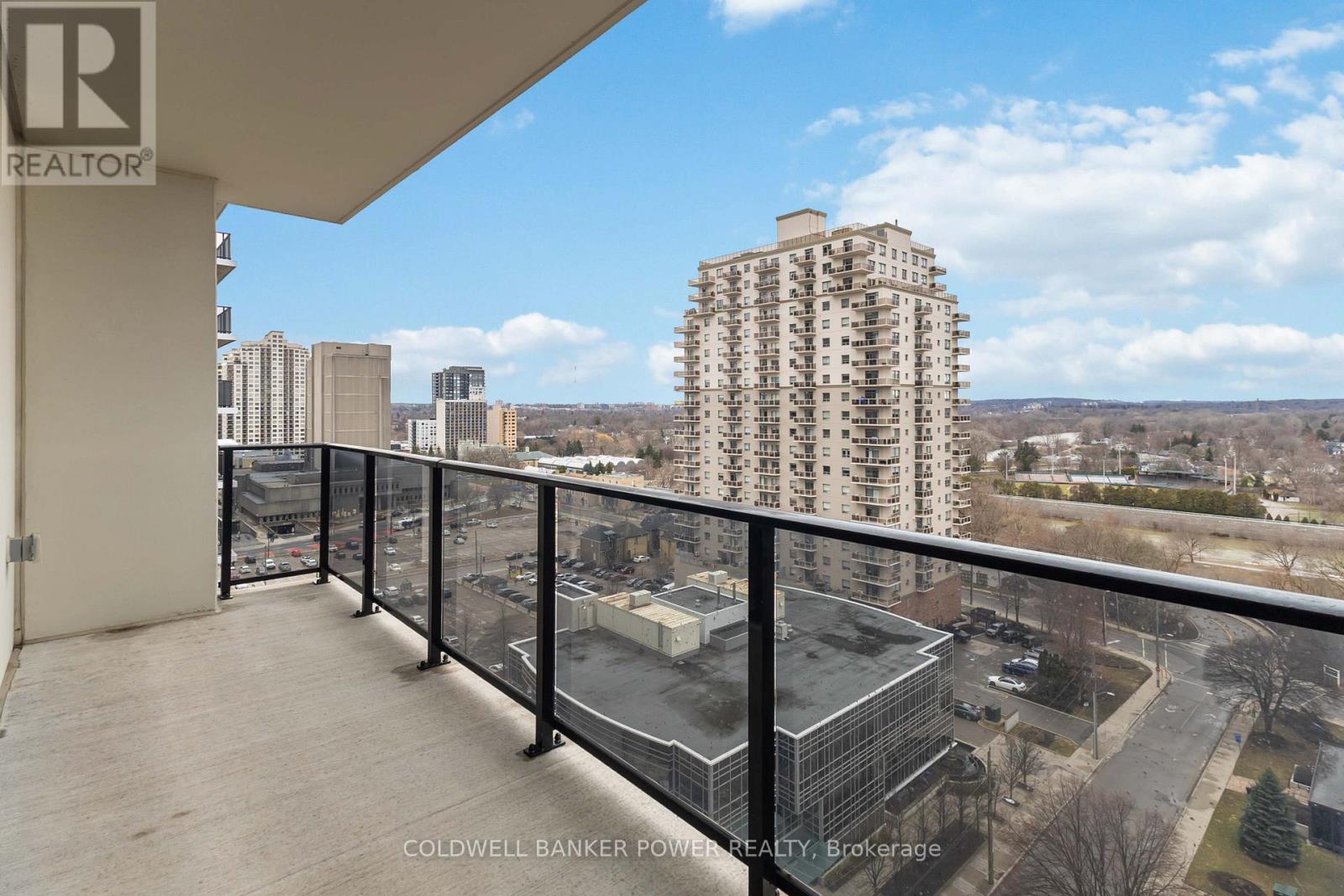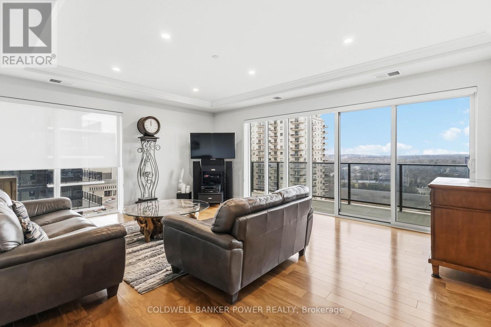 Welcome to Azure Condominiums, one of downtown London's premier luxury high-rise communities. Offering 1,615 sq. ft. of interior living space plus a 135 sq. ft. private balcony, the Madison 2H model provides the size and layout many buyers look for but rarely find in condo living. Located on the 13th floor, Suite 1309 features 2 bedrooms, a den, and 2 full bathrooms, all arranged within a highly functional floor plan designed for both everyday living and entertaining. The open living and dining space feels bright and welcoming, complemented by hardwood flooring throughout with no carpet. Extensive custom cabinetry has been thoughtfully added throughout the unit, including the dining area, hallway closet, pantry, and primary bedroom closet, maximizing storage while maintaining a clean built-in look. Just off the kitchen, a custom feature wall with a built-in wine display fridge creates a striking focal point that guests will notice right away. The den offers excellent flexibility, serving as a home office while also functioning as guest space thanks to a custom Murphy bed that allows the room to easily convert when needed. Practical features continue with 2 underground parking spaces, both equipped with EV chargers capable of fast charging and conveniently located close to the building entrance and elevators. The unit also includes a convenient and large private storage locker located on the same floor. Condo fees include heating, cooling, water, and hot water, leaving owners responsible only for personal hydro. Azure residents enjoy exceptional amenities including a 29th floor rooftop terrace with BBQs and gas fire pits, fitness centre, golf simulator, social lounge, billiards room, library, and guest suite. All of this is located in the heart of downtown London, just steps from restaurants, entertainment, parks, and major employers. A fantastic opportunity to enjoy over 1,600 sq. ft. of upgraded condo living in one of the city's most sought-after buildings. (id:64974)