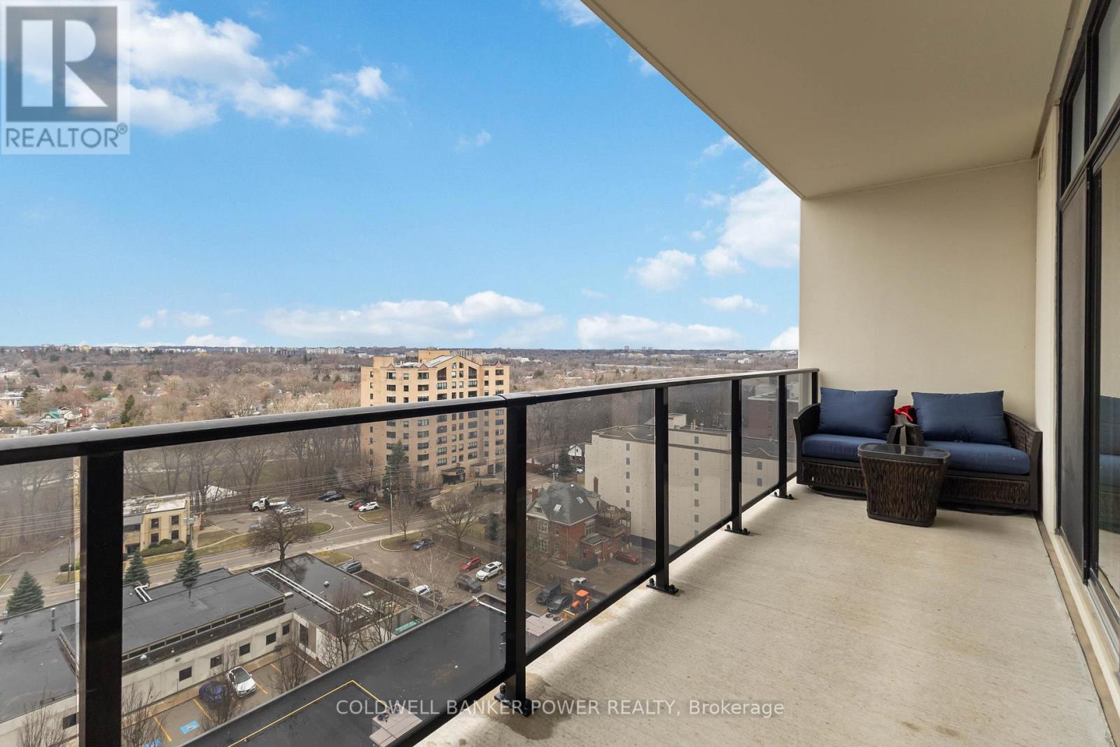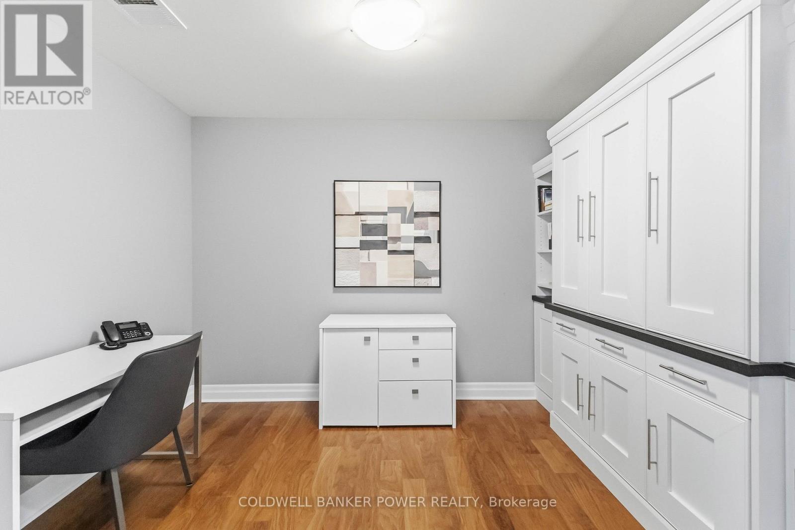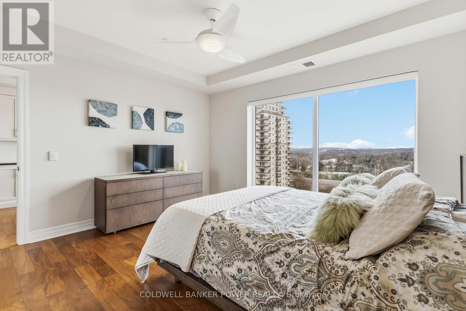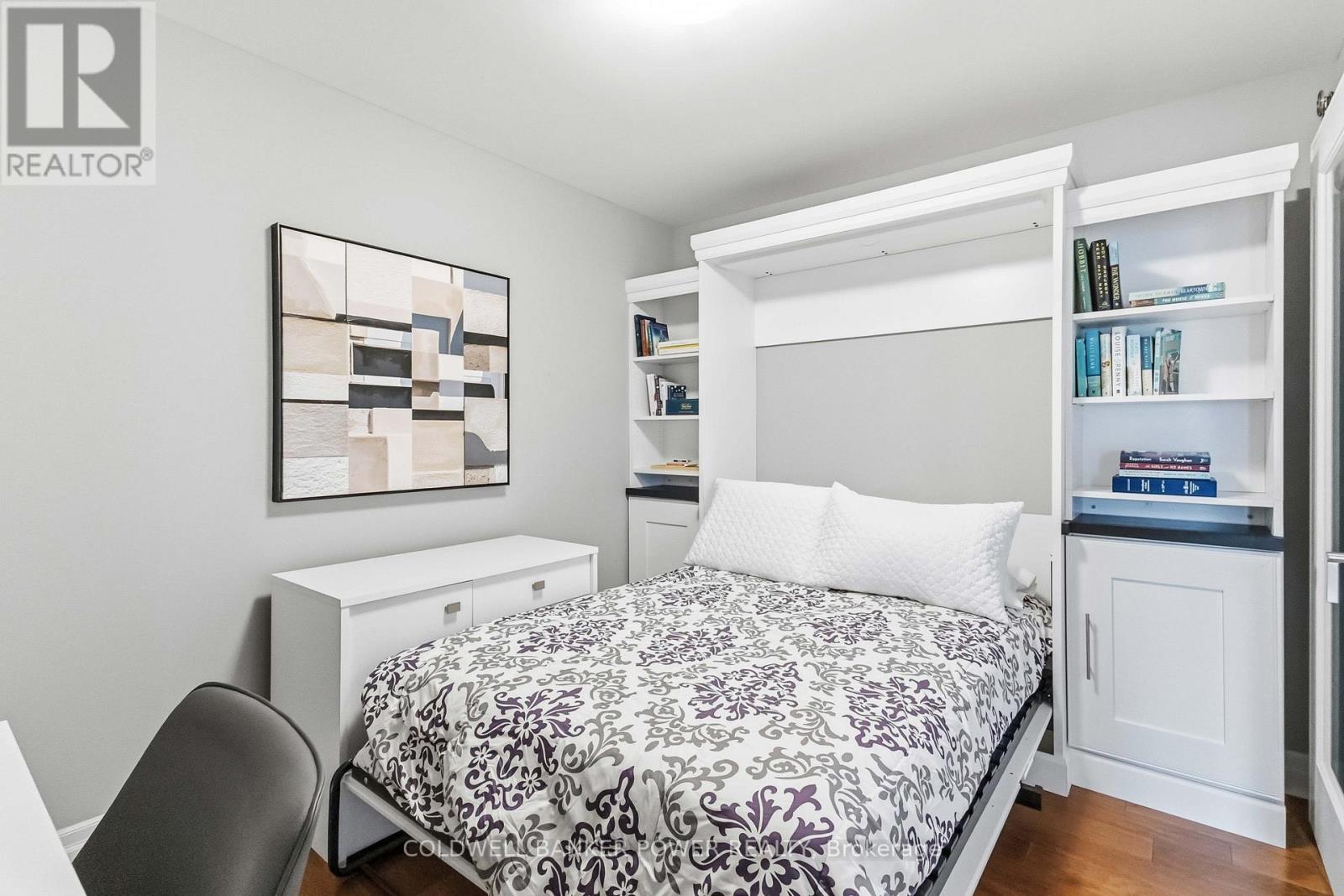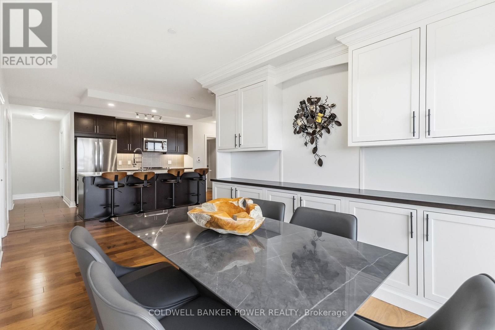 Welcome to Azure Condominiums, one of downtown London's premier luxury high-rise communities. Offering 1,615 sq. ft. of interior living space plus a 135 sq. ft. private balcony, the Madison 2H model provides the size and layout many buyers look for but rarely find in condo living. Located on the 13th floor, Suite 1309 features 2 bedrooms, a den, and 2 full bathrooms, all arranged within a highly functional floor plan designed for both everyday living and entertaining. The open living and dining space feels bright and welcoming, complemented by hardwood flooring throughout with no carpet. Extensive custom cabinetry has been thoughtfully added throughout the unit, including the dining area, hallway closet, pantry, and primary bedroom closet, maximizing storage while maintaining a clean built-in look. Just off the kitchen, a custom feature wall with a built-in wine display fridge creates a striking focal point that guests will notice right away. The den offers excellent flexibility, serving as a home office while also functioning as guest space thanks to a custom Murphy bed that allows the room to easily convert when needed. Practical features continue with 2 underground parking spaces, both equipped with EV chargers capable of fast charging and conveniently located close to the building entrance and elevators. The unit also includes a convenient and large private storage locker located on the same floor. Condo fees include heating, cooling, water, and hot water, leaving owners responsible only for personal hydro. Azure residents enjoy exceptional amenities including a 29th floor rooftop terrace with BBQs and gas fire pits, fitness centre, golf simulator, social lounge, billiards room, library, and guest suite. All of this is located in the heart of downtown London, just steps from restaurants, entertainment, parks, and major employers. A fantastic opportunity to enjoy over 1,600 sq. ft. of upgraded condo living in one of the city's most sought-after buildings. (id:64974)