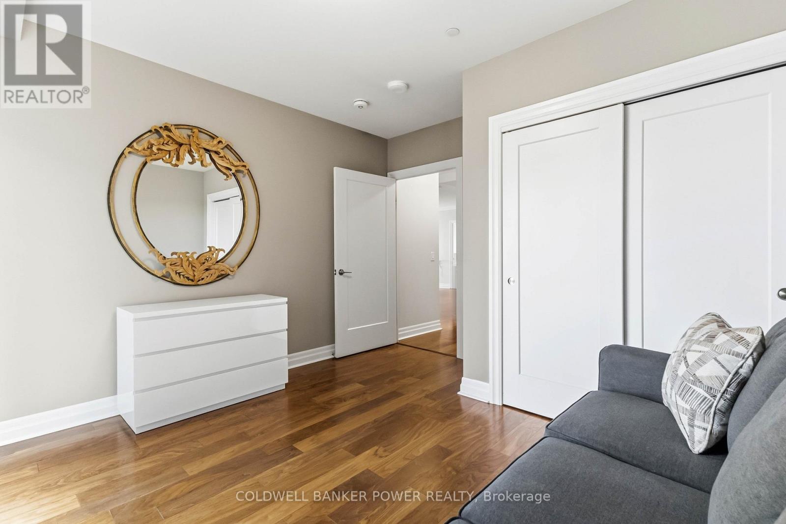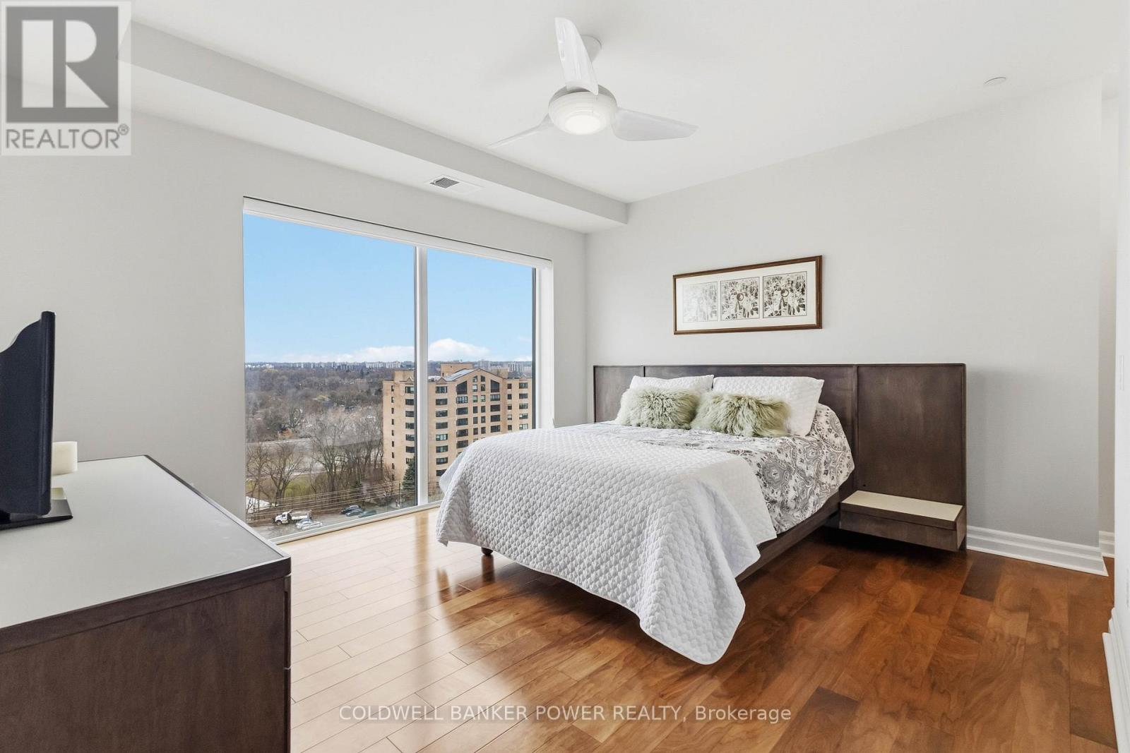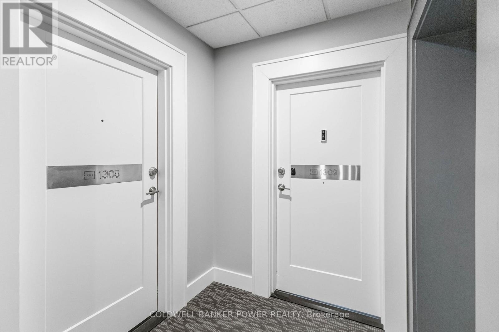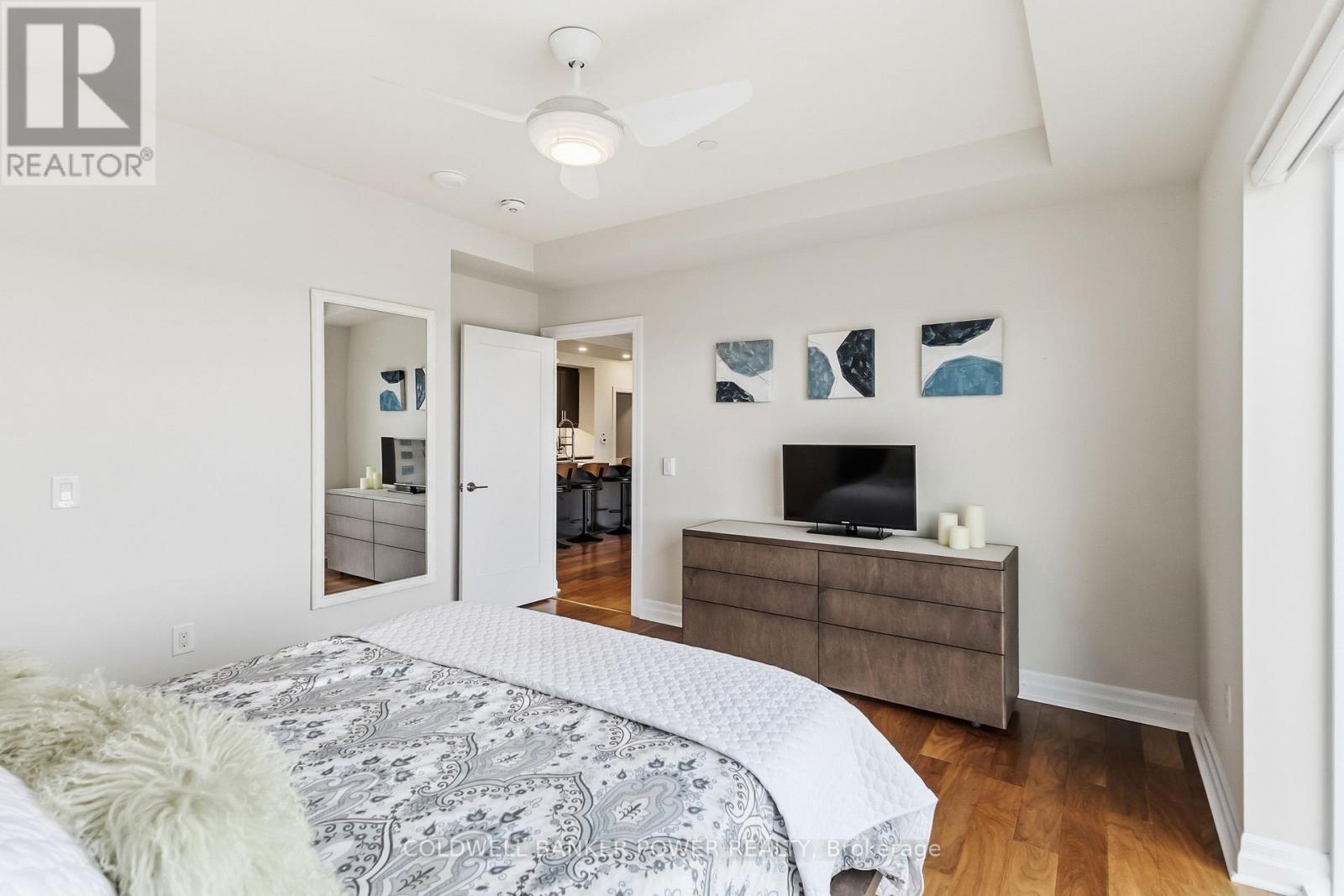 Welcome to Azure Condominiums, one of downtown London's premier luxury high-rise communities. Offering 1,615 sq. ft. of interior living space plus a 135 sq. ft. private balcony, the Madison 2H model provides the size and layout many buyers look for but rarely find in condo living. Located on the 13th floor, Suite 1309 features 2 bedrooms, a den, and 2 full bathrooms, all arranged within a highly functional floor plan designed for both everyday living and entertaining. The open living and dining space feels bright and welcoming, complemented by hardwood flooring throughout with no carpet. Extensive custom cabinetry has been thoughtfully added throughout the unit, including the dining area, hallway closet, pantry, and primary bedroom closet, maximizing storage while maintaining a clean built-in look. Just off the kitchen, a custom feature wall with a built-in wine display fridge creates a striking focal point that guests will notice right away. The den offers excellent flexibility, serving as a home office while also functioning as guest space thanks to a custom Murphy bed that allows the room to easily convert when needed. Practical features continue with 2 underground parking spaces, both equipped with EV chargers capable of fast charging and conveniently located close to the building entrance and elevators. The unit also includes a convenient and large private storage locker located on the same floor. Condo fees include heating, cooling, water, and hot water, leaving owners responsible only for personal hydro. Azure residents enjoy exceptional amenities including a 29th floor rooftop terrace with BBQs and gas fire pits, fitness centre, golf simulator, social lounge, billiards room, library, and guest suite. All of this is located in the heart of downtown London, just steps from restaurants, entertainment, parks, and major employers. A fantastic opportunity to enjoy over 1,600 sq. ft. of upgraded condo living in one of the city's most sought-after buildings. (id:64974)